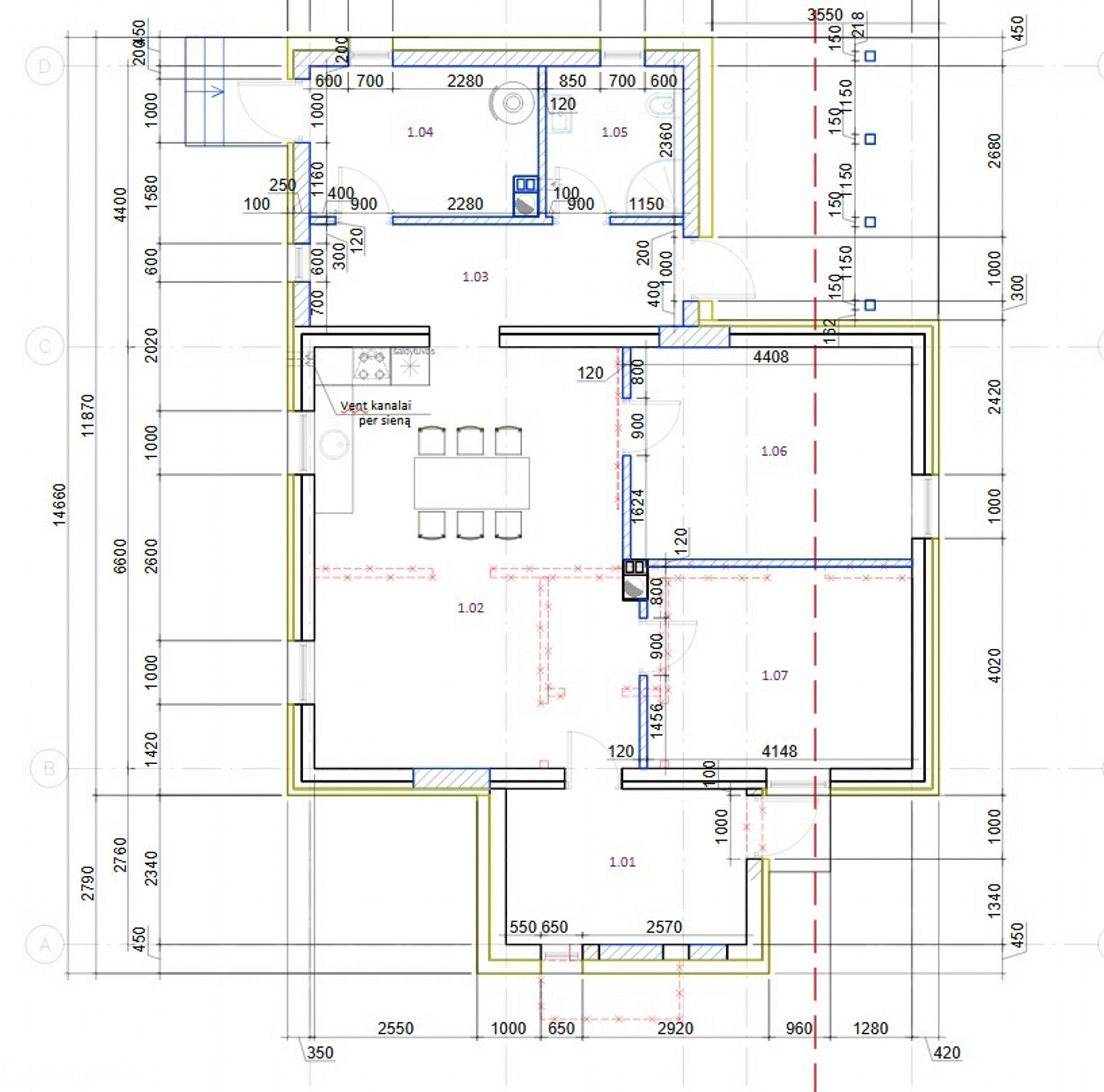 Po rekonstrukcijos planuojamas išplanavimas: tambūras, svetainė su virtuve, koridorius, katilinė, vonios kambarys ir du miegamieji.