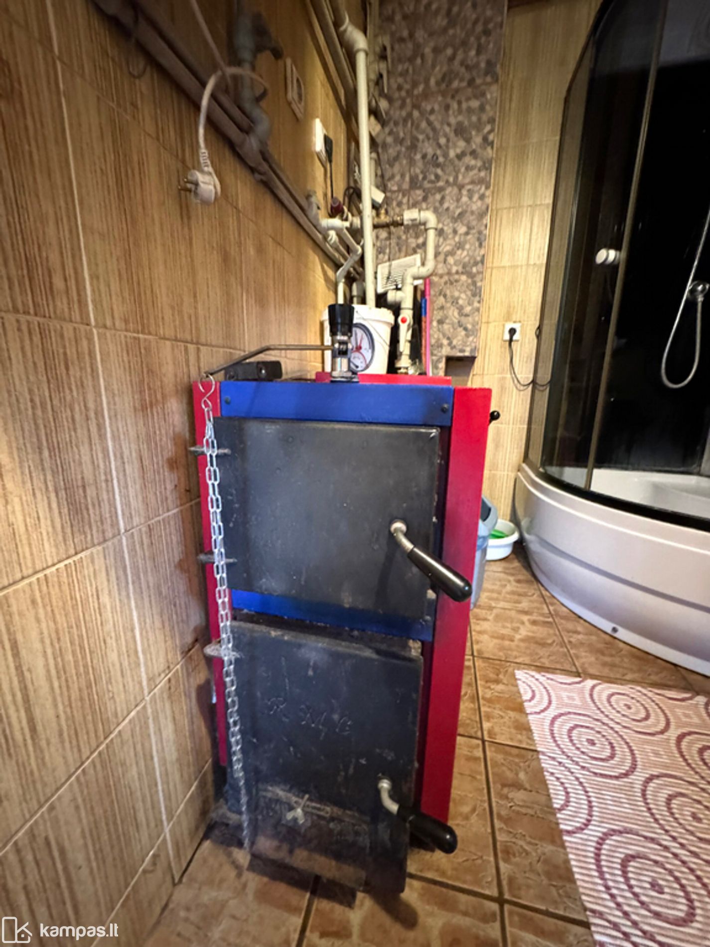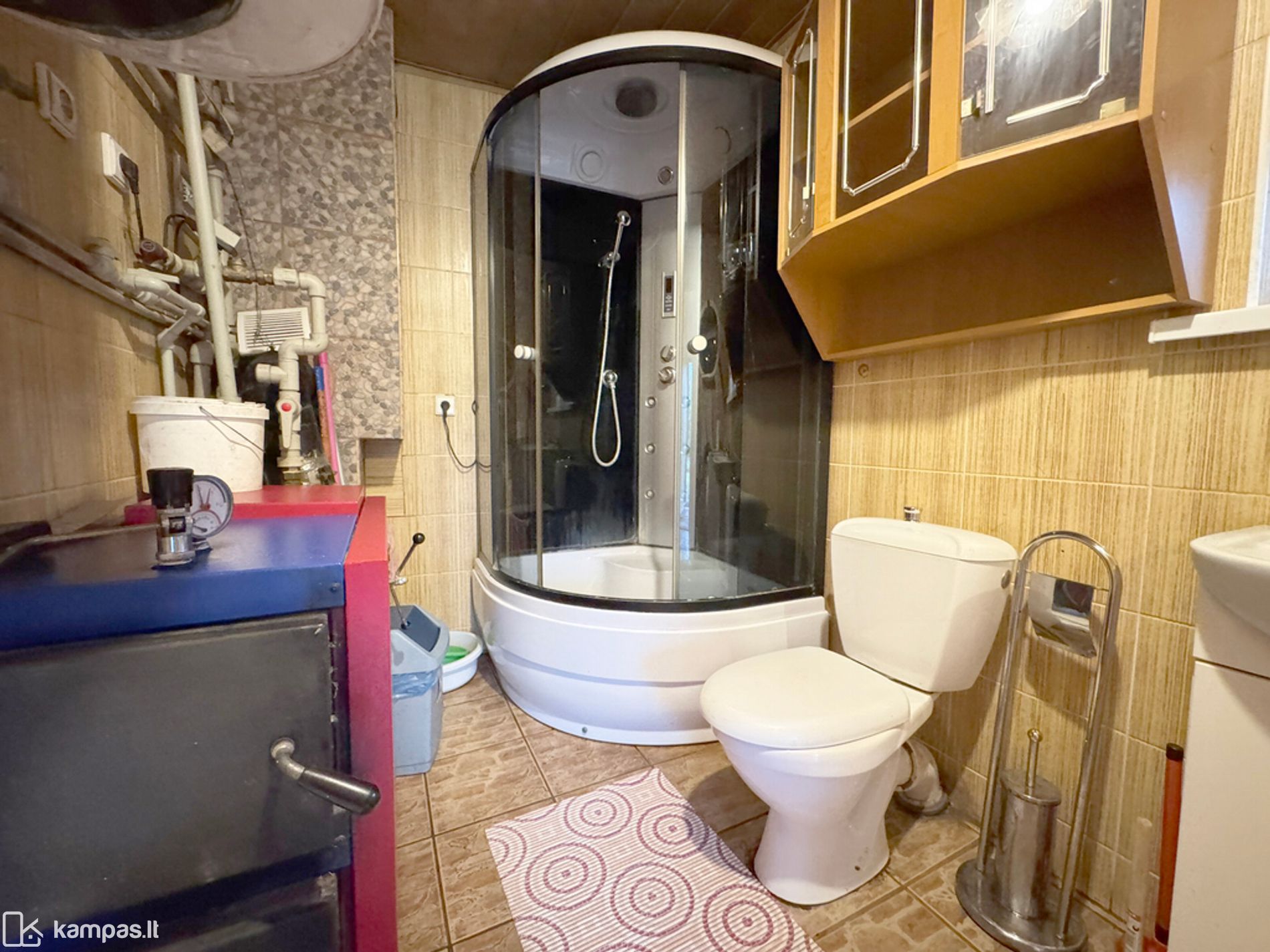 - Vonia ir WC bendroje erdvėje, vonios patalpoje pastatytas dušas, tualetas, kombinuotas boileris, kieto kuro katilas;