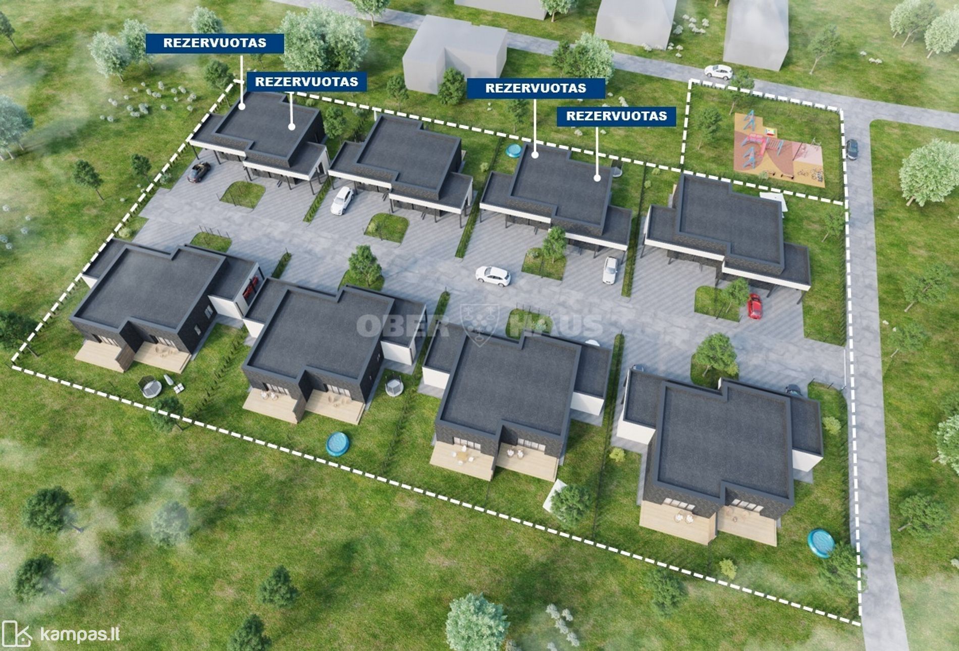 • Kvartalas aptvertas segmentine tvora su pesčiųjų taku, įrengtas privačios gatvelės apšvietimas, stebėjimo kamera, šlagbaumas, sutvarkytas gerbūvis, įvažiavimas į kiemą išklotas trinkelėmis, įrengiama trinkelių nuogrinda aplink namą, apie 800 m² bendra poilsio zona su vaikų žaidimų aikštelė;