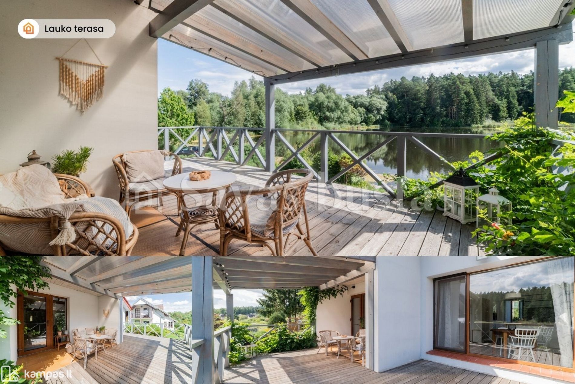 * Erdvi medinė terasa–balkonas su vaizdu į tvenkinį ir mišką (dalinai dengta)