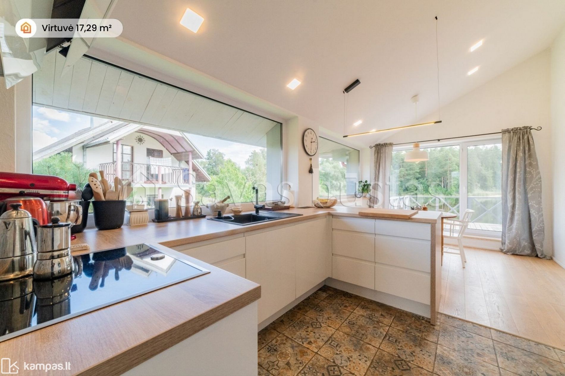 * Dideli virtuvės ir svetainės langai su vaizdu į tvenkinį ir mišką