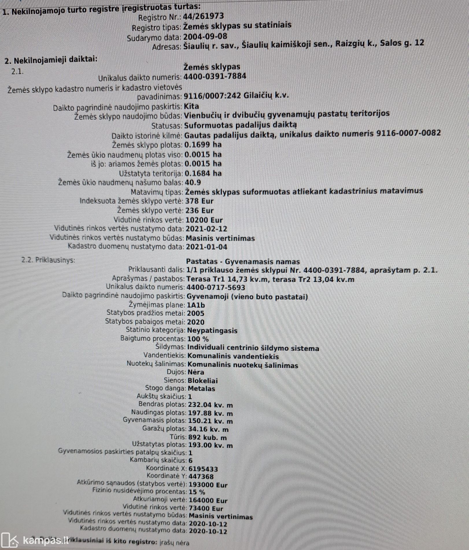 Namas yra 2008 m. statybos, paskutinė registracija kadastro duomenų Registrų centre yra atlikta 2020 m.
