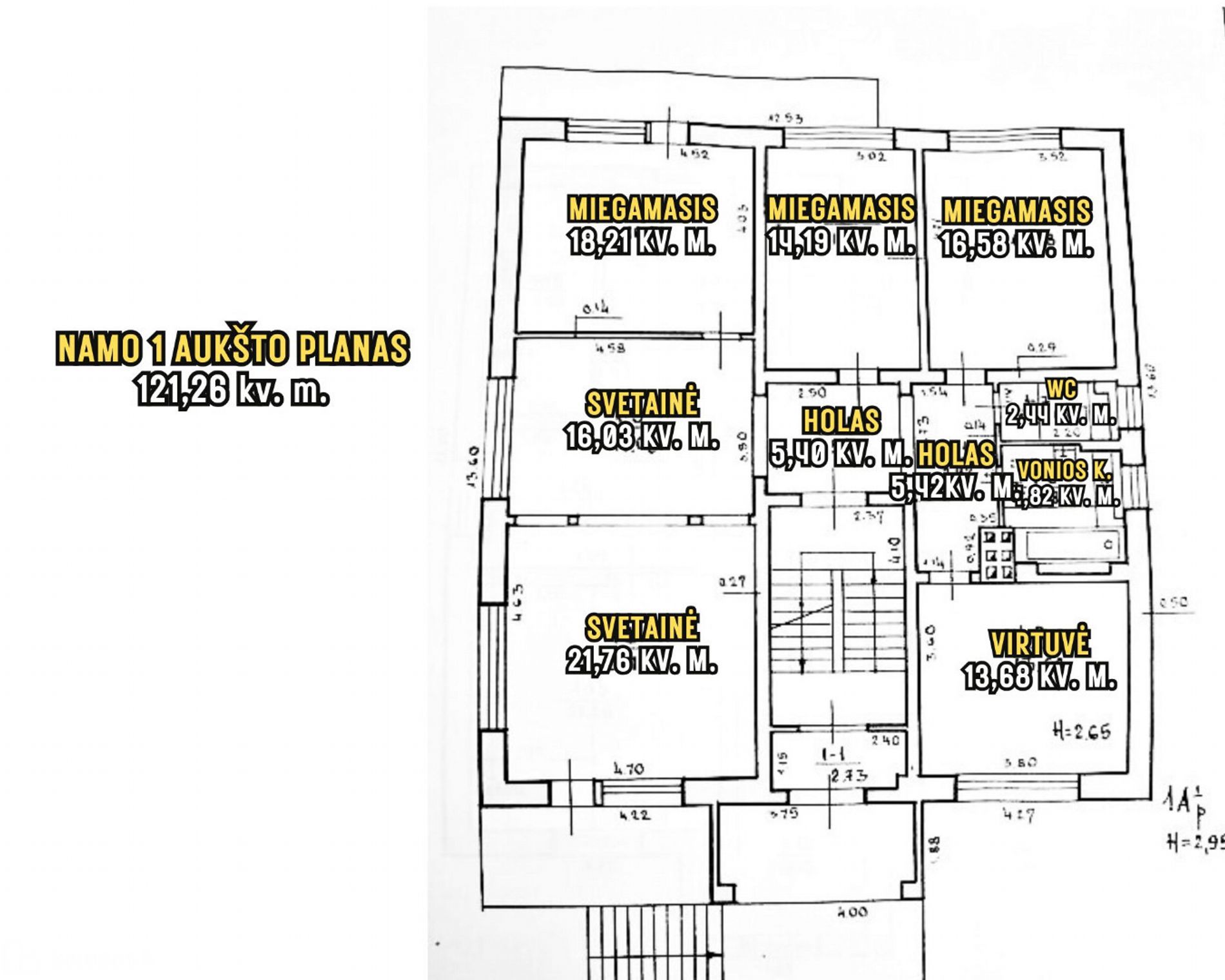 • Pirmas aukštas turi erdvų holą, svetainė su išėjimu į balkoną, 3 miegamuosius kambarius, vienas iš jų su išėjimu į balkoną, virtuvė, WC ir vonios kambarys.