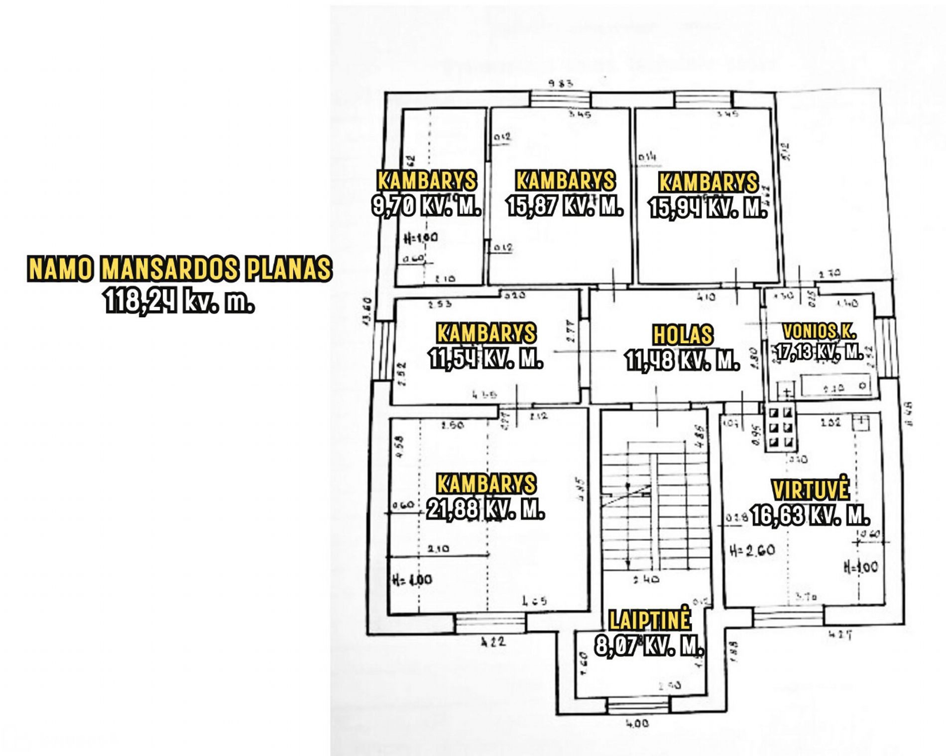 • Mansardoje keturi kambariai, virtuvė, vonios kambarys.