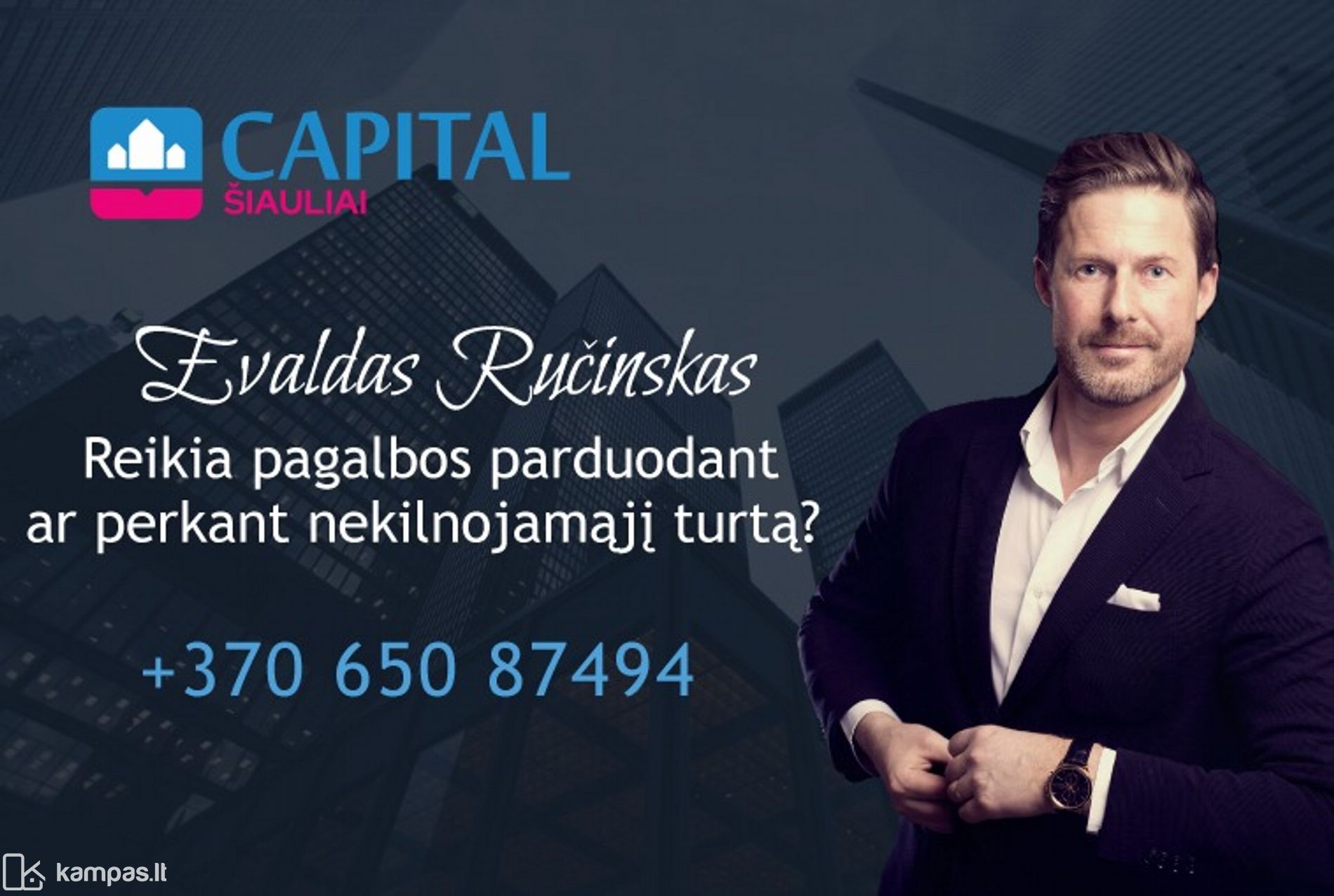 Jeigu planuojate PARDUOTI nekilnojamąjį turtą ar reikalinga kita pagalba nekilnojamojo turto PAVELDĖJIMO, VERTINIMO, KREDITAVIMO, STATYBOS ar vidaus ĮRENGIMO klausimais - drąsiai skambinkite - padėsiu Jums visada! Visus naujausius CAPITAL nekilnojamojo turto skelbimus rasite mūsų internetiniame puslapyje www.capital.lt. Kviečiame apsilankyti!