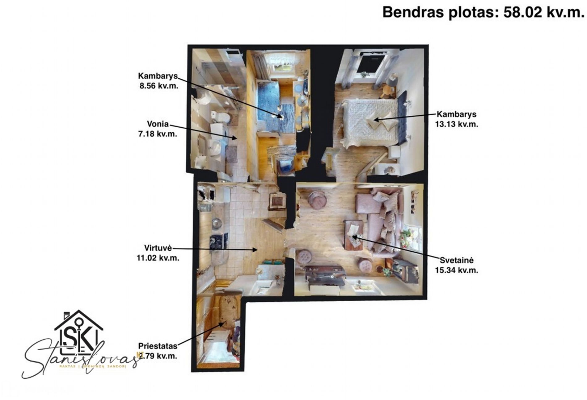 • Bendras plotas: 58.02 kv. m (savininkui priklausanti dalis 5802/13756 arba 58.02 kv.m iš 137.56 kv.m);