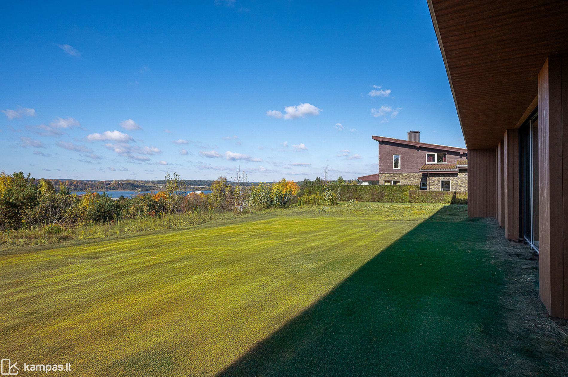 Vieno aukšto namas suprojektuotas ant šlaitinio sklypo, todėl pro dideles pietvakarių kryptimi orientuotas vitrinas atsiveria neužstatomi ežero vaizdai ir kasdieniai saulėlydžiai. Erdvi svetainė natūraliai susilieja su terasa, o stogo terasa suteikia dar vieną jaukią poilsio zoną su galimybe įrengti žaliąją erdvę.