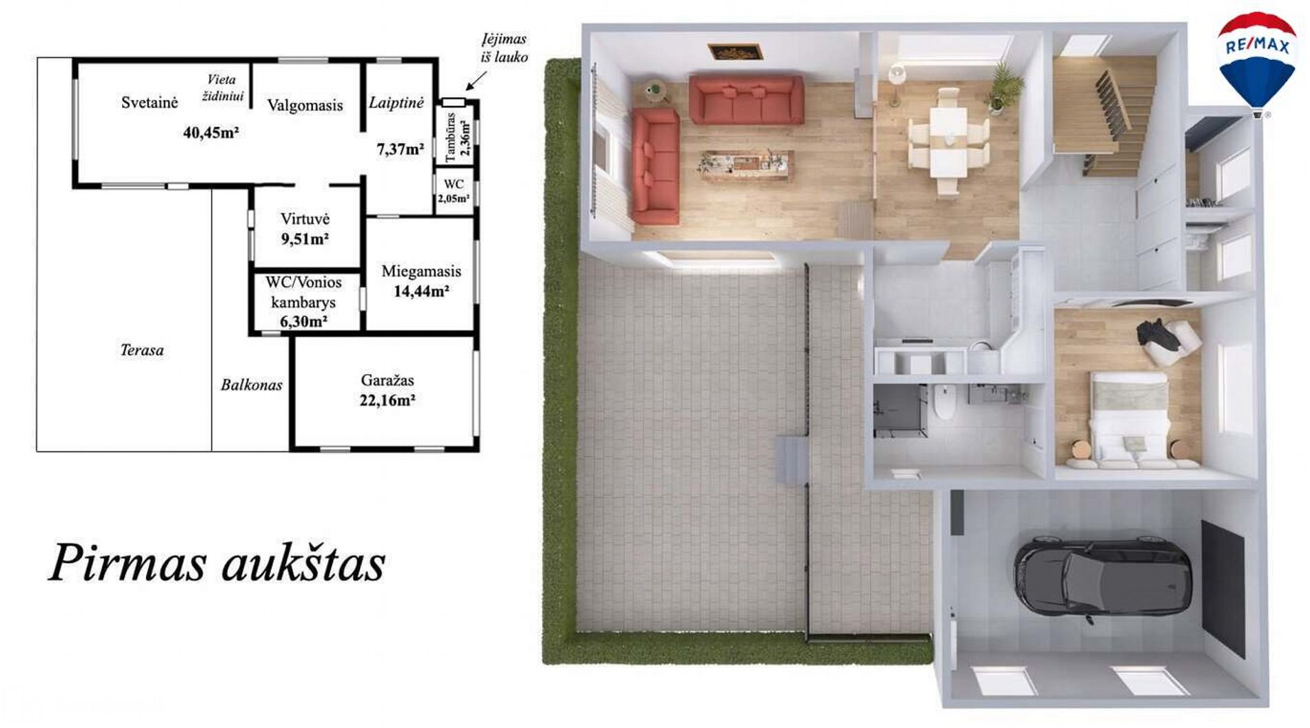- Garažo plotas – 22,16 kv. m (talpina vieną automobilį);