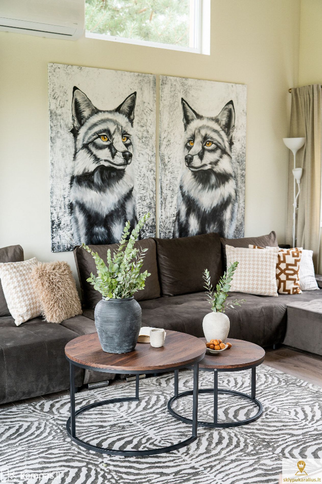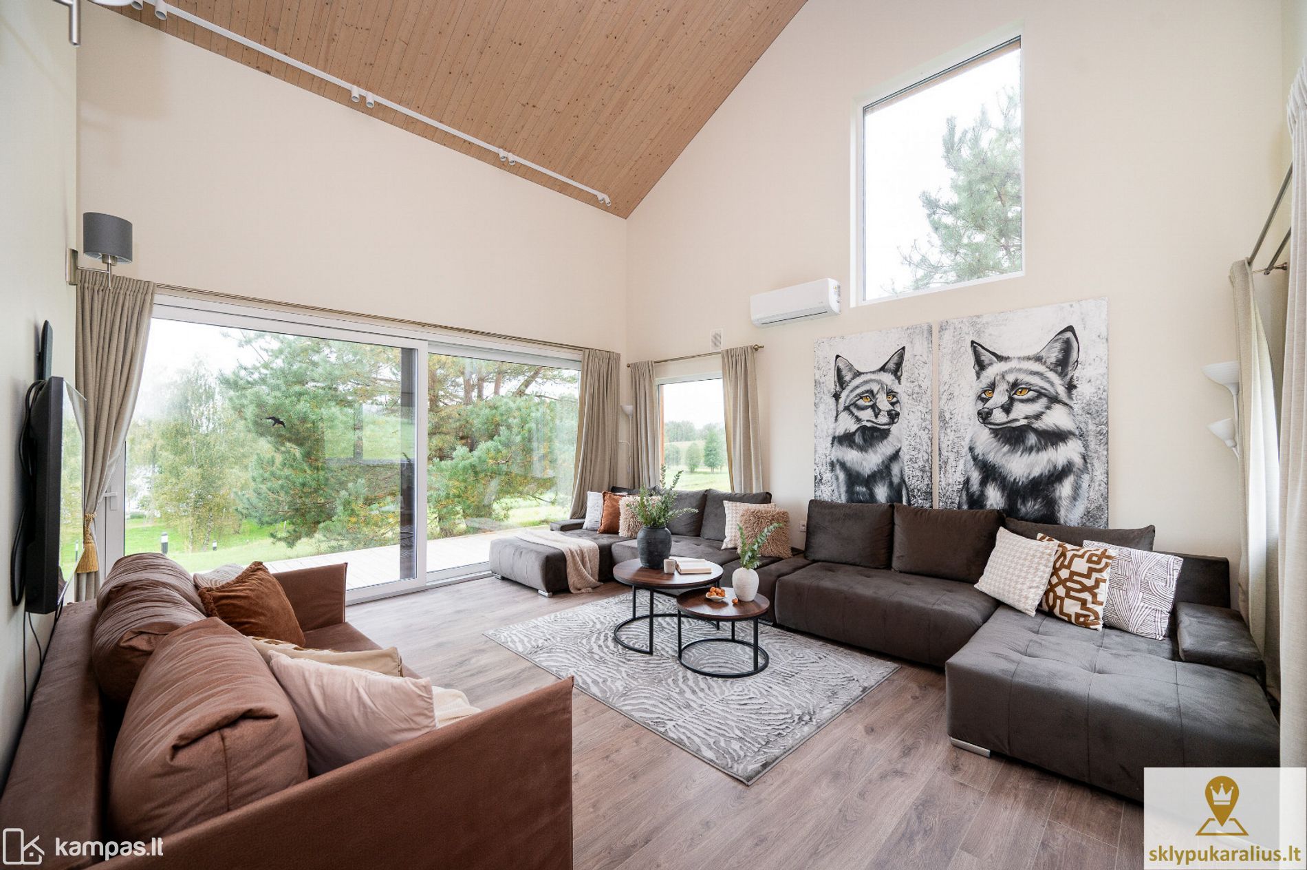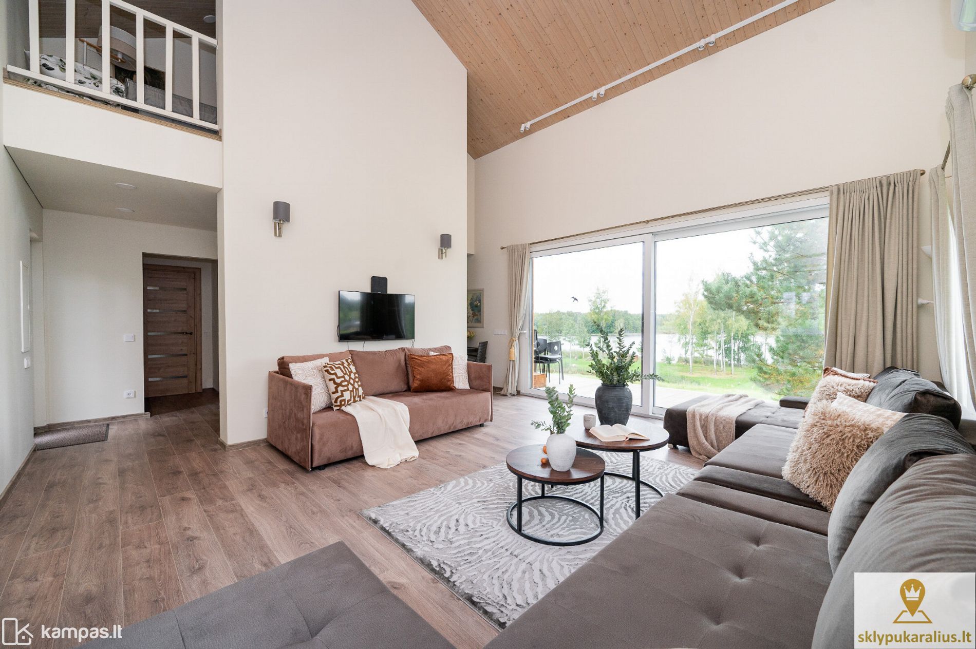 • Svetainė su itin aukštomis lubomis ir vitrininiais langais į ežerą