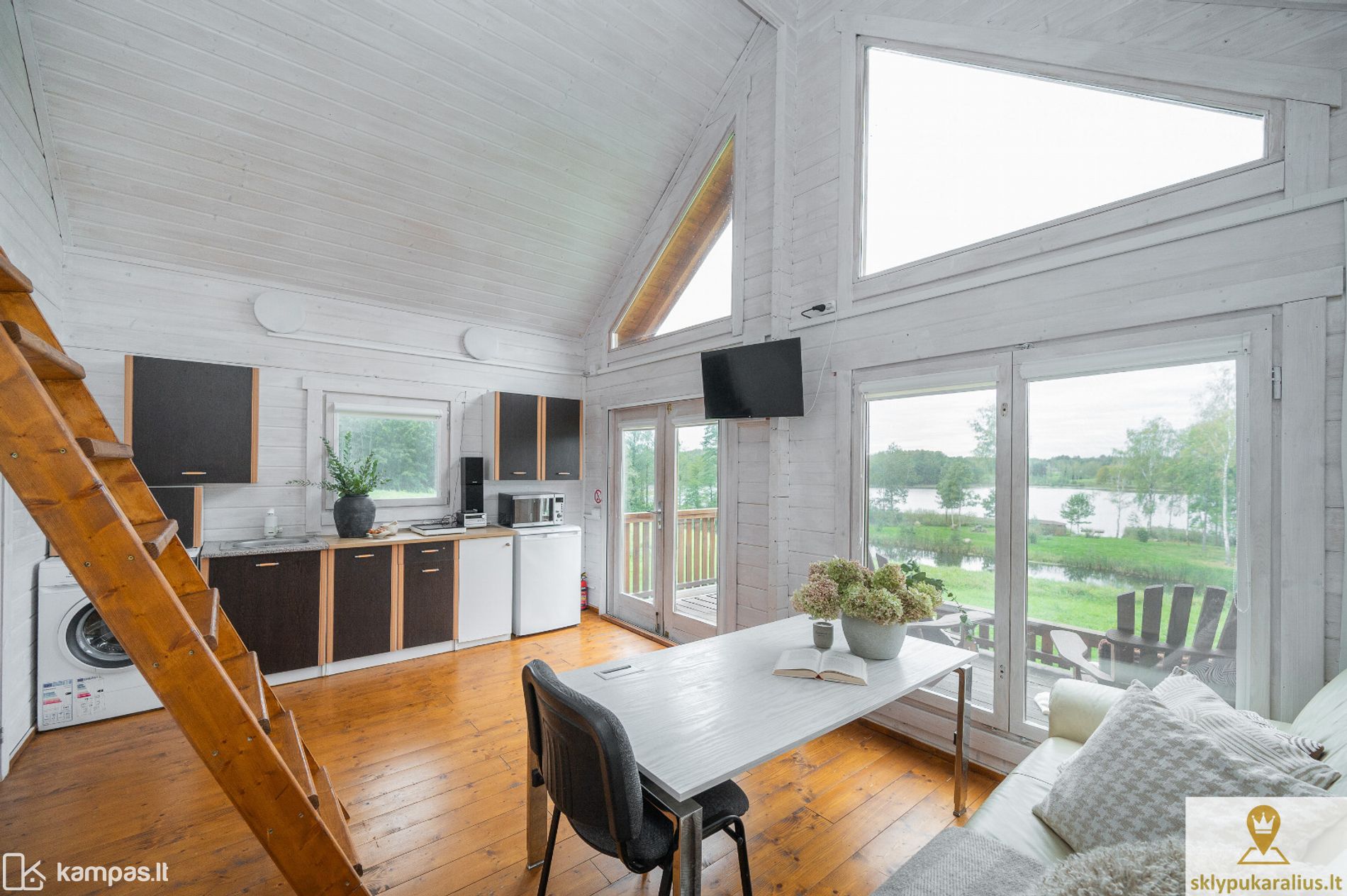 • Svečių namelis (31 kv.m.) su atskira virtuvėle, miegamomis vietomis antresolėje, WC ir dušu, su terasa į ežerą
