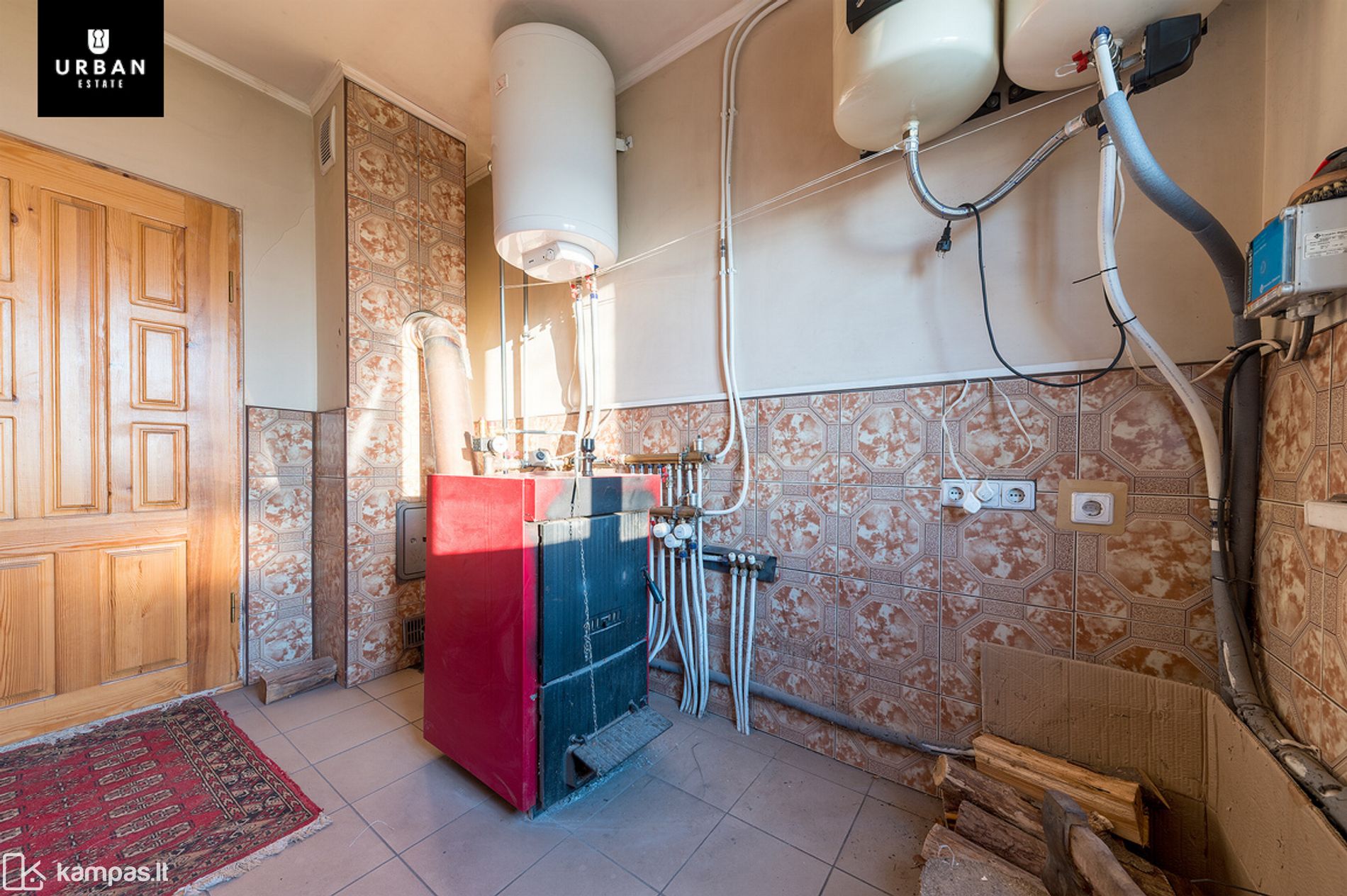 Šildymas kietu kuru, kambariuose radiatoriai, virtuvės zonoje, hole ir WC šildomos grindys.