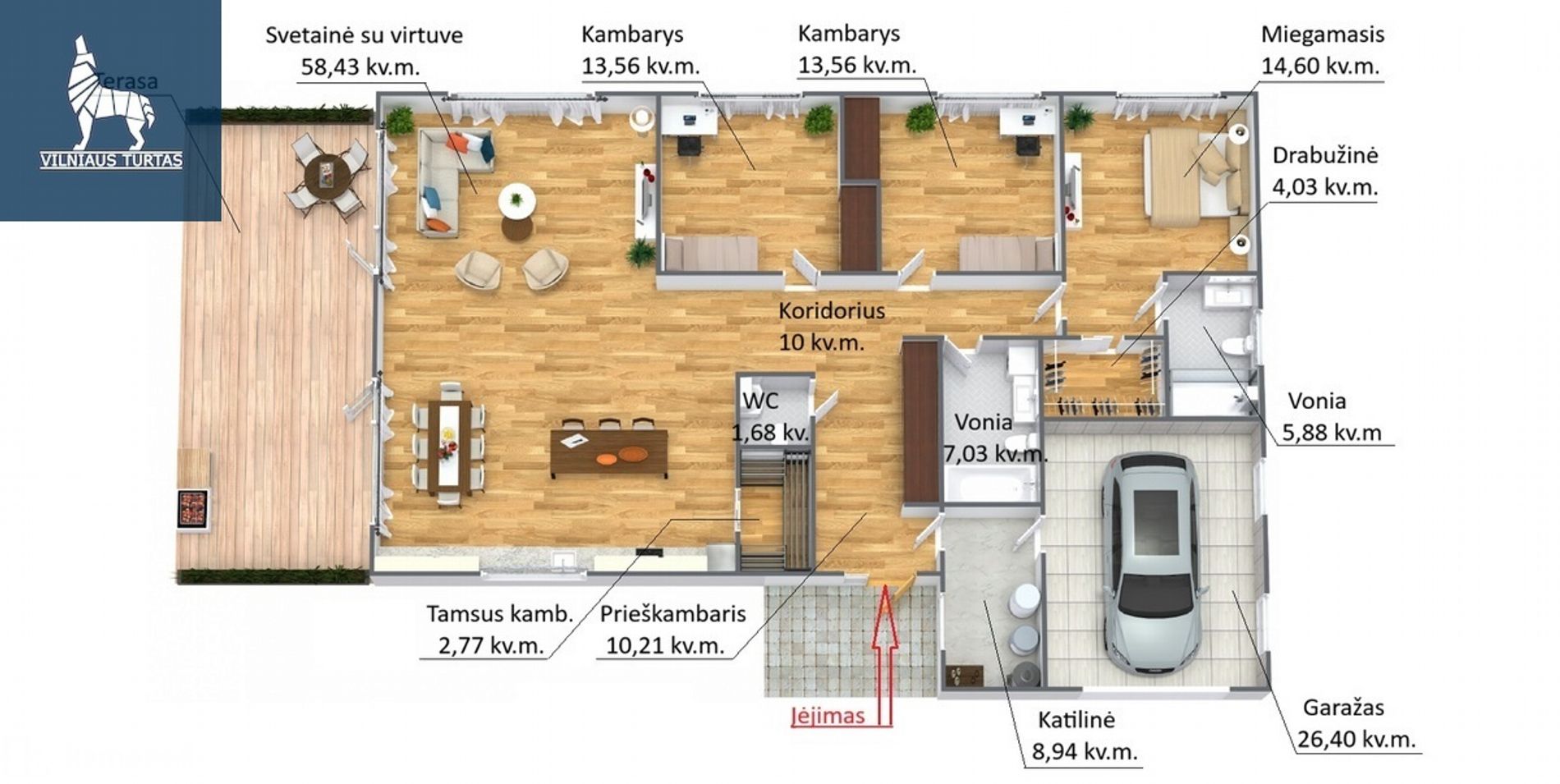 • Taip pat: 2 san. mazgai, rūbinė, sandėliukas–katilinė, garažas, erdvi terasa po stogu