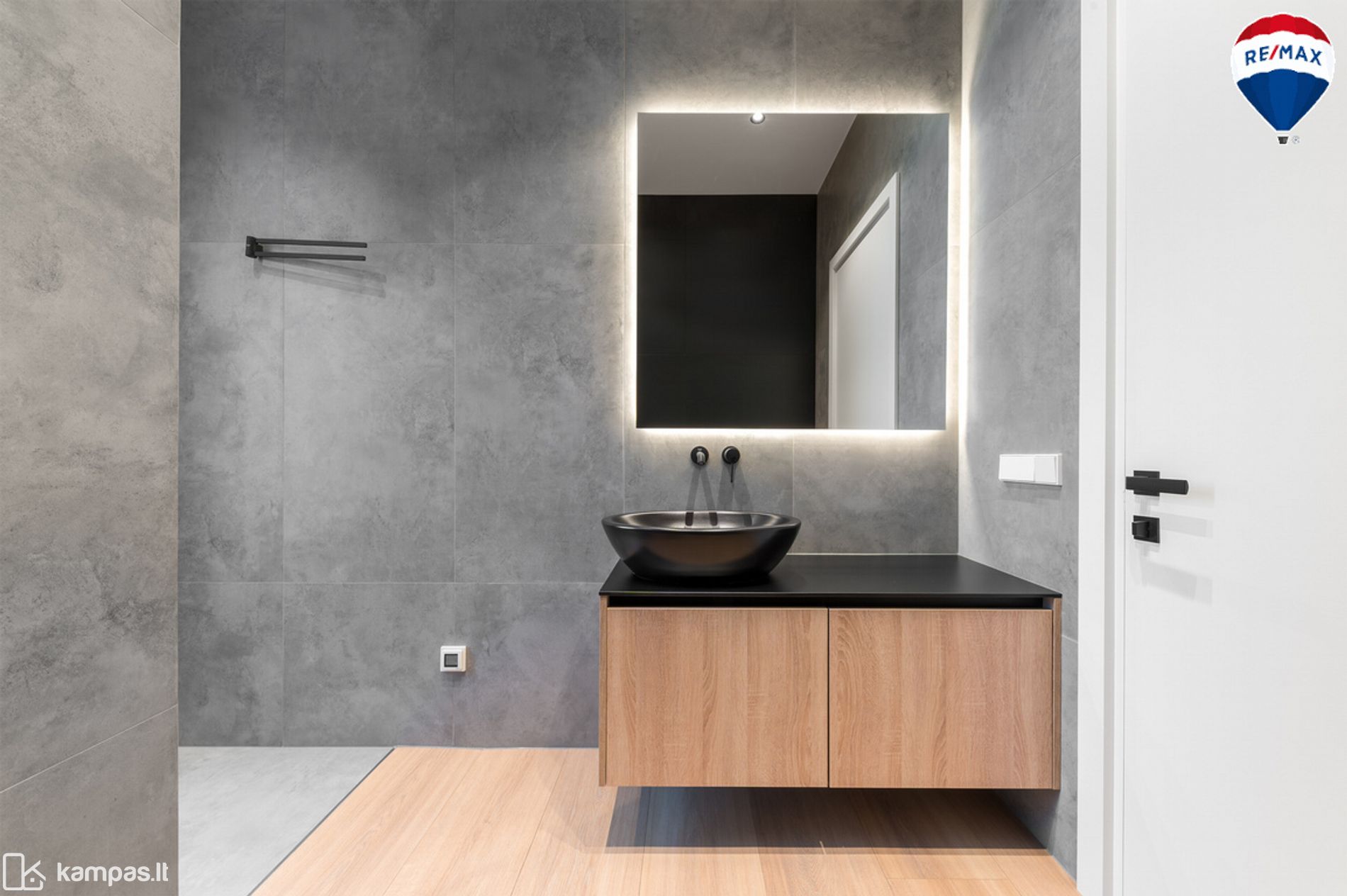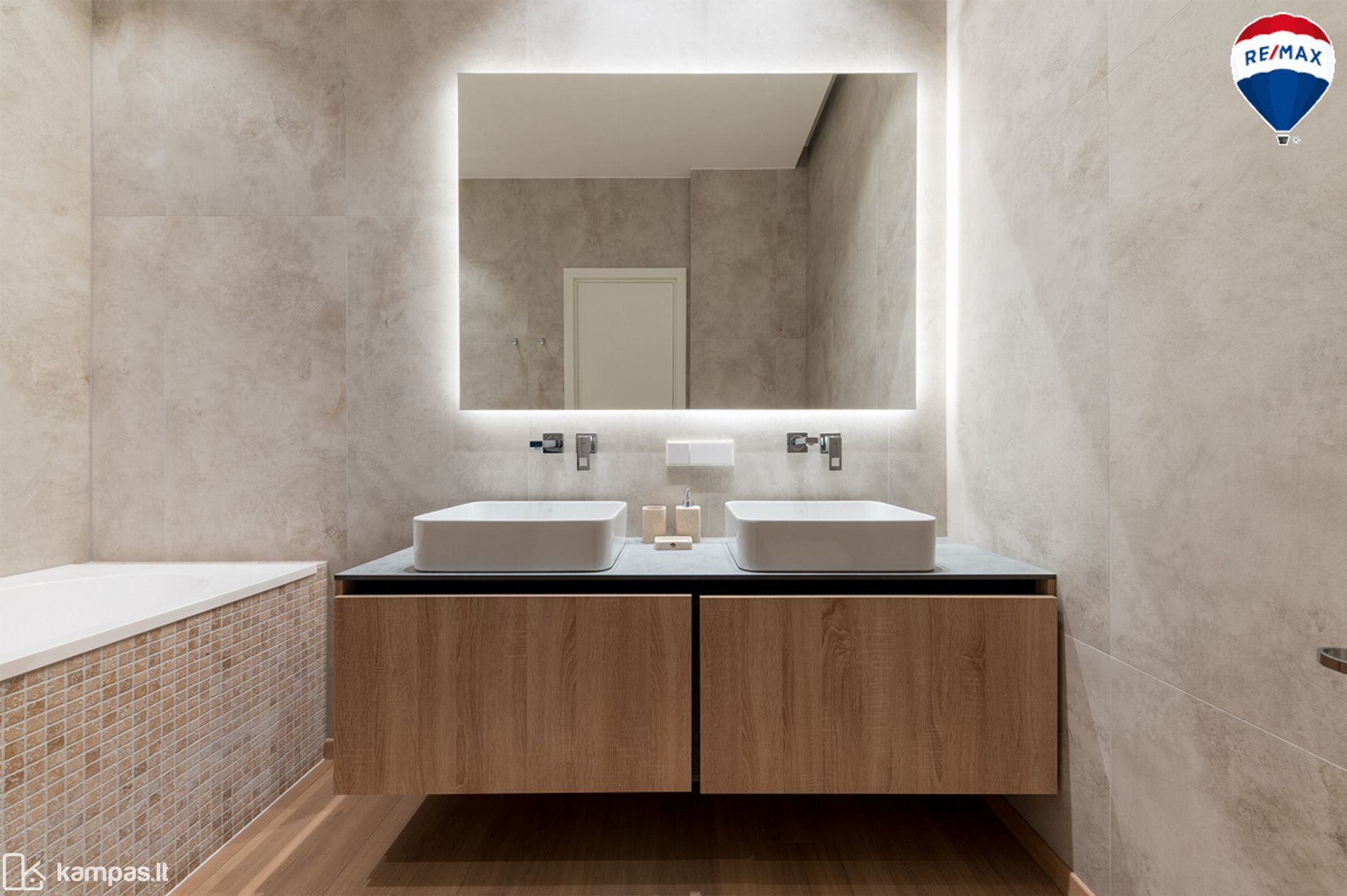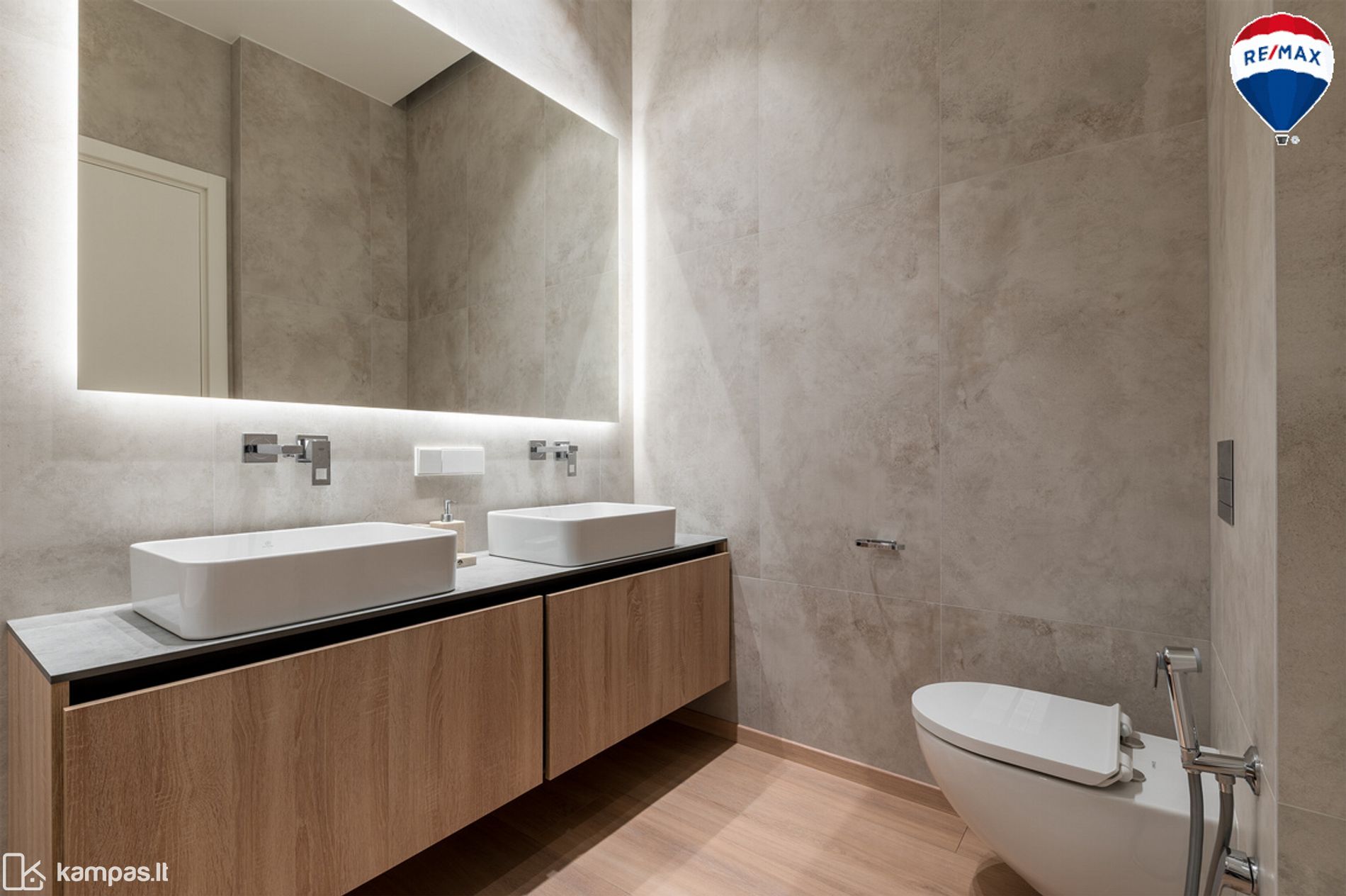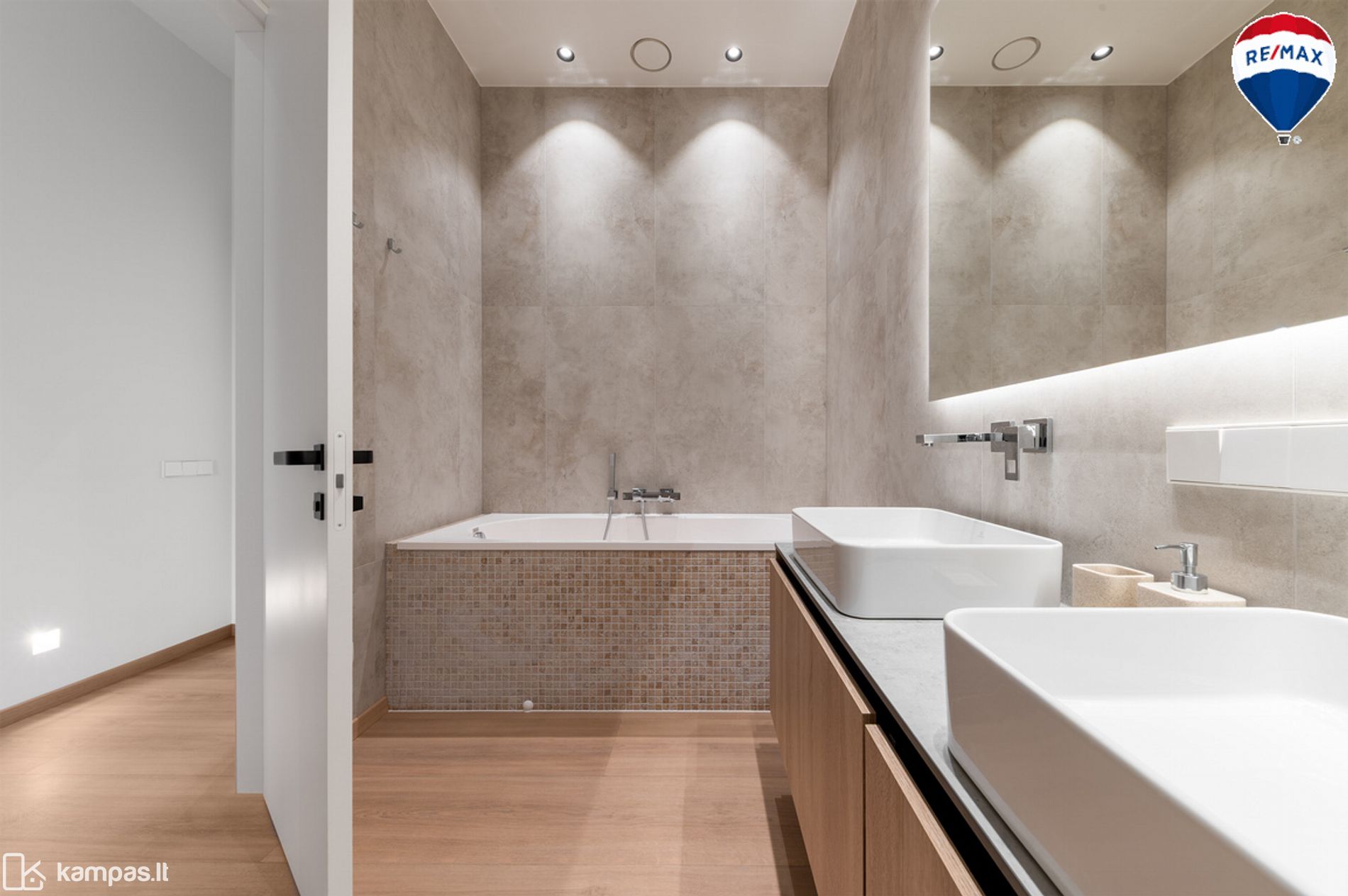 - Vonios kambariai - San. prietaisai: praustuvų maišytuvai ir dušo maišytuvas potinkiniai Grohe, vonia Vispool. Vonios maišyutvas Grohe. WC rėmai Tece, kokybiški, patvarūs, metaliniai nuleidimo mygtukai. Kiekvienam san. mazge yra šildomos sienos džiovinimui, kilimėliai su termostatais Devi.