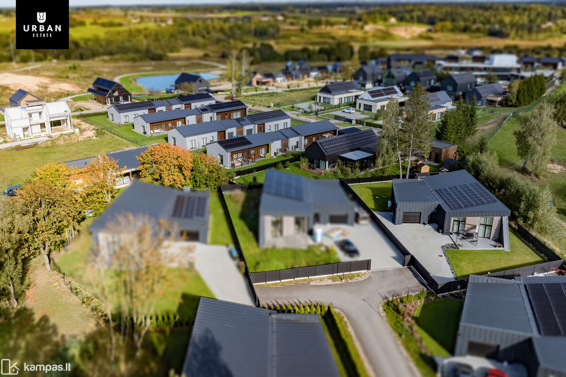- Aplink įsikūrusi solidi gyvenamųjų namų kaimynystė, į kurią patekimas per pakeliamą užkardą. Patogus privažiavimo kelias iki pat namo teritorijos.