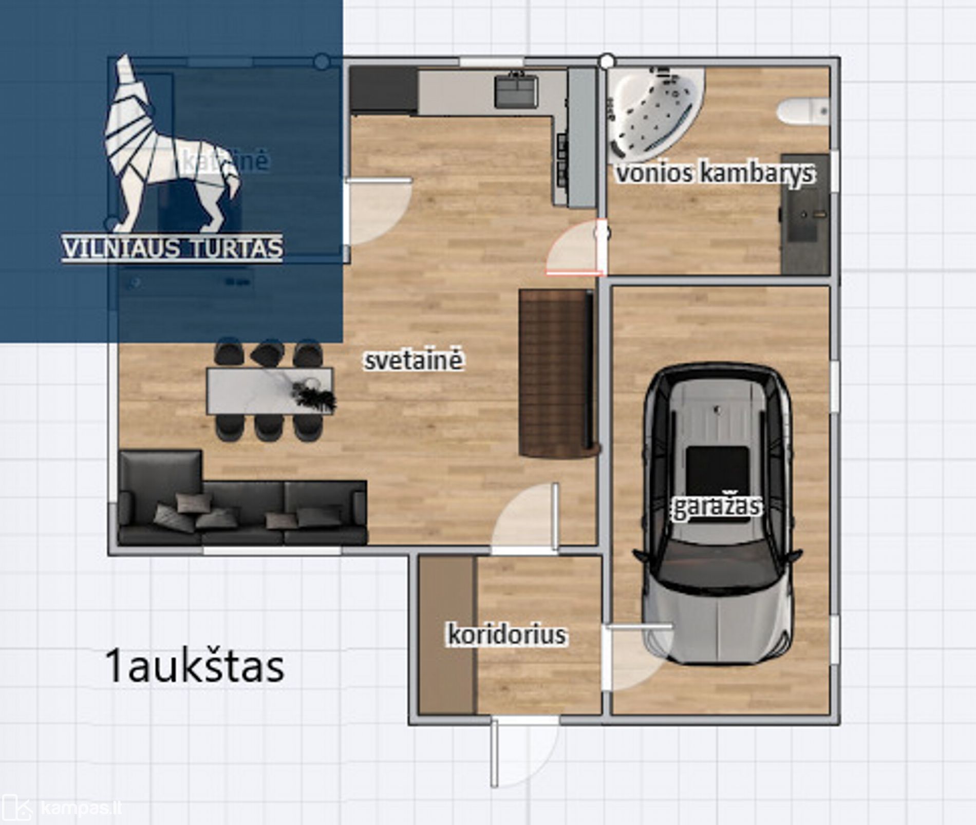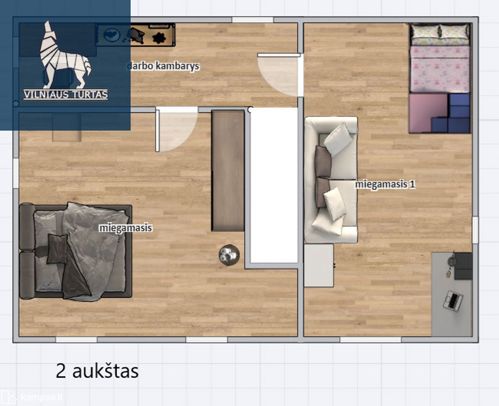 – Kambarių skaičius – 4 (svetainė, sujungta su virtuve 1 aukšte, du miegamieji 2 aukšte, darbo kambarys 2 aukšte).