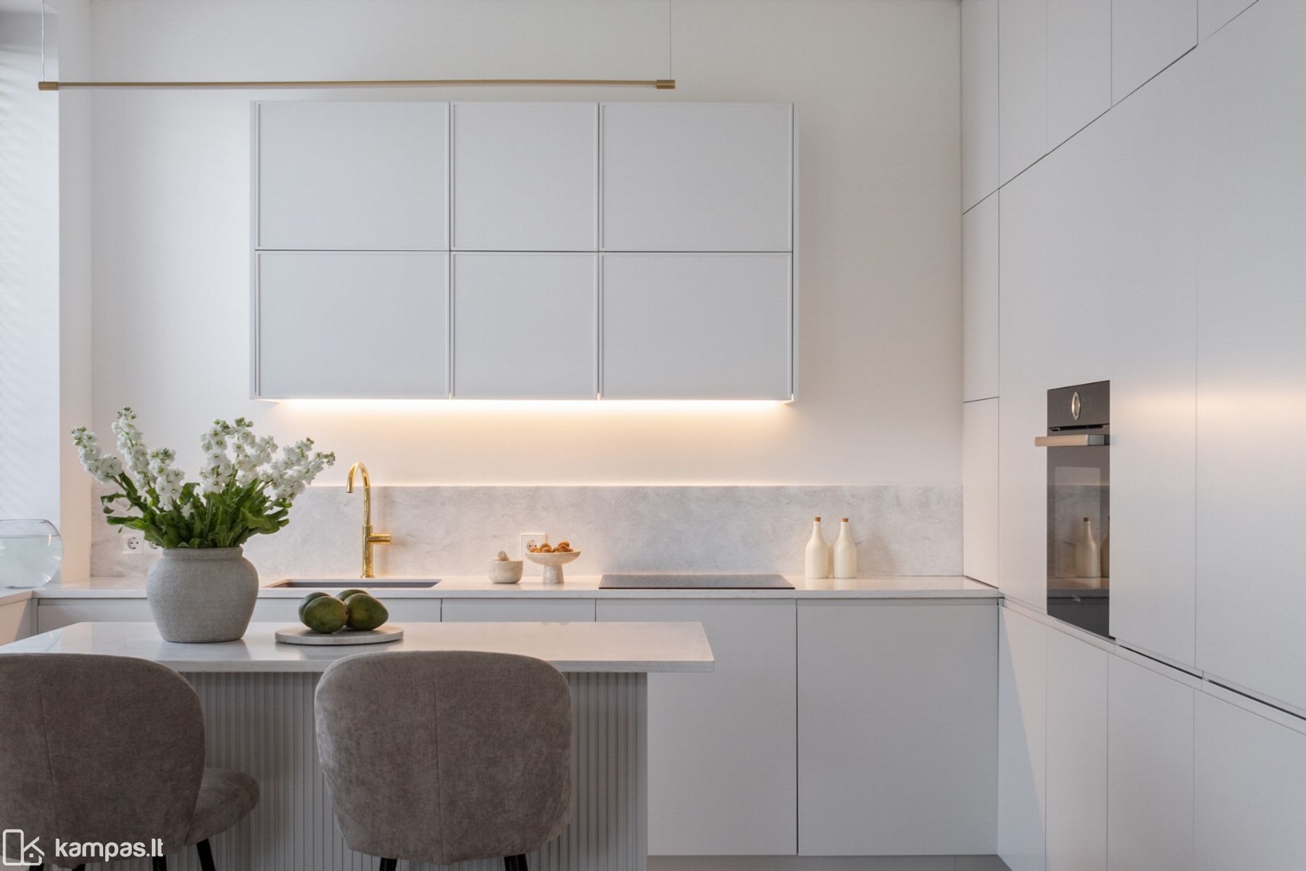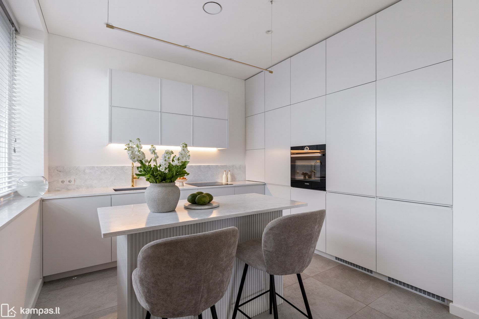 - Išskirtinio dizaino virtuvė su sala ir atskira valgomojo zona – tai namų širdis, pritaikyta tiek kasdieniam šeimos gyvenimui, tiek svečių priėmimui. „Open space“ sprendimas leidžia patogiai judėti tarp erdvių, o aukštos kokybės integruota buitinė technika, elegantiški akmeniniai stalviršiai bei prabangūs šviestuvai suteikia virtuvei išskirtinumo.