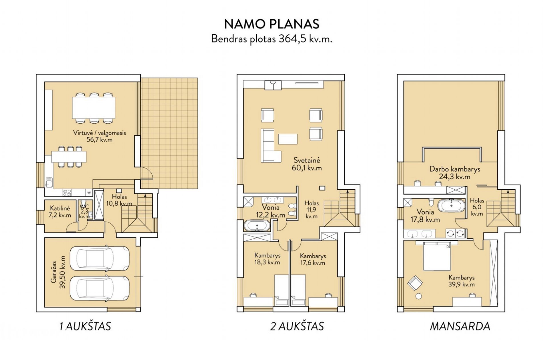 Miegamasis, vonios kambarys ir galima darboarba poilsio erdvė.