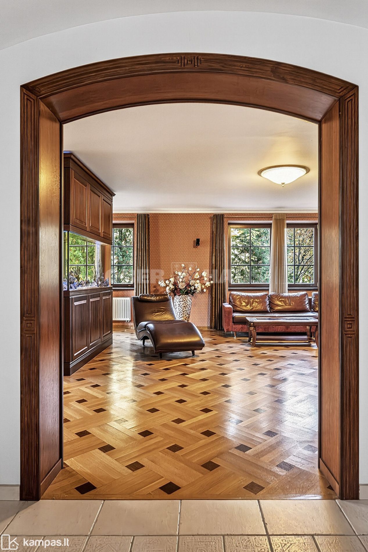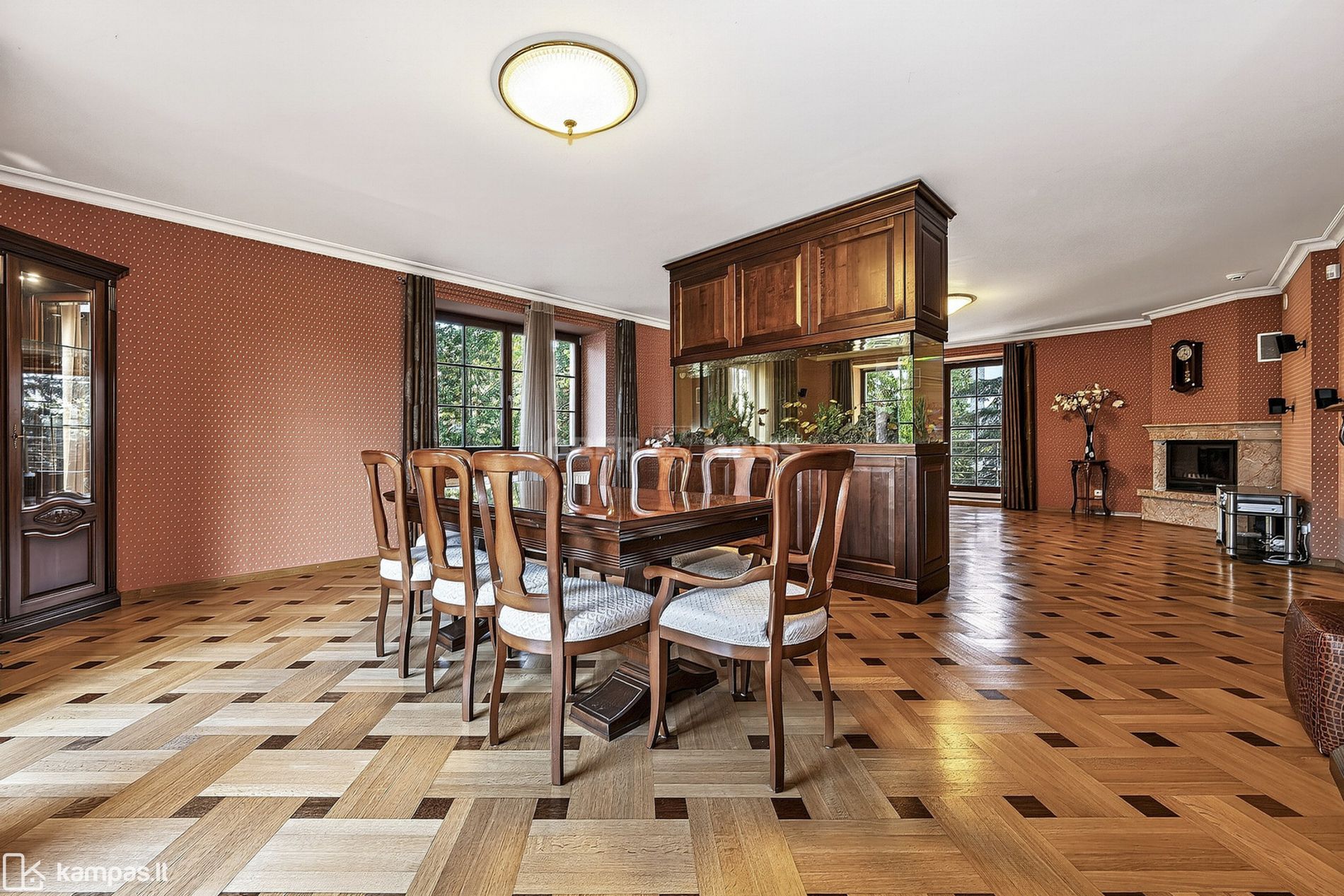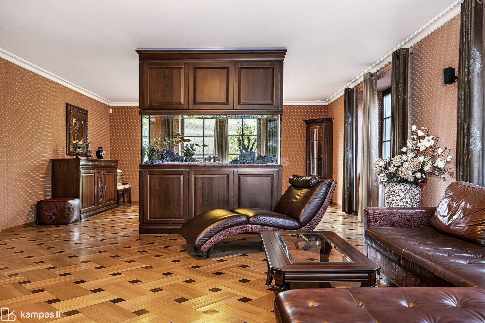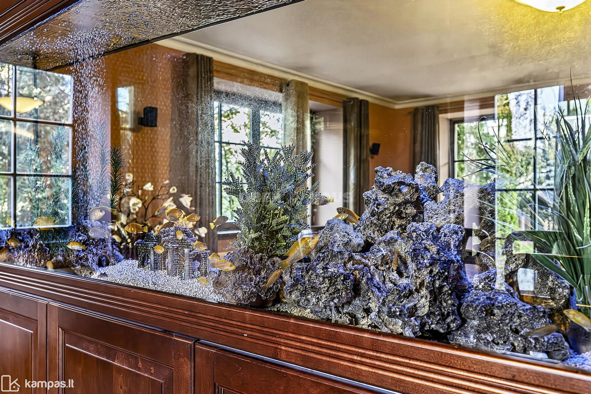 Unikalus akcentas: name įrengtas didžiulis akvariumas, suteikiantis erdvėms ypatingo jaukumo ir ramybės.