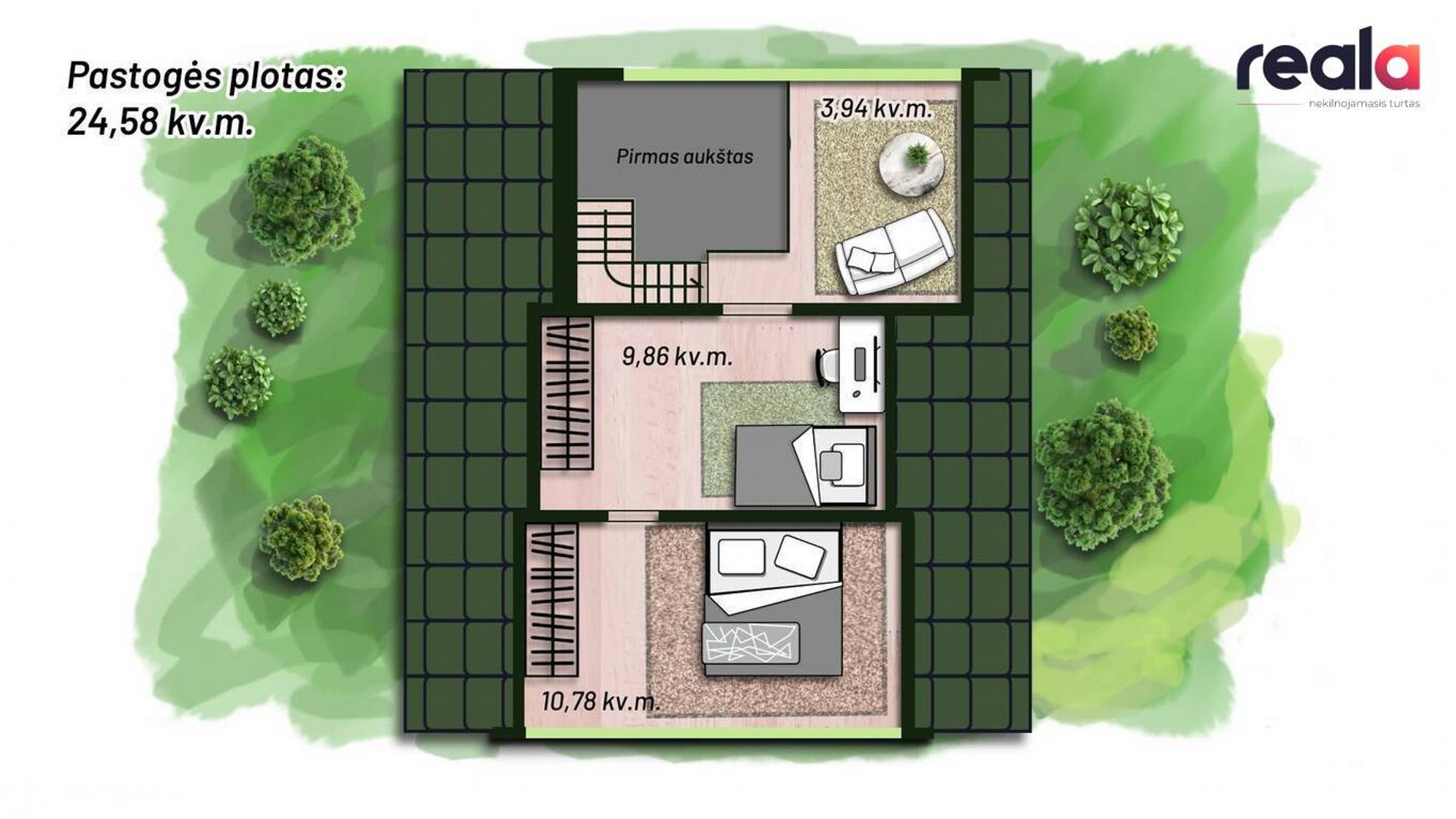 - Kambarių skaičius: 3 + virtuvę. Pirmame aukšte svetainės kambarys su židiniu, virtuvė ir WC kambarys. Pastogėje du miegamieji kambariai ir darbo ar kitos veiklos kambarys pagal poreikį.