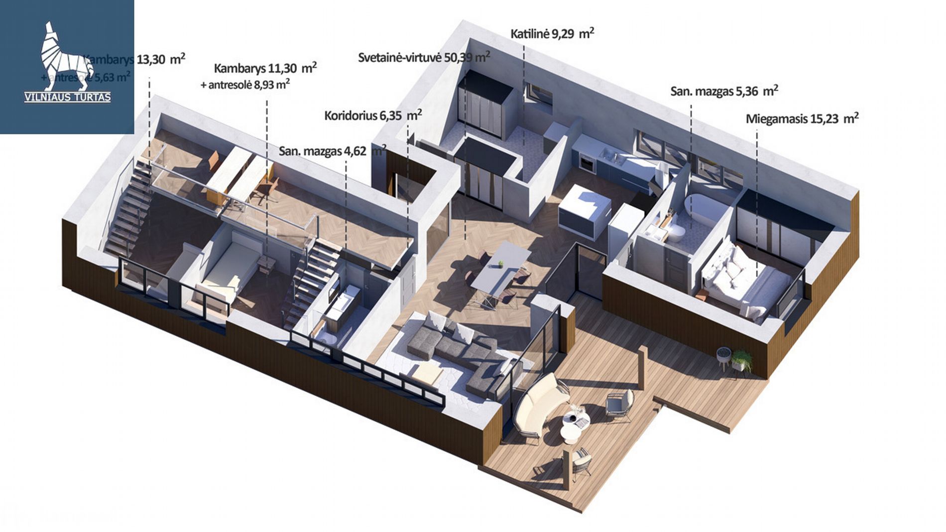 • Kambariuose įrengta antresolė, suteikianti papildomos erdvės ir architektūrinio išskirtinumo