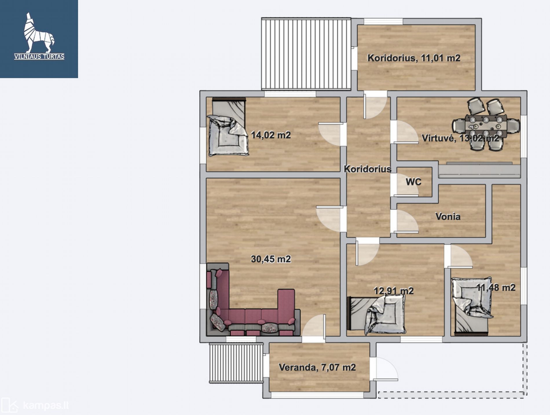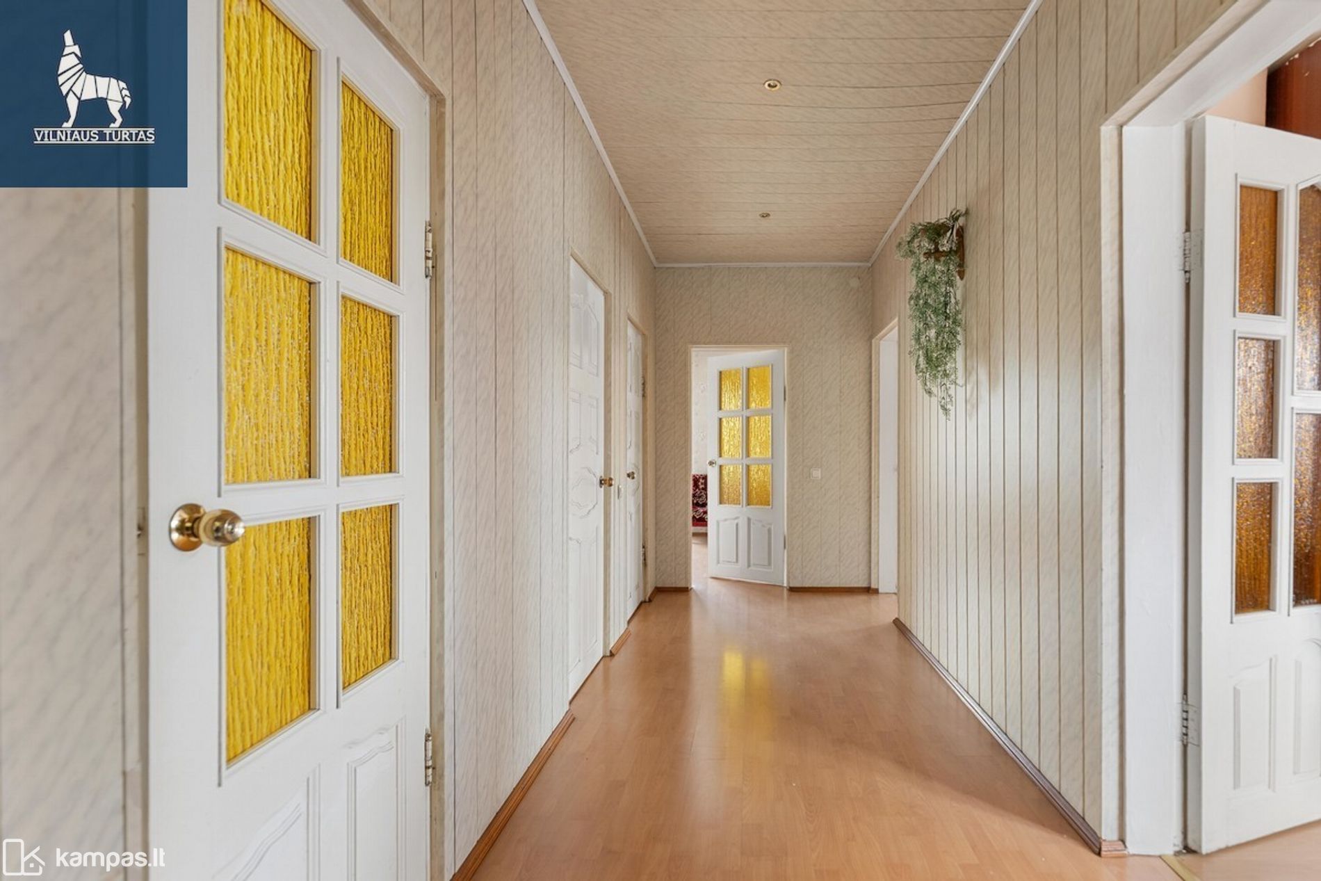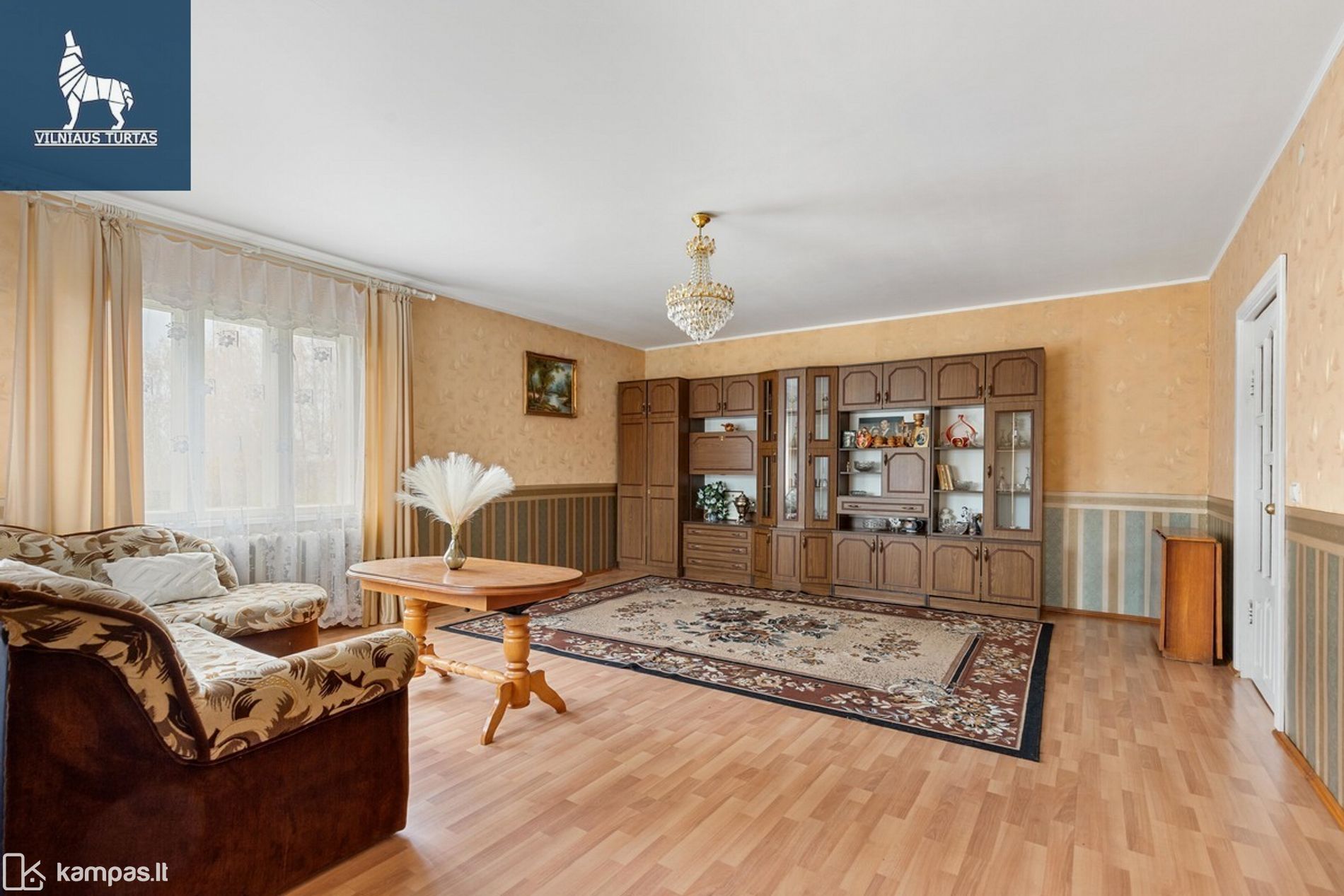 – 1 aukšte: erdvi svetainė su išėjimu į kiemą, virtuvė, 3 kambariai, koridorius, tualetas, vonia.