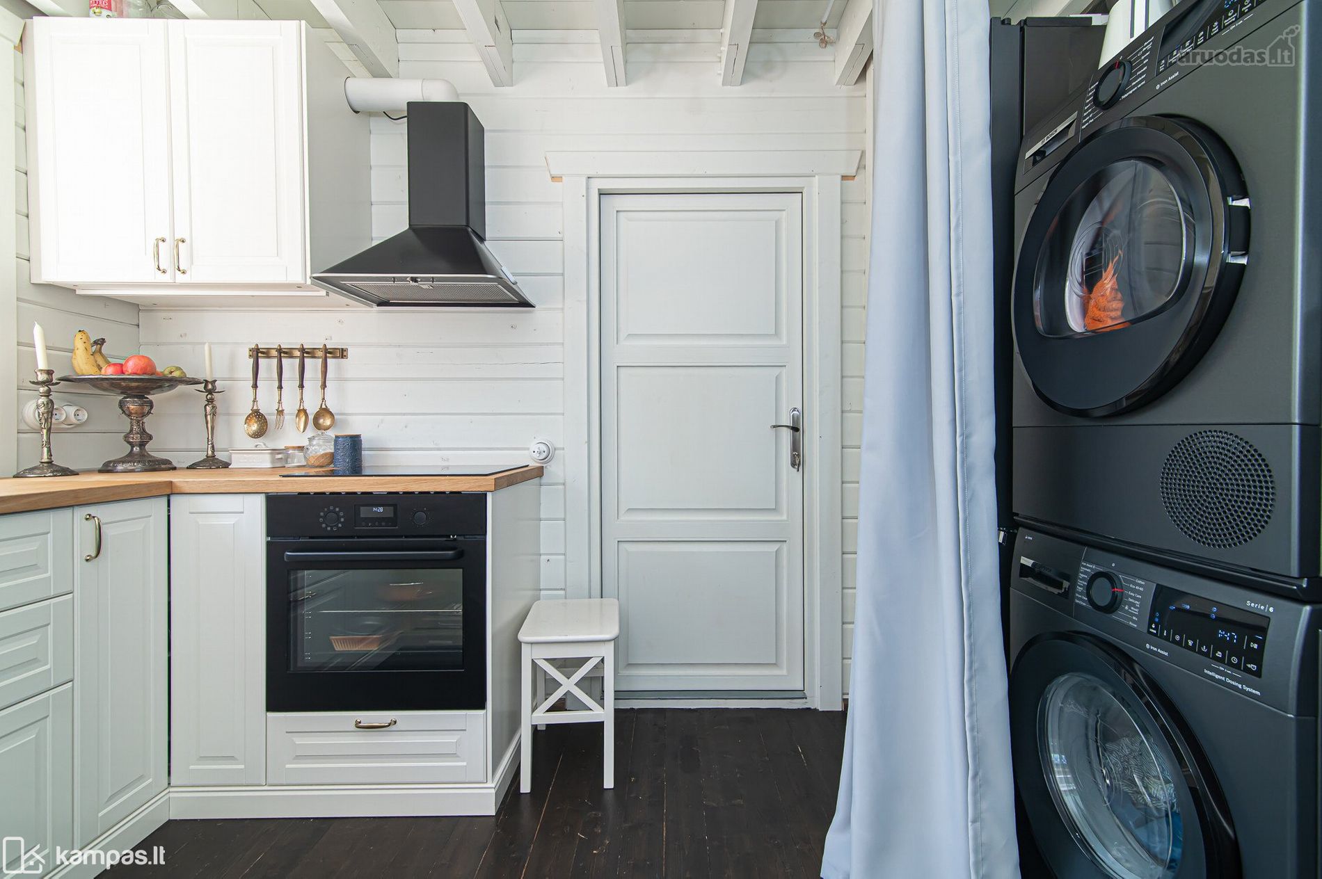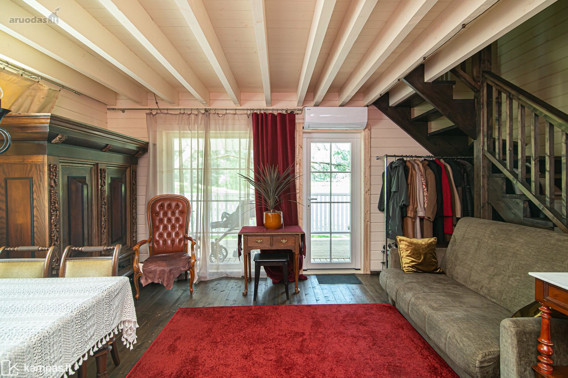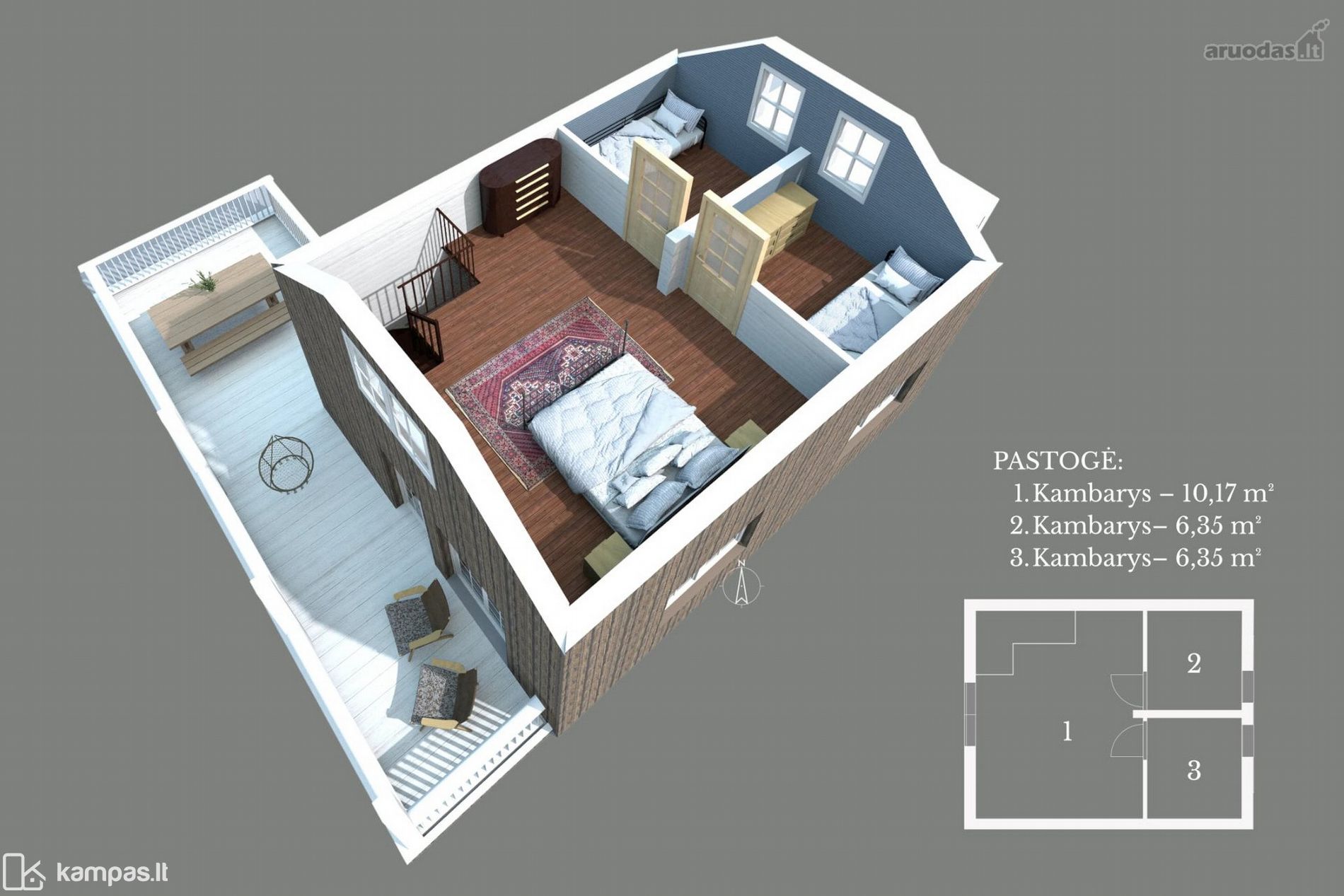 • Pilnai įrengtas – apačioje kambarys, virtuvė, vonios kambarys, pastogėje – erdvus holas ir 2 atskiri miegamieji