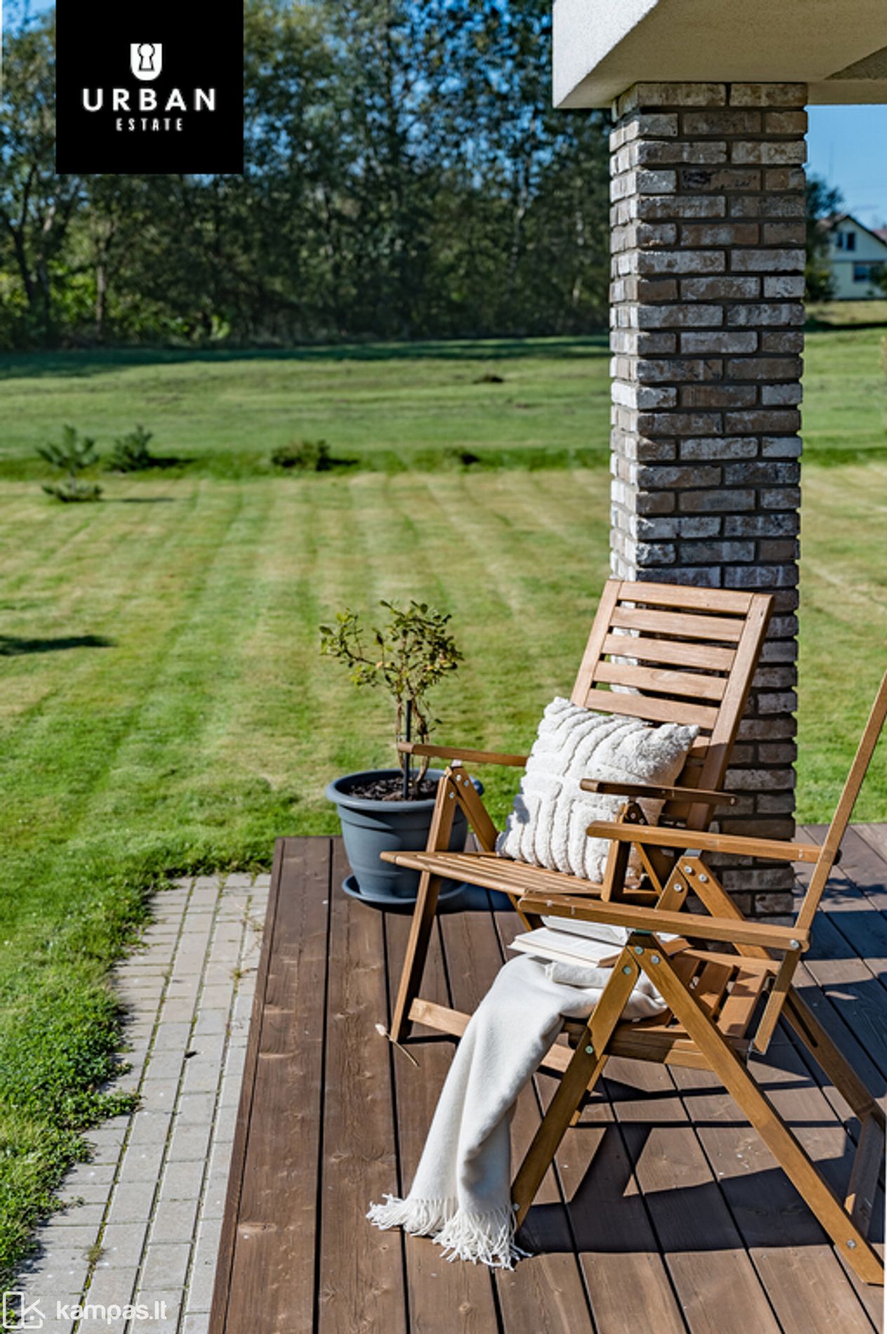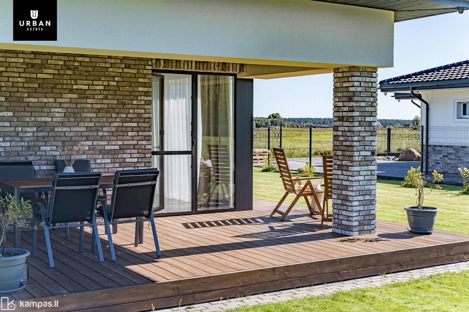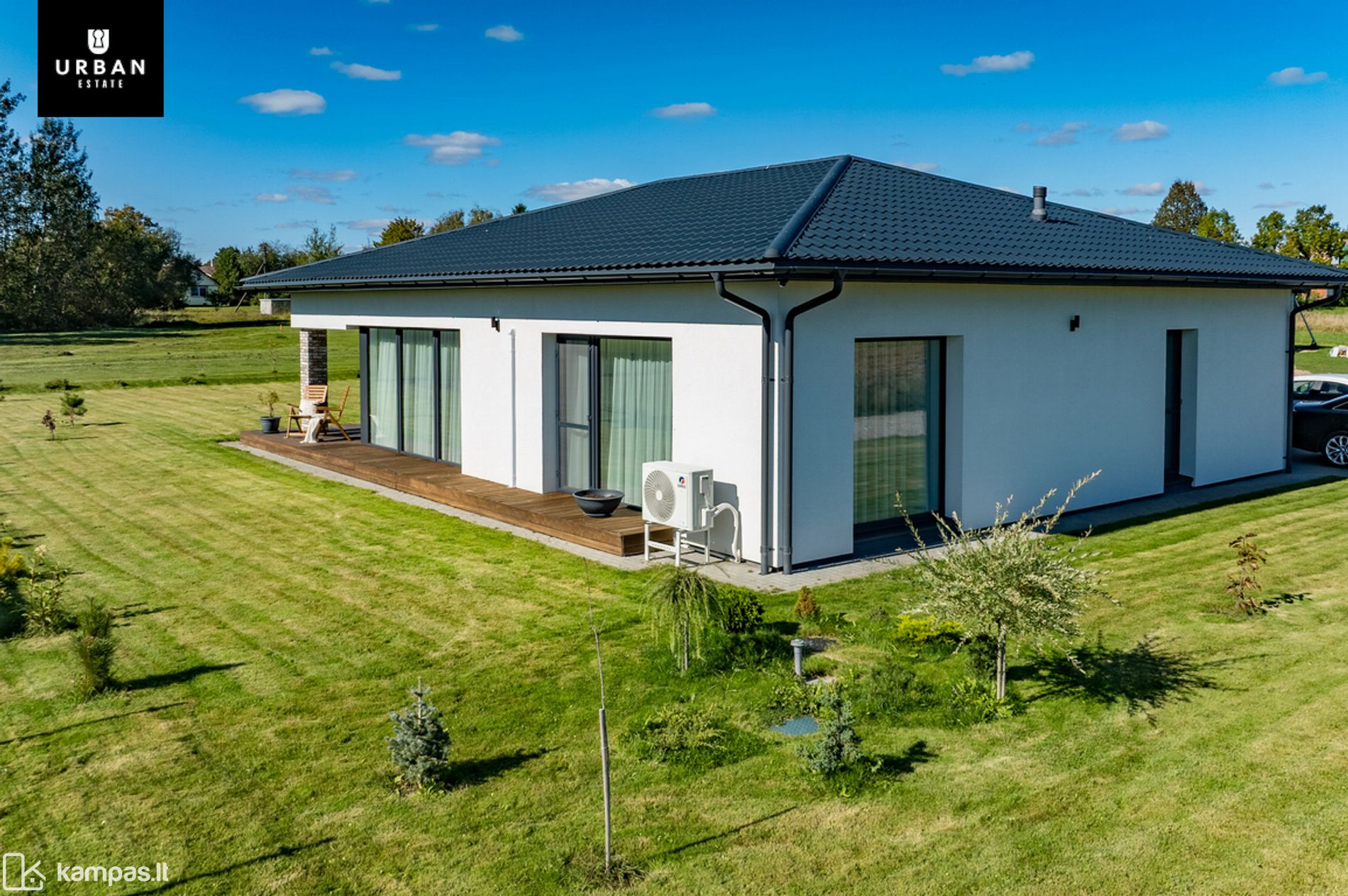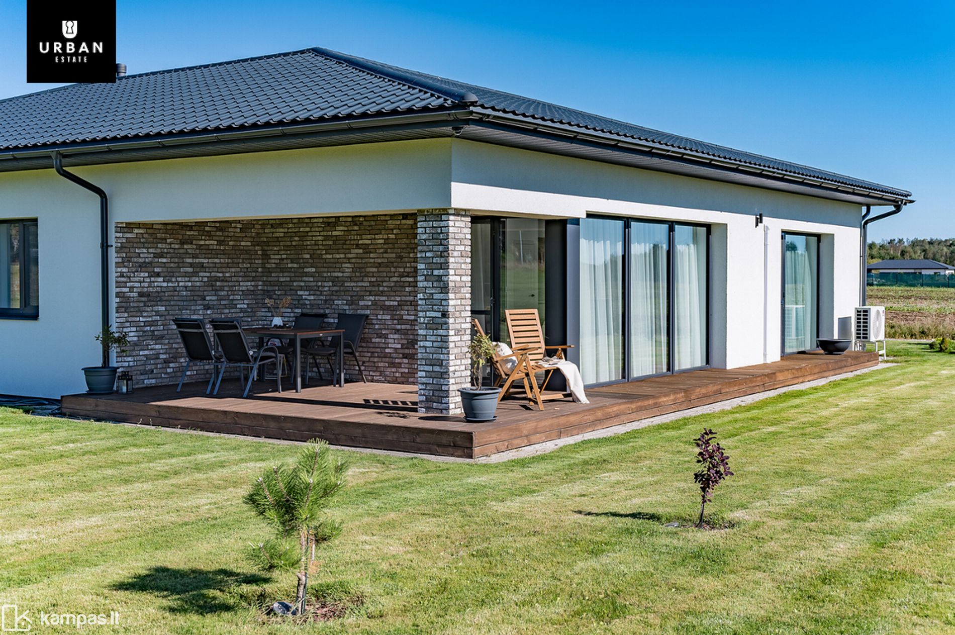 - Erdvi namo teritorija sutvarkyta, su įrengta terasa, žaliuojančiais dekoratyviniais augalais. Teritorija apsėta veja ir išklota trinkelėmis.