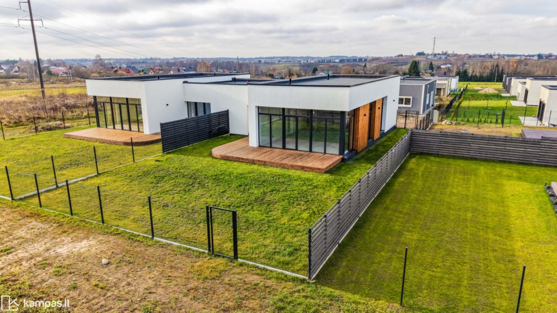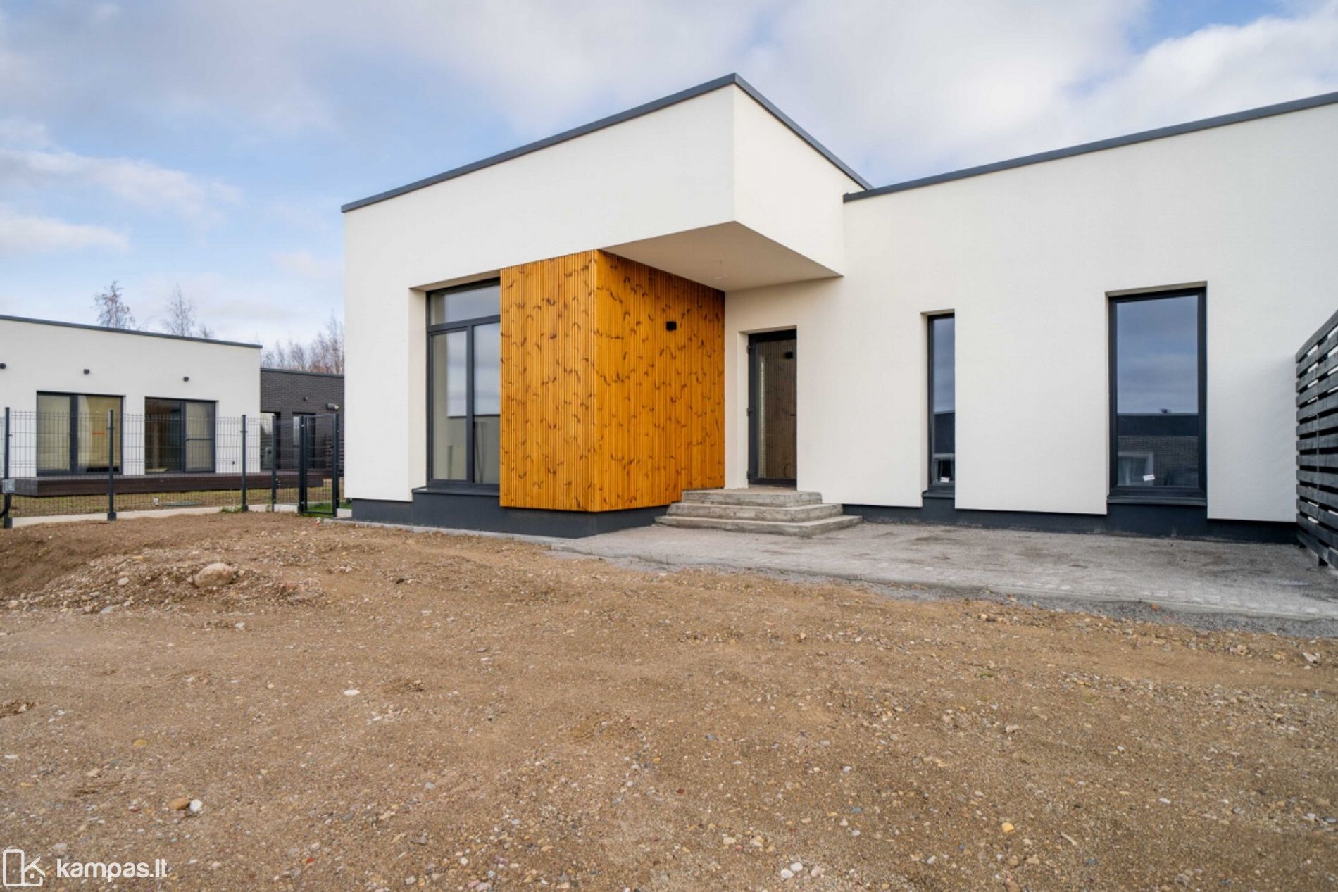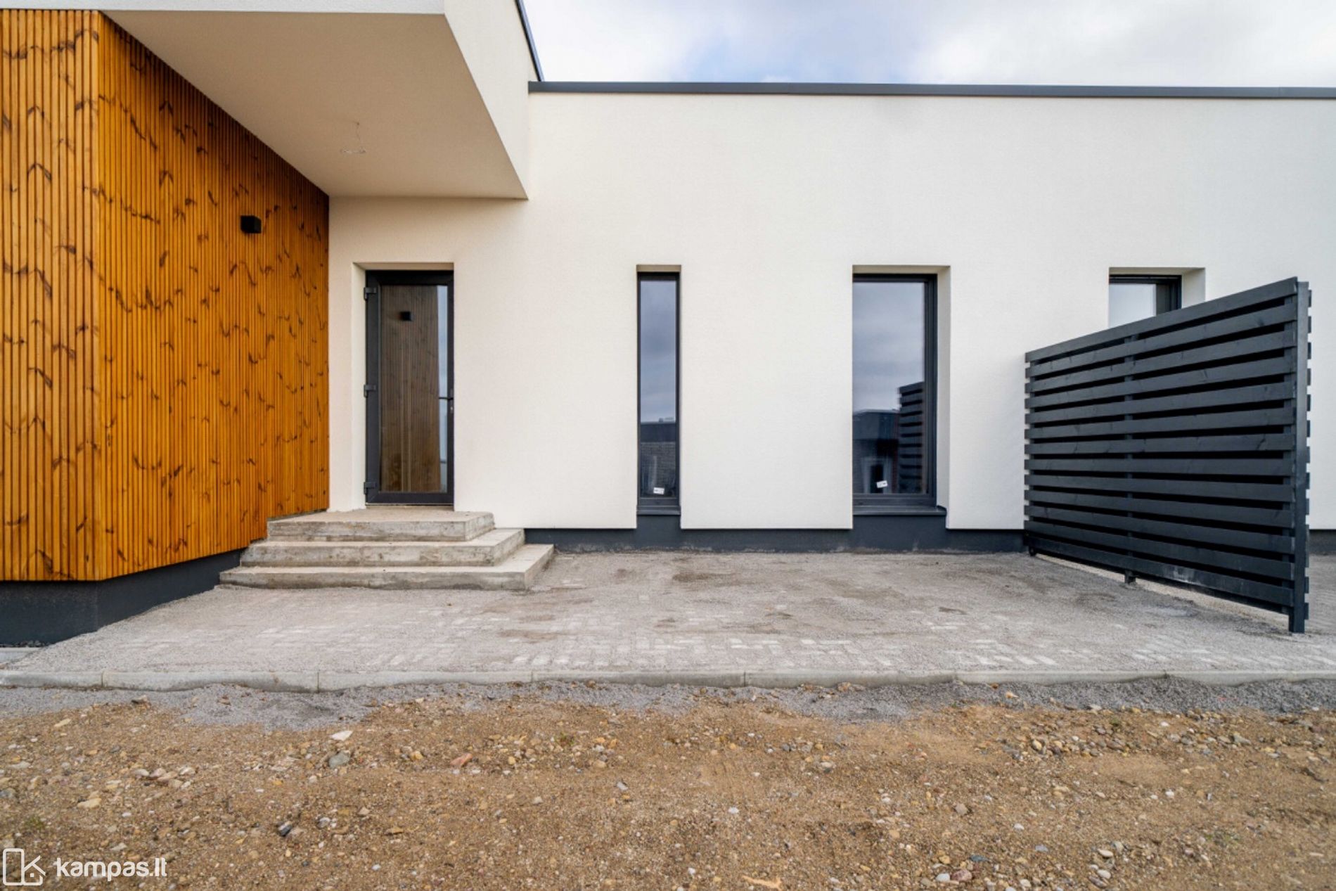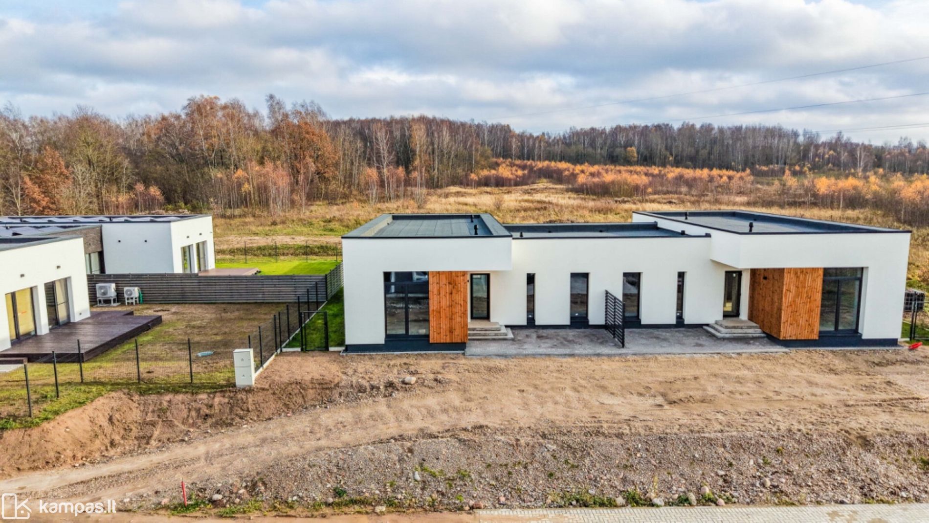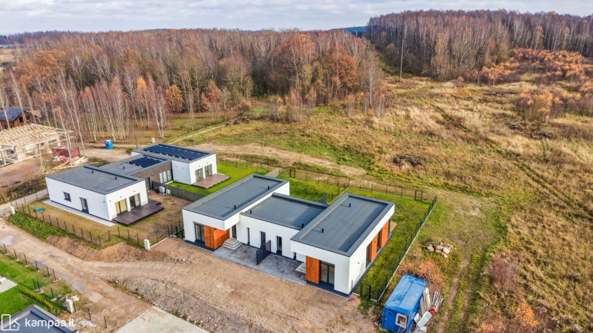 Parduodami aukštos kokybės, A++ energinio naudingumo klasės, modernios architektūros, vieno aukšto, 116 kv. m ploto, 4 kambarių dvibutis namas su 5 arų erdviu sklypu ir 3,40 m aukščio lubomis.