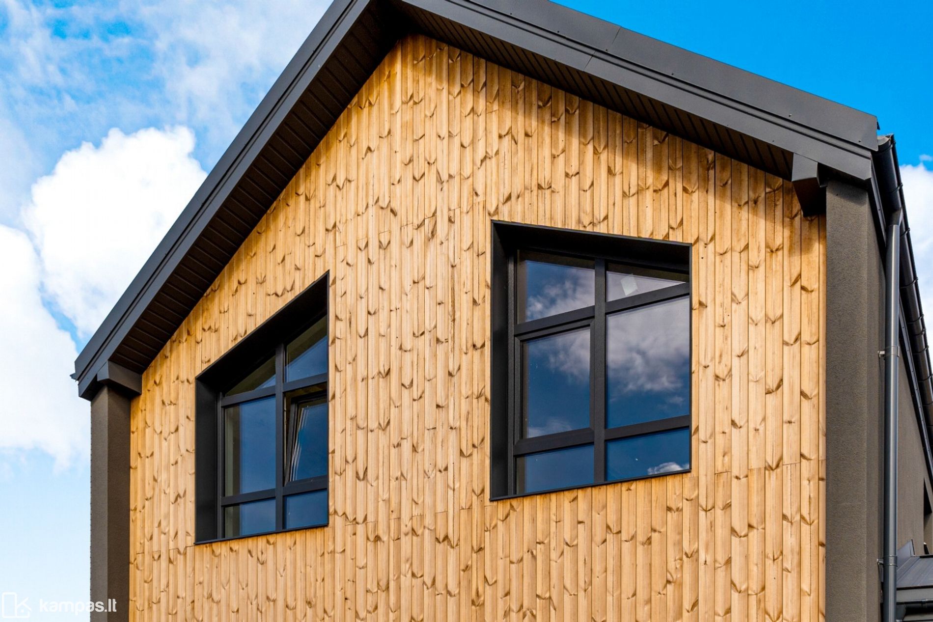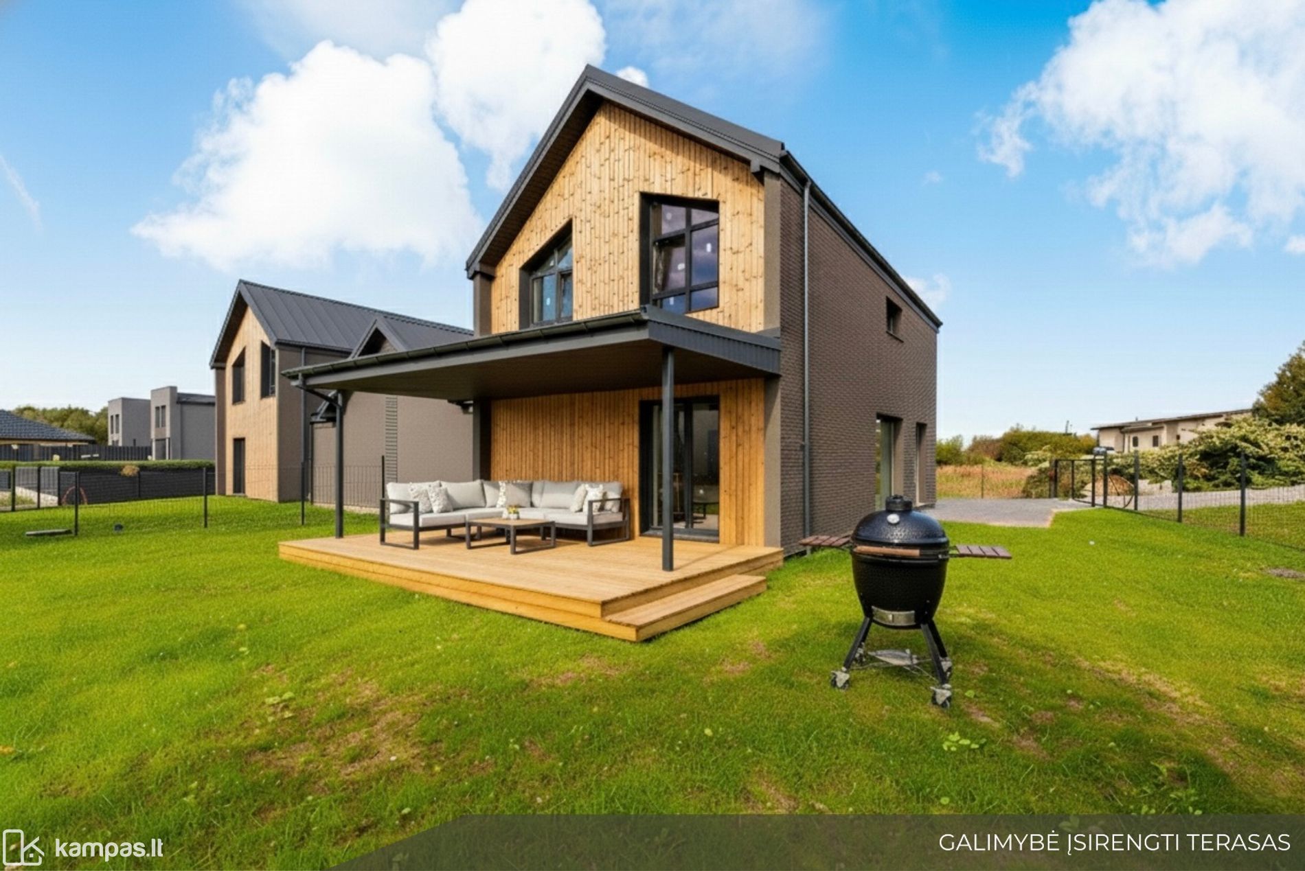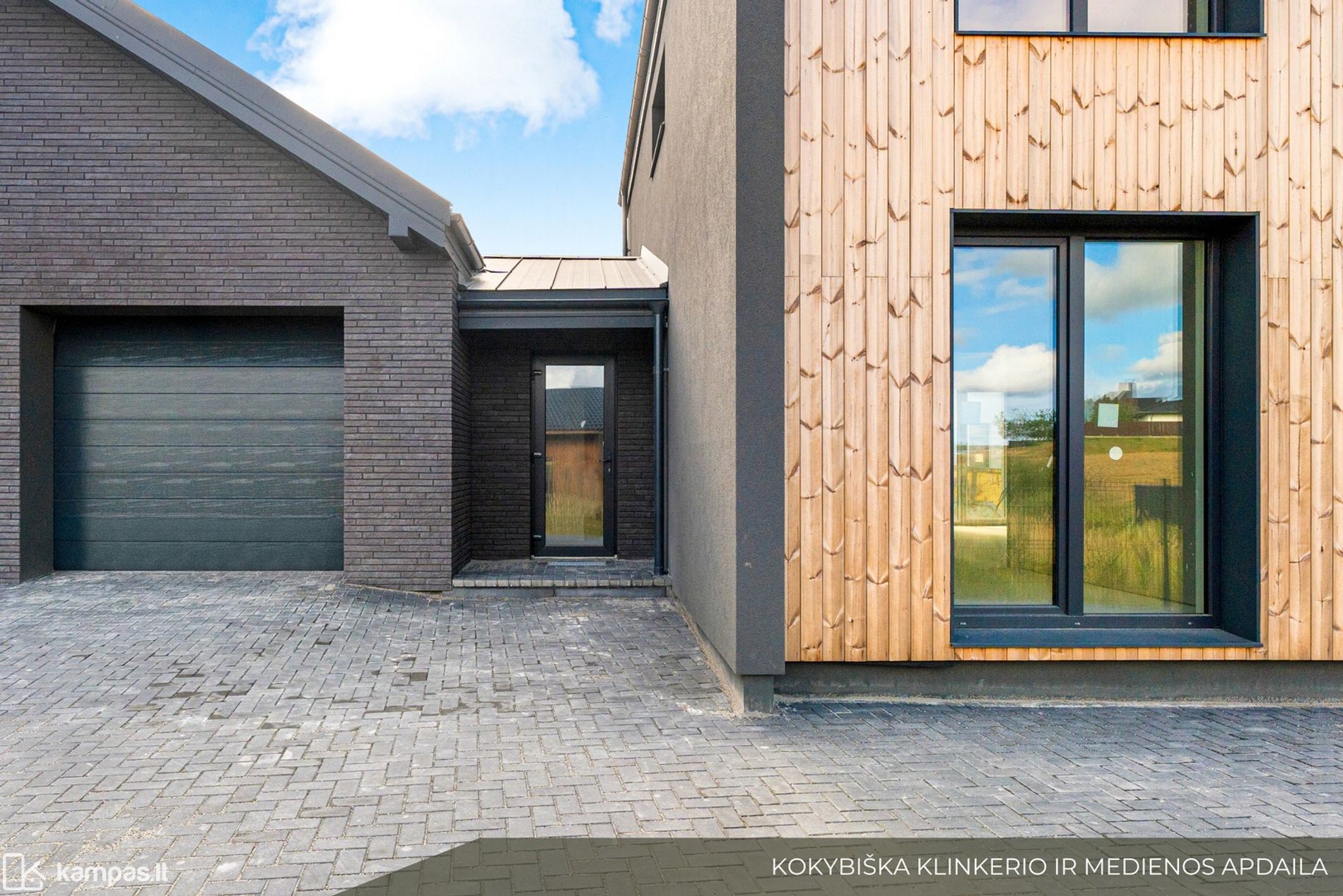 - Išskirtinė architektūra – dideli langai, klinkerio ir termintos medienos apdailos detalės, numatyta vieta erdviai terasai.
