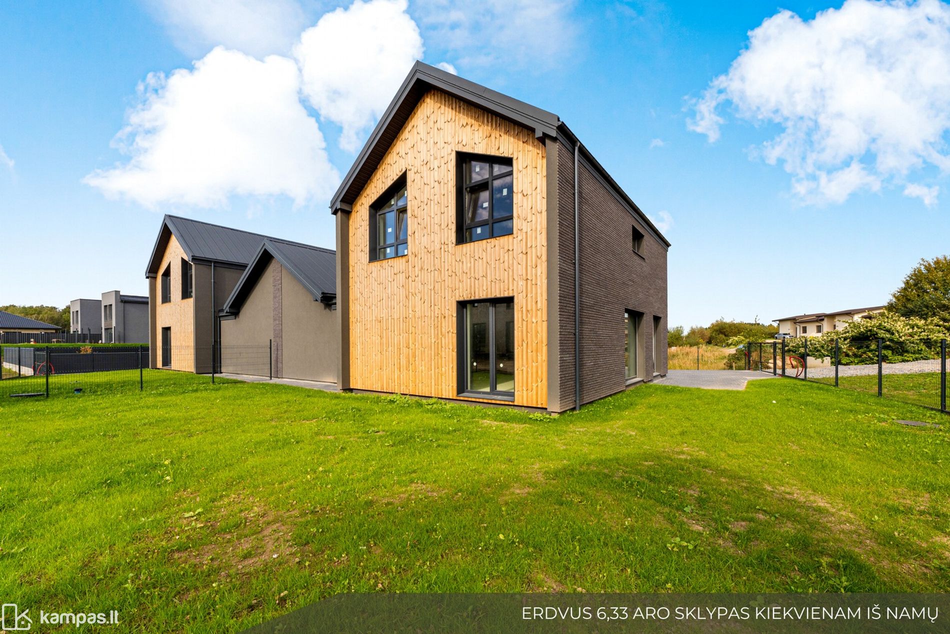 Sklypo plotas: 6,33 a kiekvienam iš namų/butų.