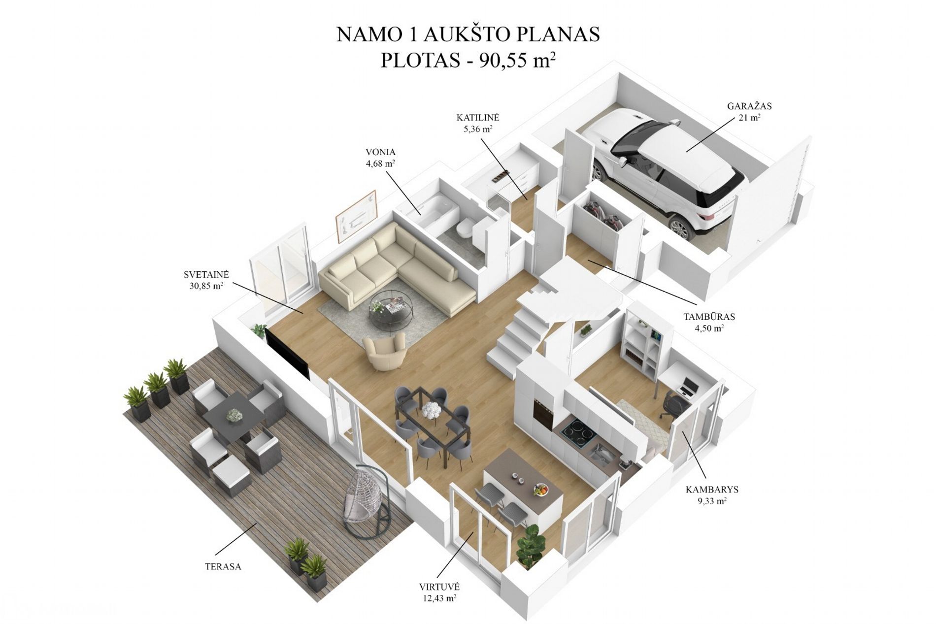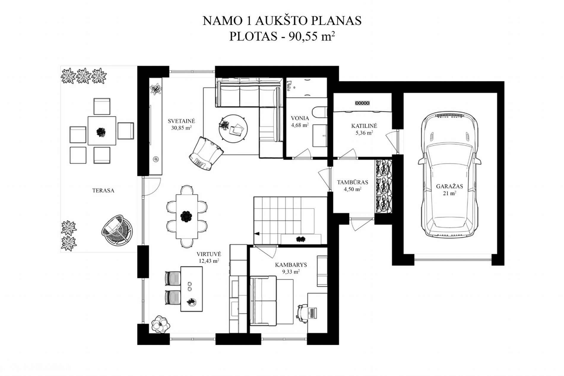 - Kiekvienam namui priklauso garažas, kuriame gausu vietos daiktų pasidėjimui - galima įrengti antresolę.
