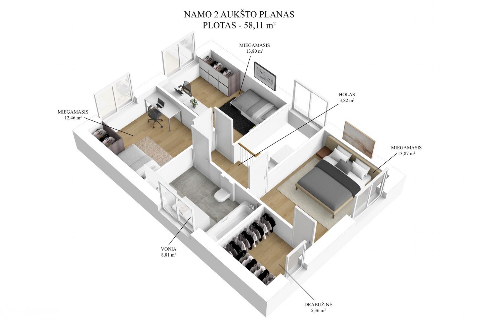 - Funkcionalus išplanavimas su 3 miegamaisiais + darbo kambariu (galima irgi paversti miegamuoju).