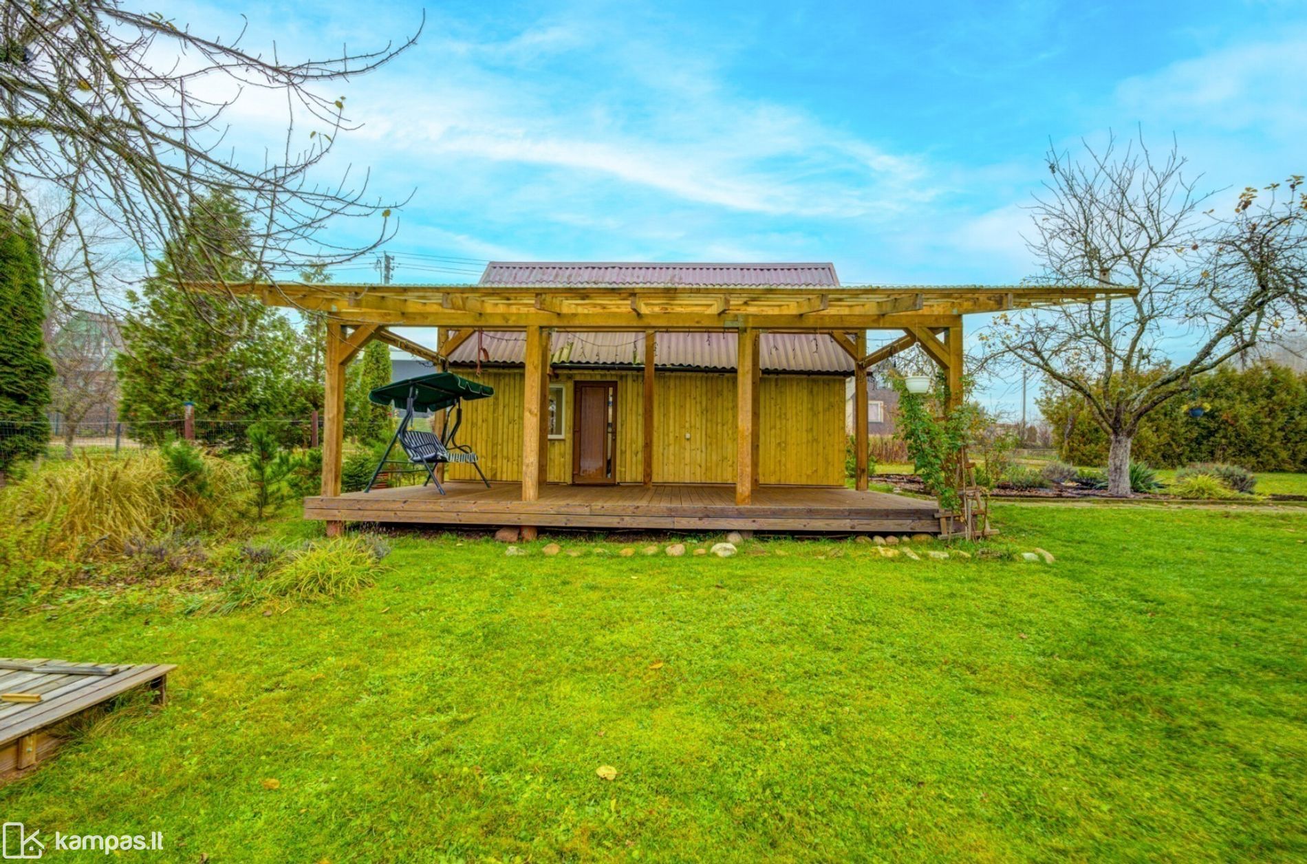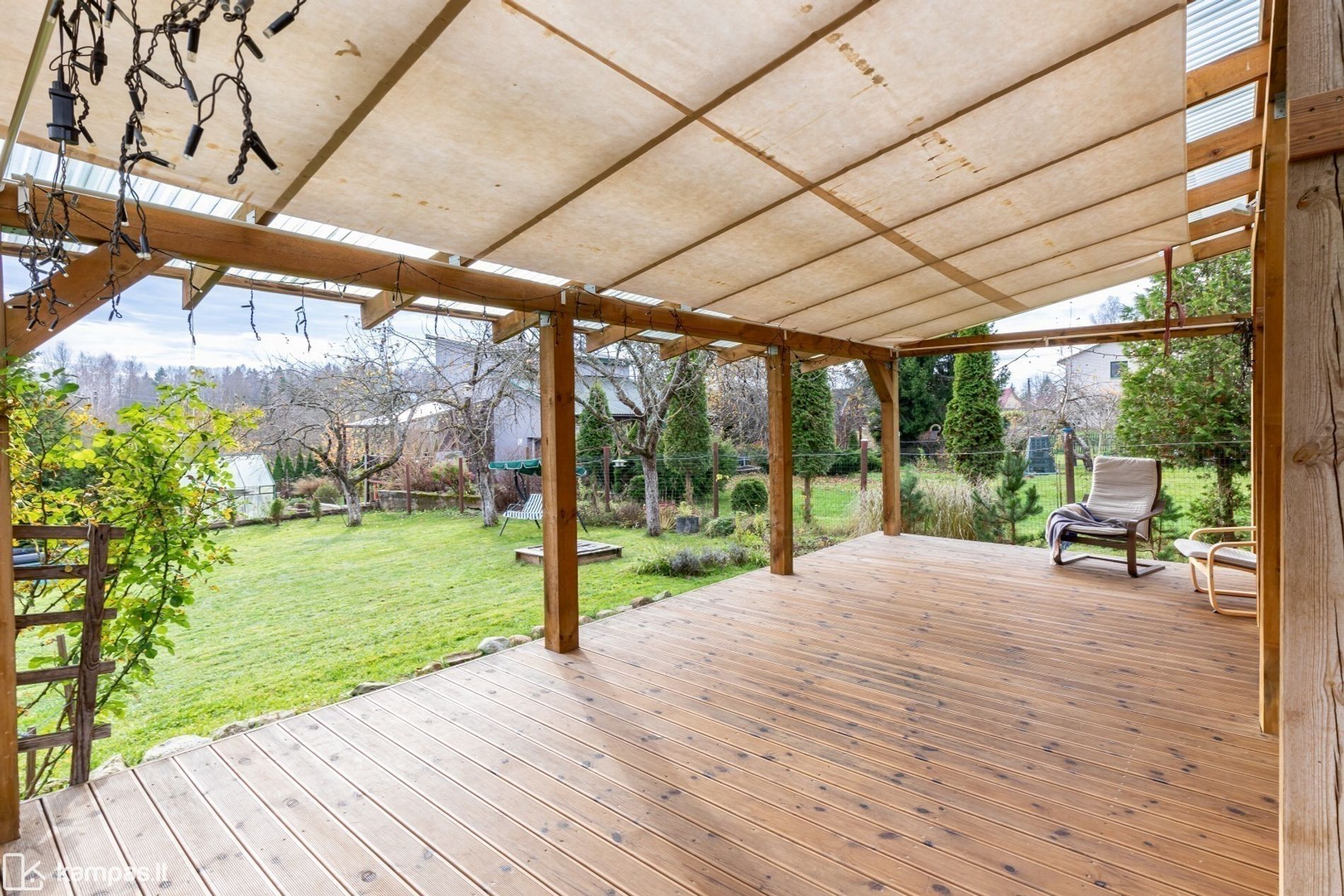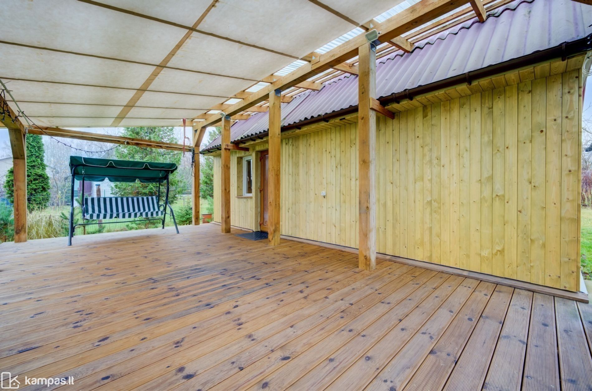 - Didelė terasa iš impregnuotos medienos su stogine;