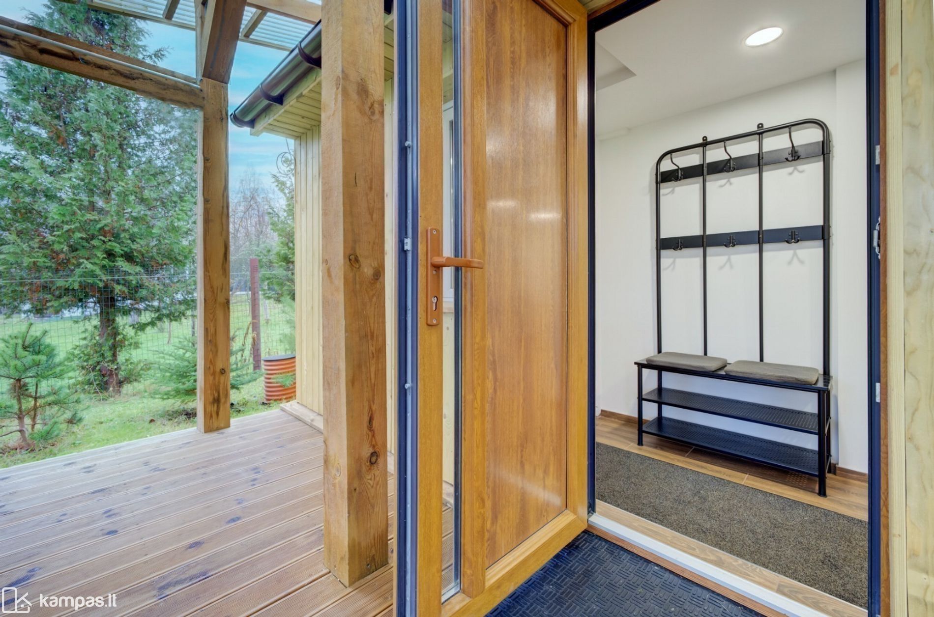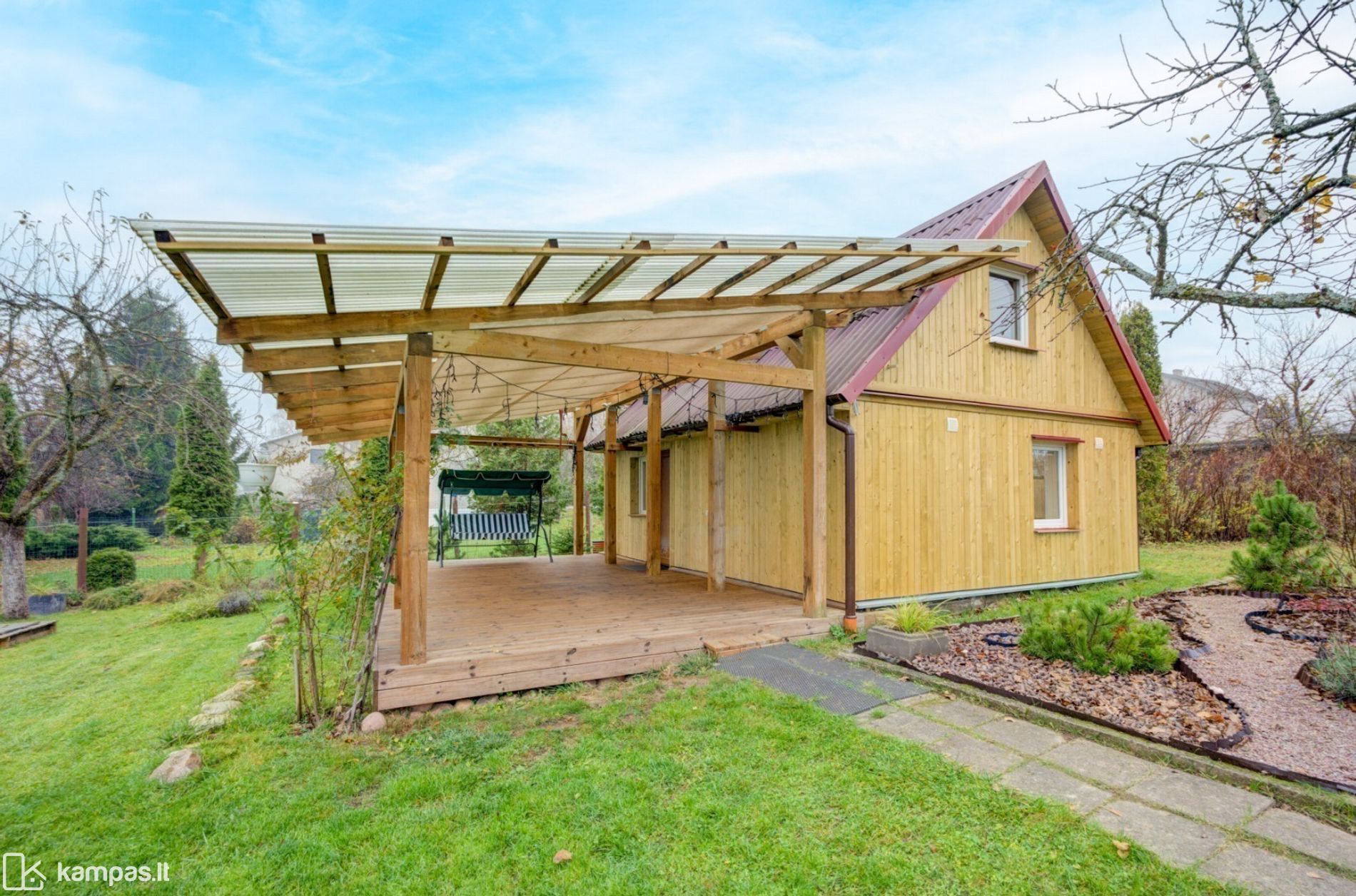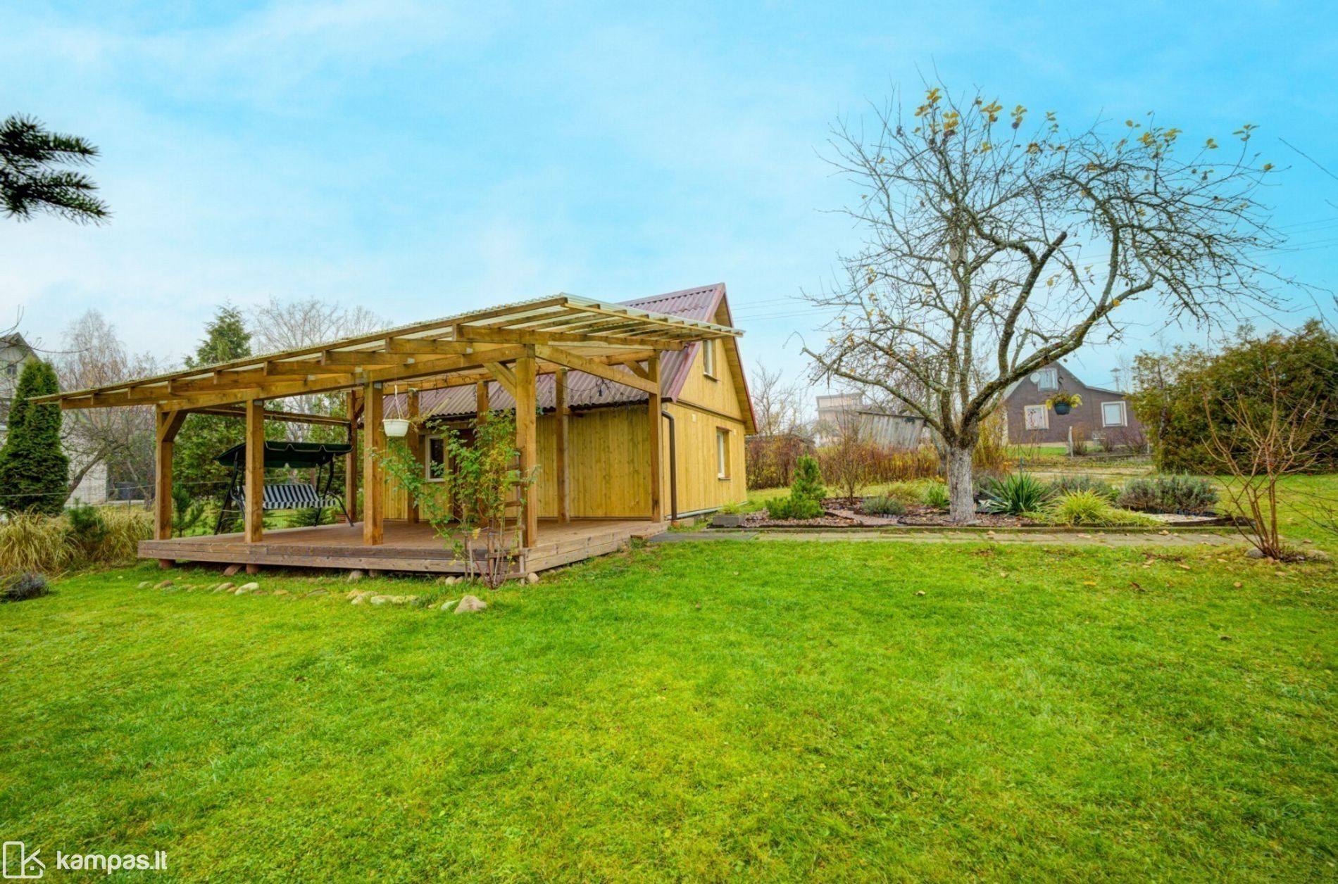 - Didelė terasa iš impregnuotos medienos su stogine;