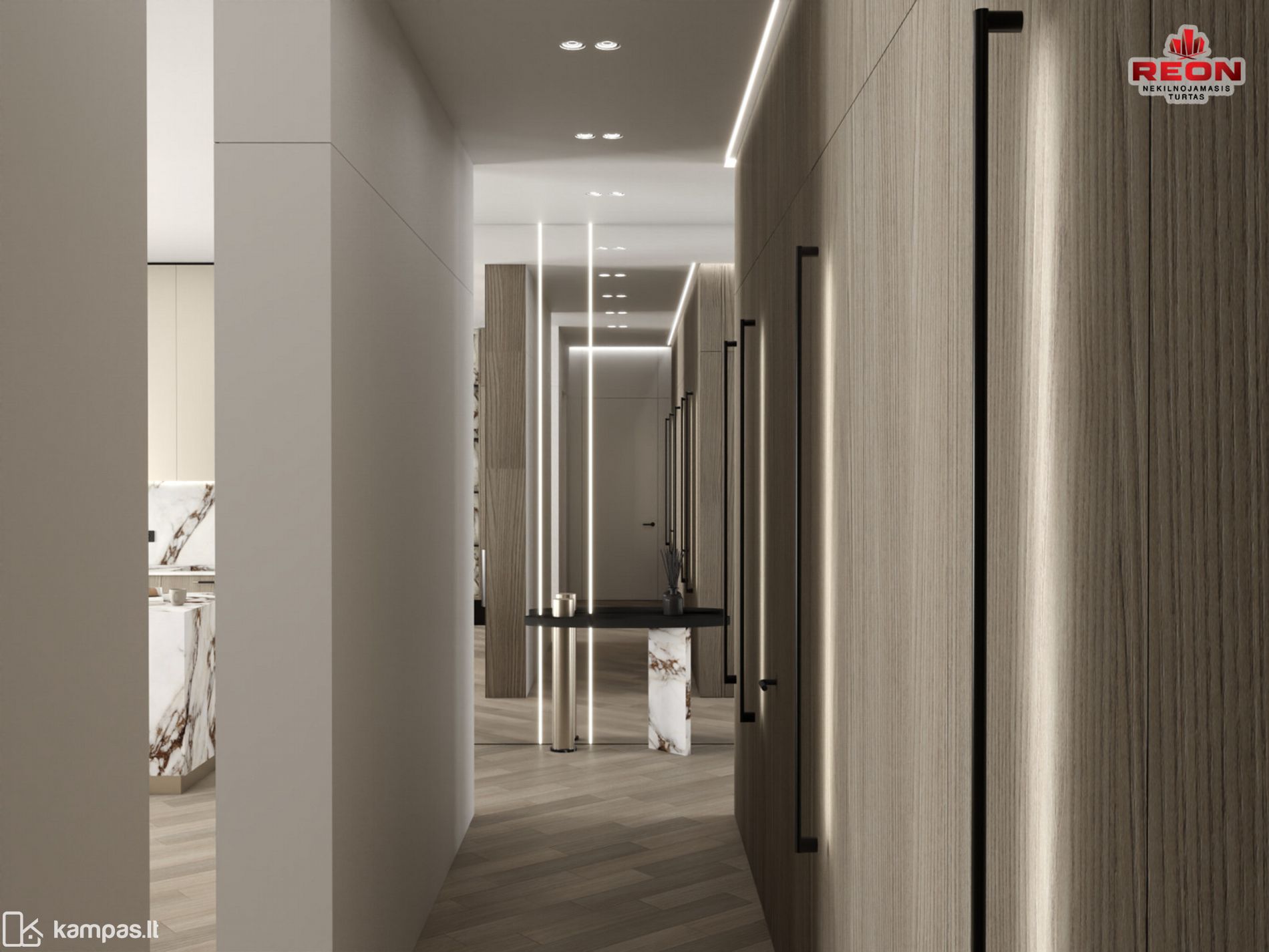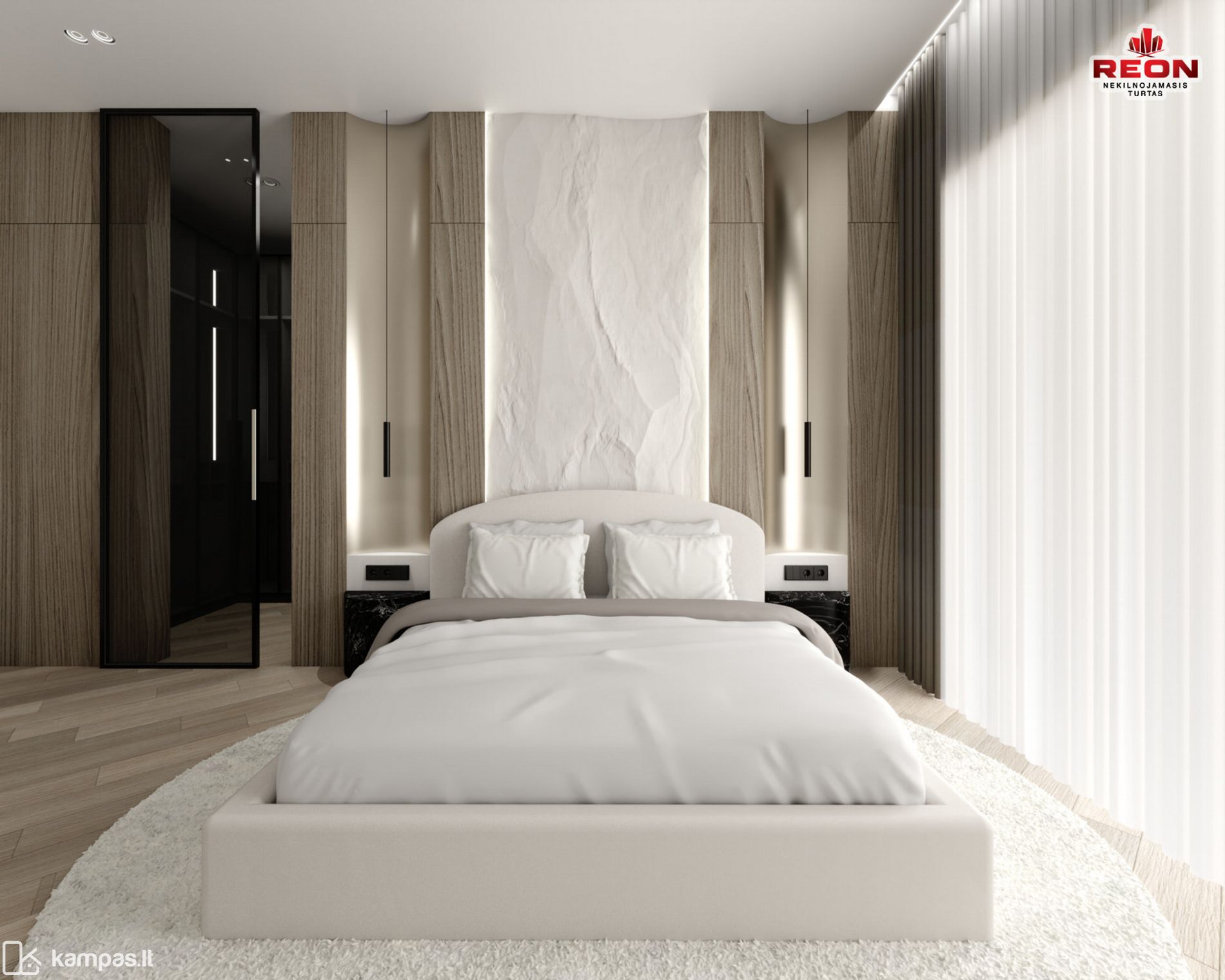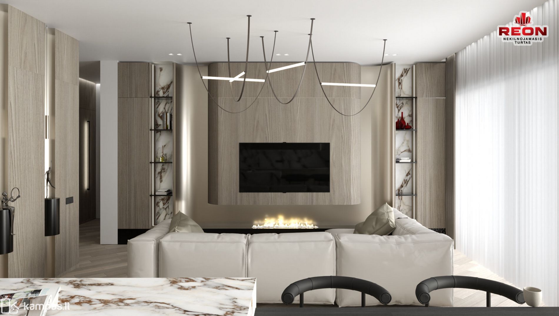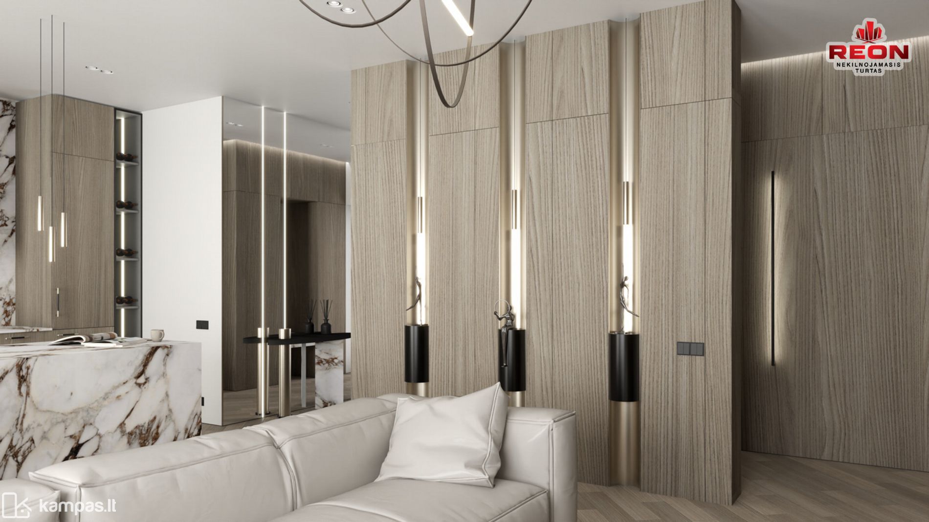 Neutralios spalvos, integruoti apšvietimo sprendimai, natūralaus medžio tekstūros bei prabanga alsuojanti akmens apdaila sukuria harmoningą ir išgrynintą gyvenamąją erdvę. Čia kiekvienas baldas, šviestuvas ir apdailos elementas tarpusavyje dera kaip vientisa dizaino kompozicija.