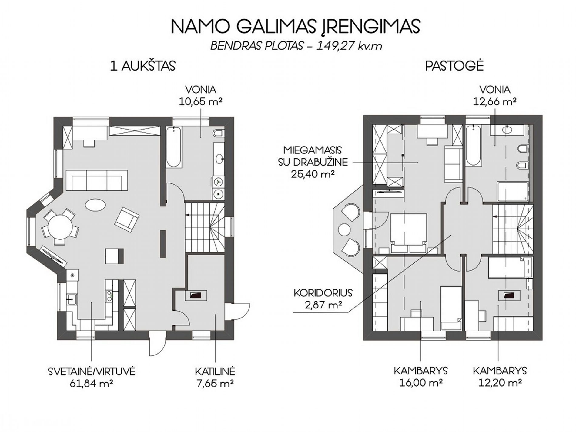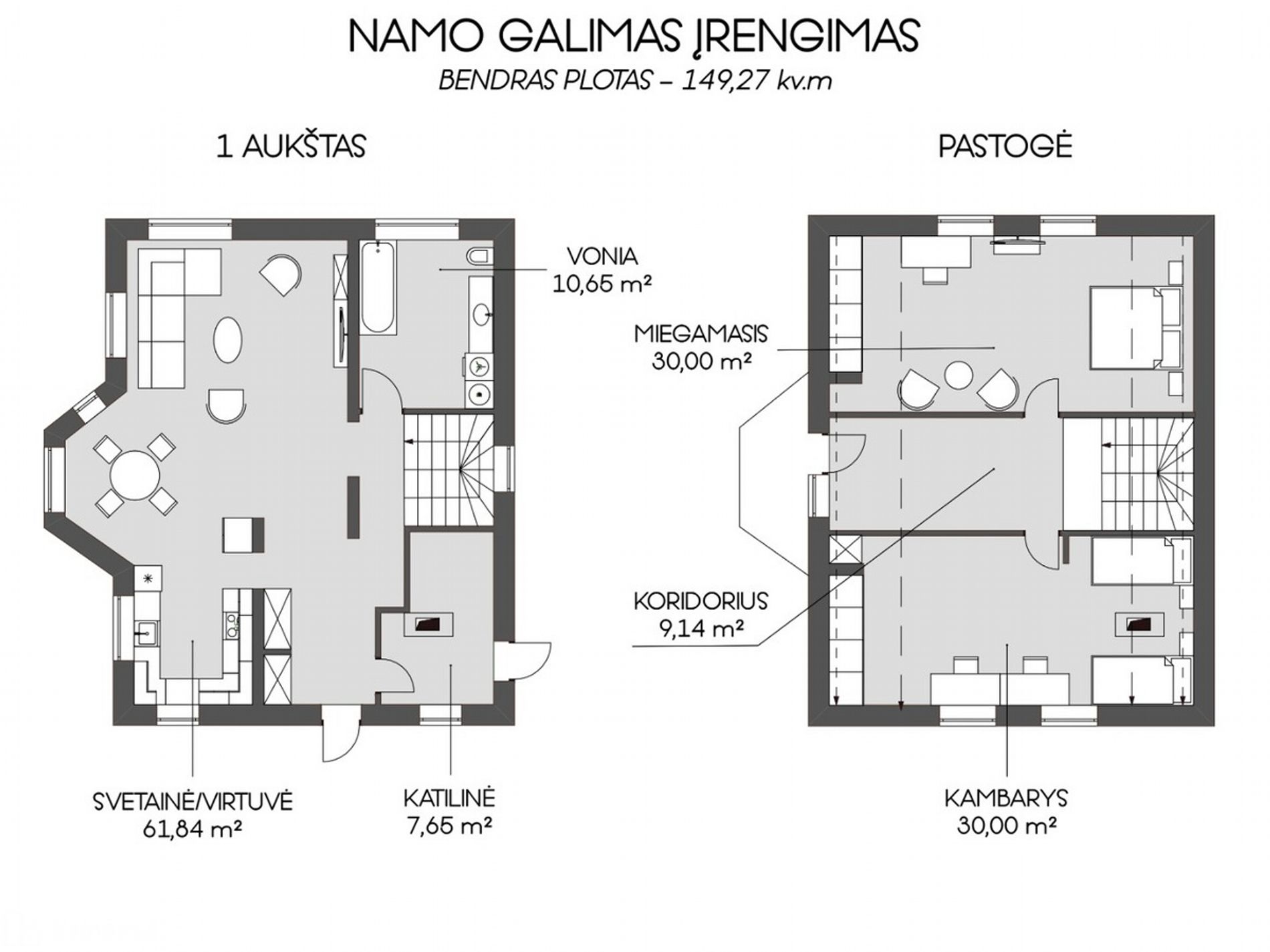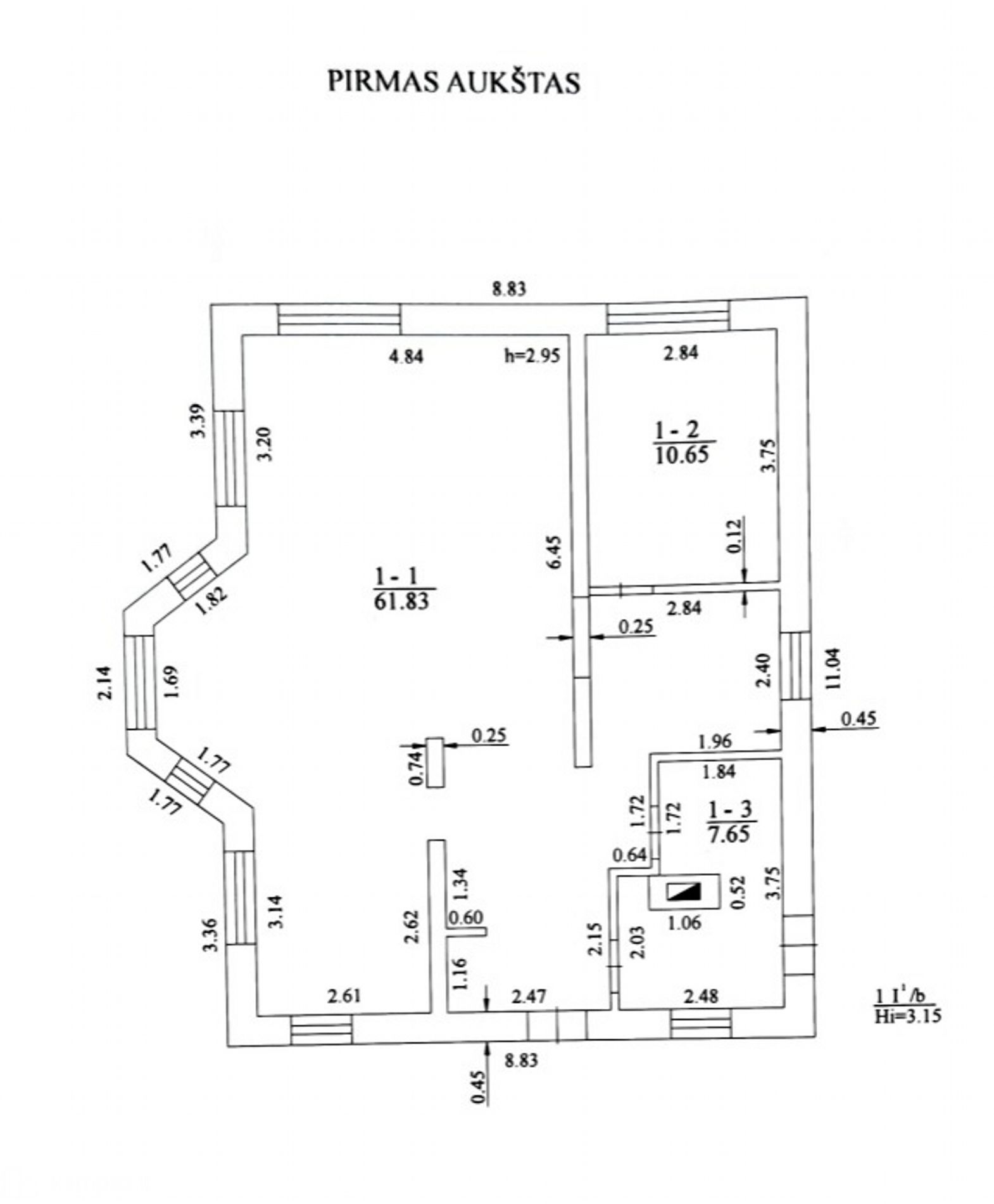 1 aukštas: svetainė, valgomasis, tambūras: 61.83 kv.m.; virtuvė: 10.65 kv.m., san. mazgas: 7.65kv. m.