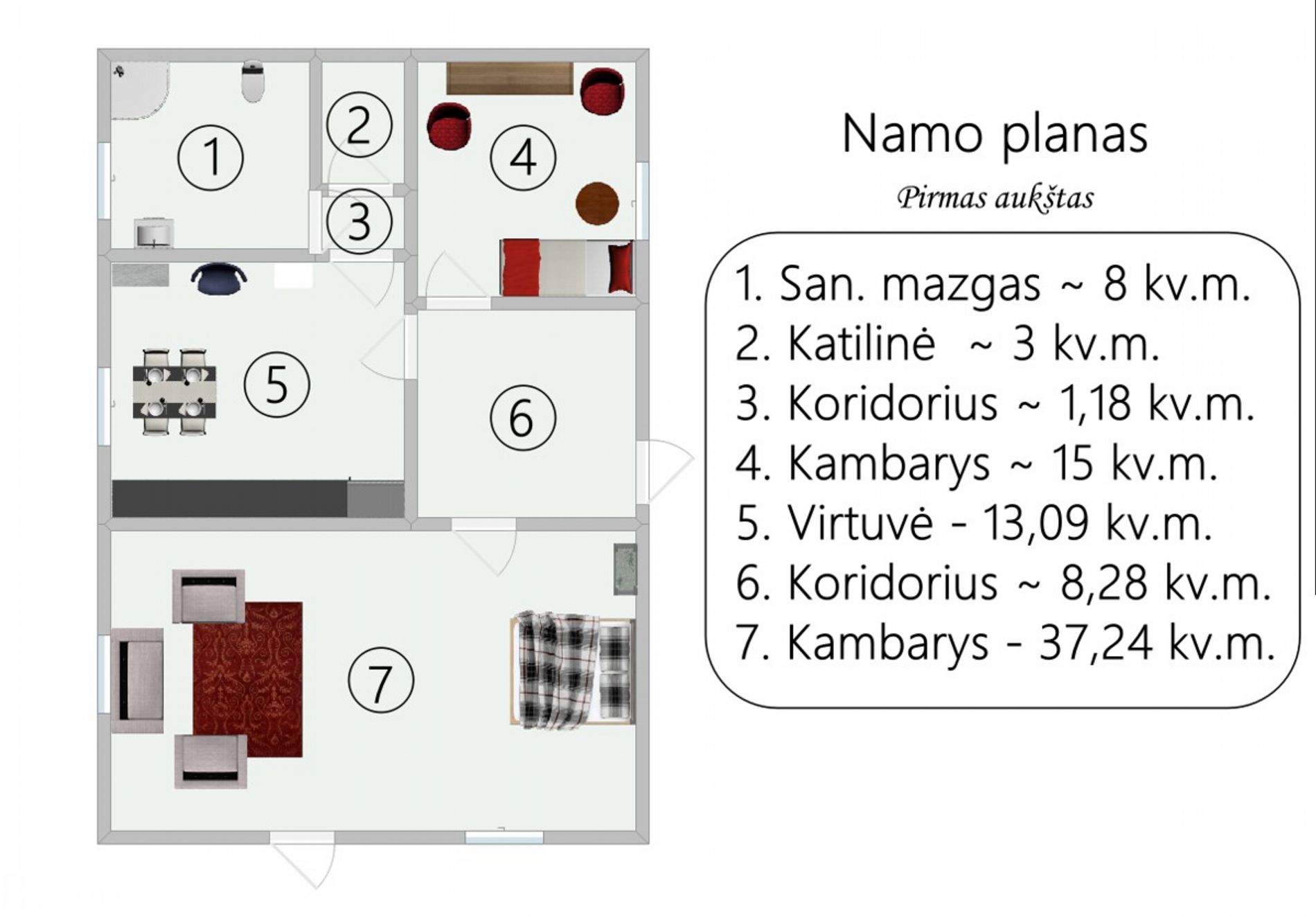 • Kambarių sk.: 3, mansardoje galima įsirengti dar 2 kambarius;