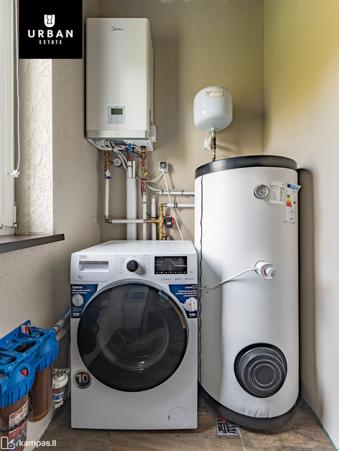 Šildymas - aeroterminis, grindinis. 6kW su tenu 9kW Midea katilas ir 200L boileris;