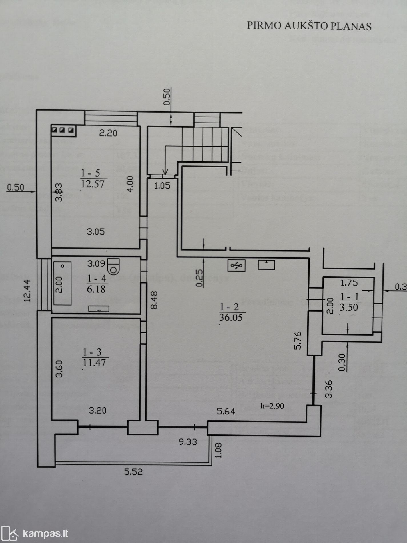 Pirmo auk patšto plotas 70 kv. m. Lubų aukštis – 2,90 m.