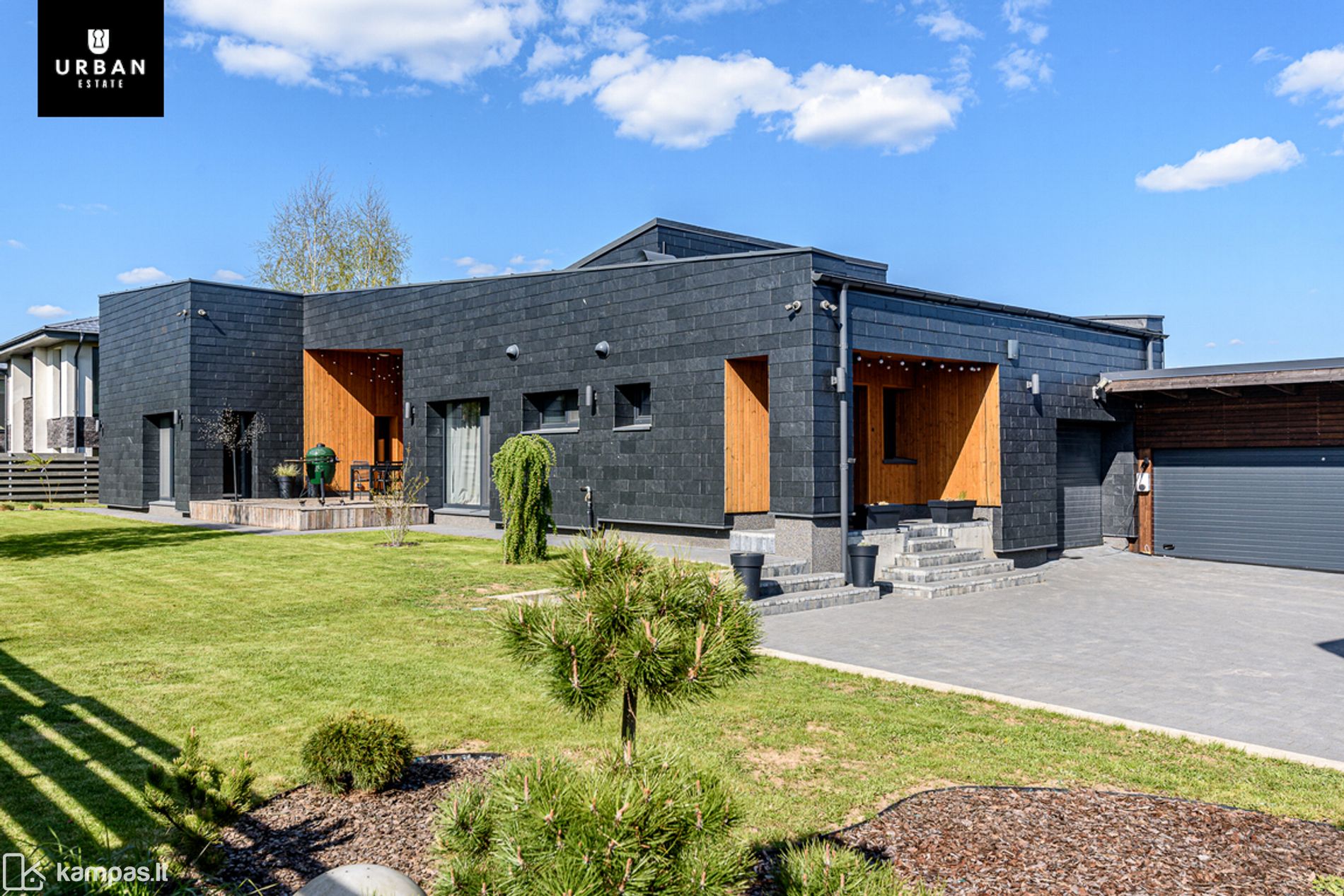 • Namas vieno aukšto. Erdvi svetainė sujungta virtuvės zona, išėjimas į terasą, svečių san. mazgas, atskiras darbo kambarys, du vaikų kambariai su jiems skirta vonia ir tėvų miegamasis su atskira drabužine ir vonia. Prie įėjimo erdvi sieninė spinta, katilinė, garažas.