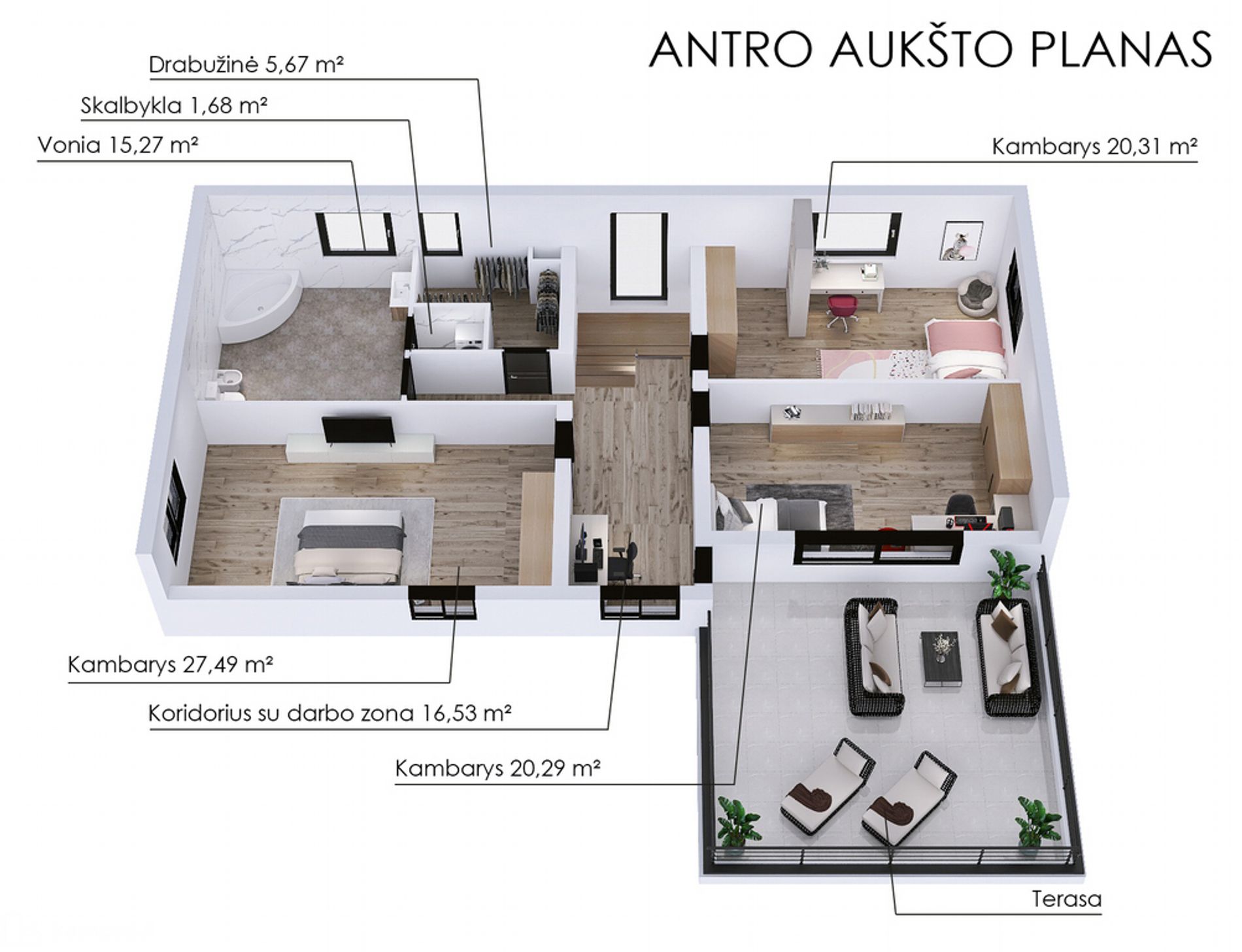 - Trys miegamieji kambariai antrame aukšte.