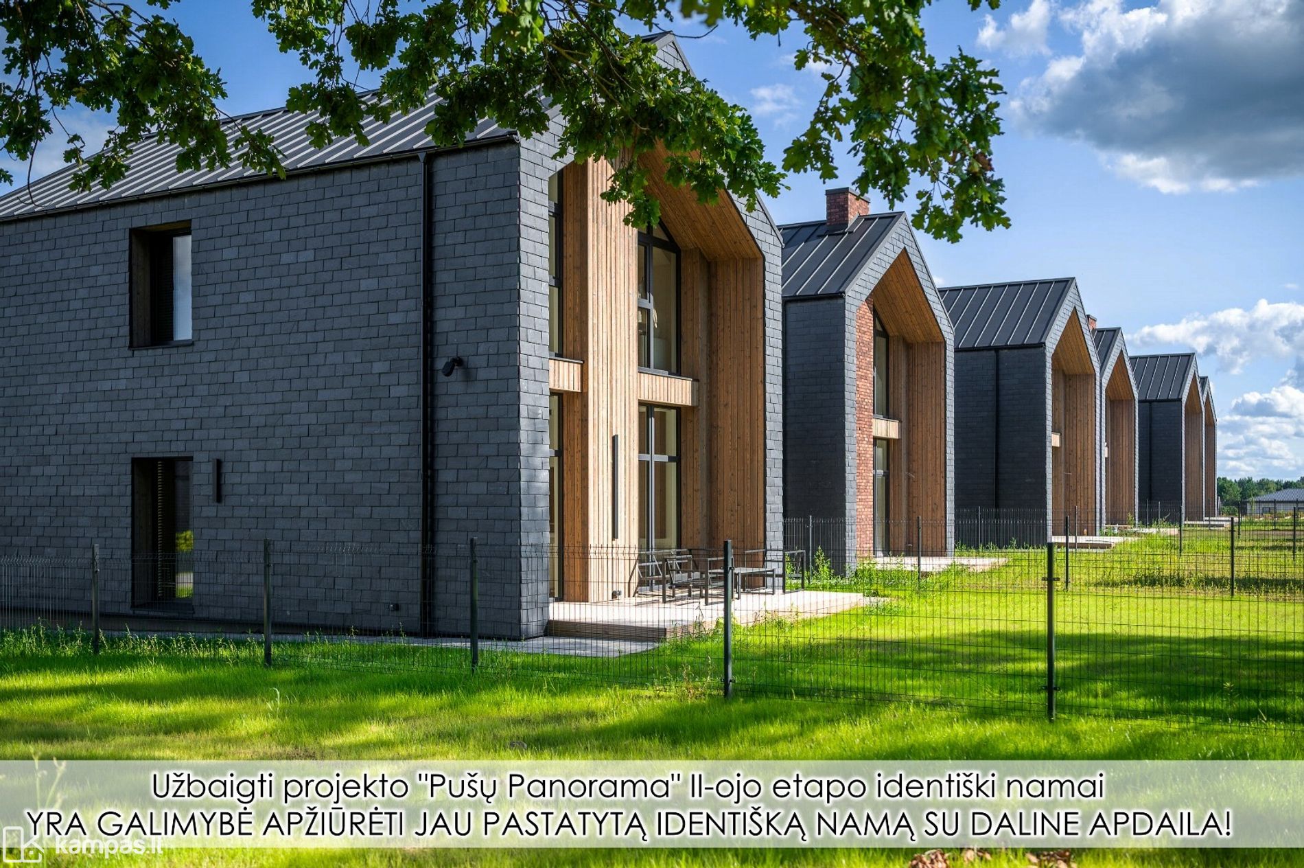 • Aukštos kokybės, moderni, skandinaviška projekto architektūra – namai su SKALŪNO ir DEGINTOS MEDIENOS FASADAIS bei išskirtiniais VITRININIAIS LANGAIS. Suformuoti stogeliai virš įėjimo durų, terasoje taip pat stogelis bei užuovejos šoninės sienos pratęsiant namo fasadą bei stogą vienu metru.