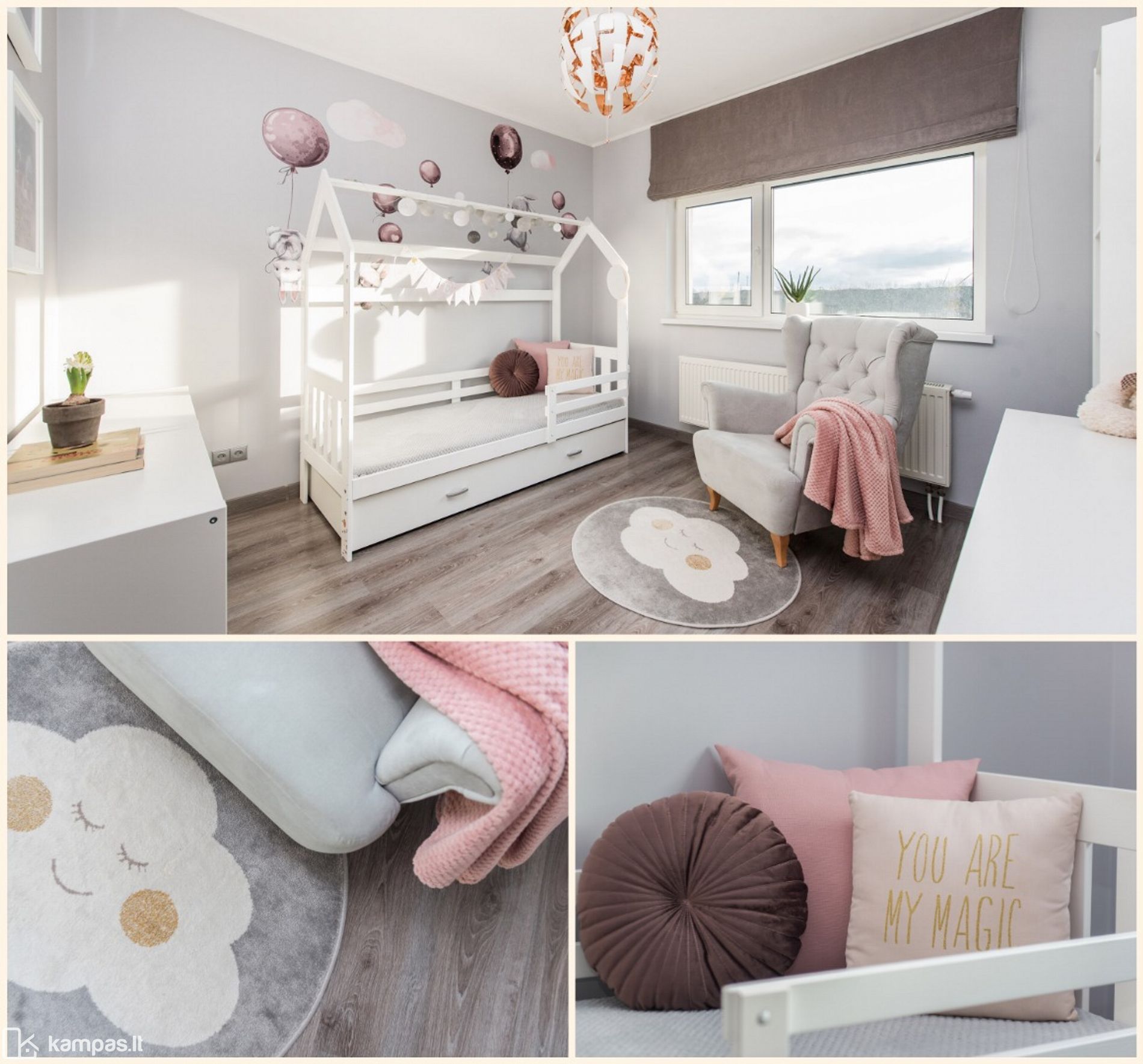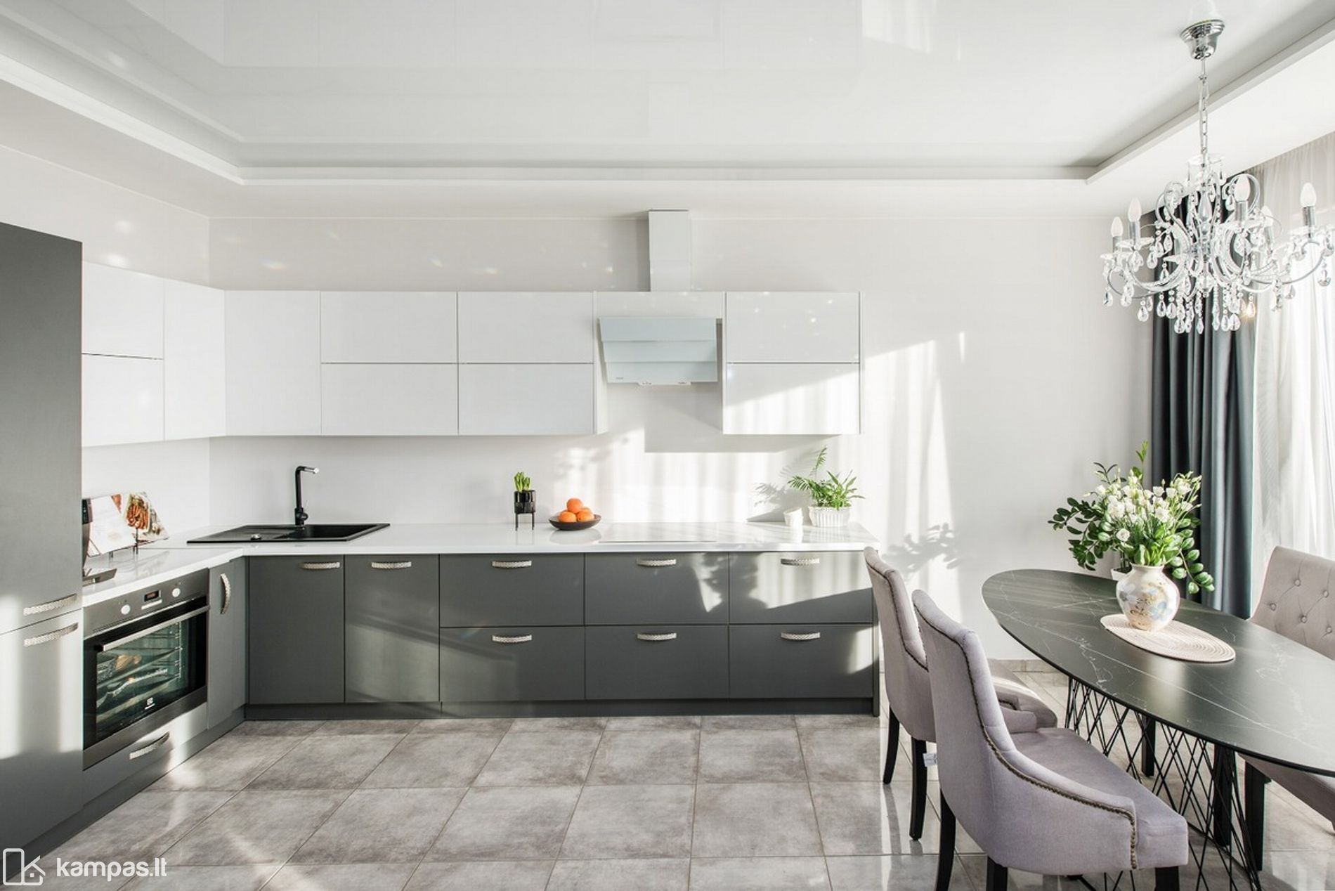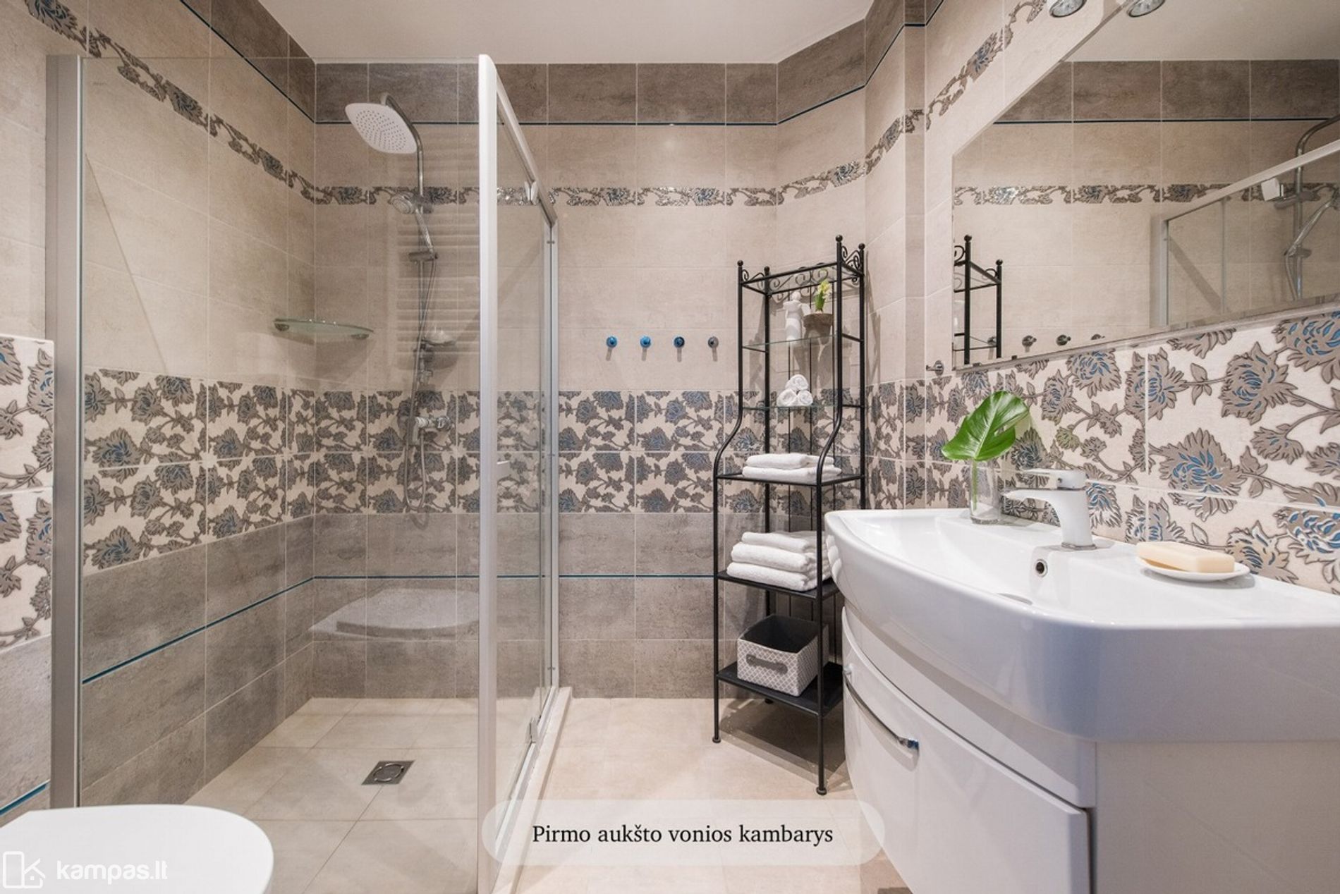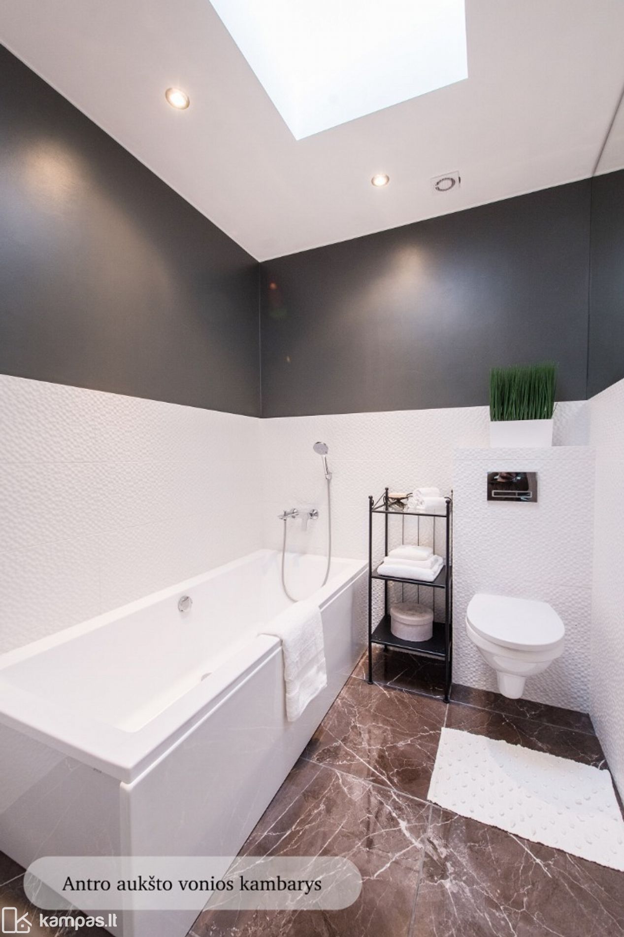 - Grindys - laminatas, tambūre, virtuvės zonoje ir vonios kambariuose akmens masės plytelės,