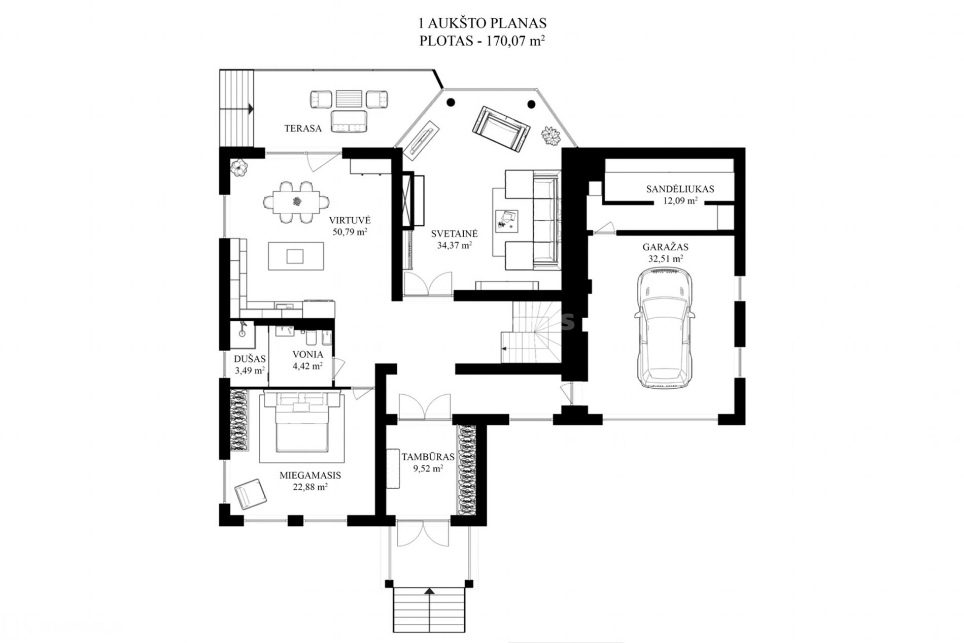• Labai patogi ir funkcionali didelė virtuvė su terasa orientuota saulėta kryptimi;