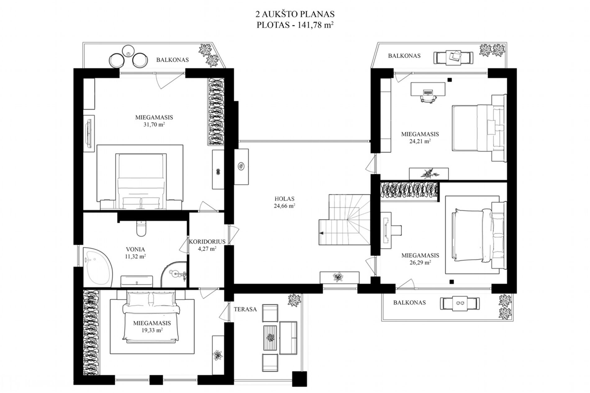• 3 miegamieji kambariai su terasomis/balkonais;