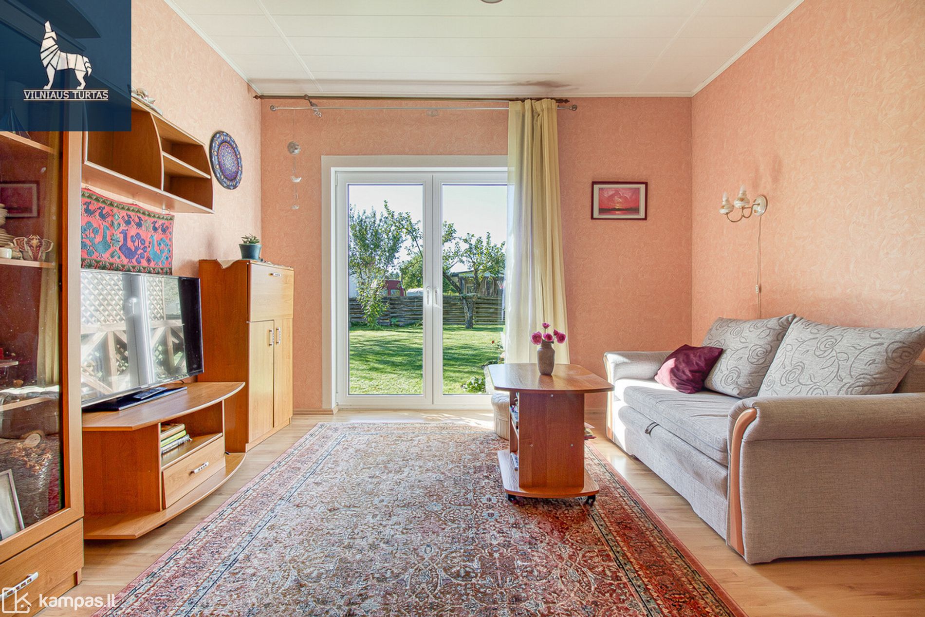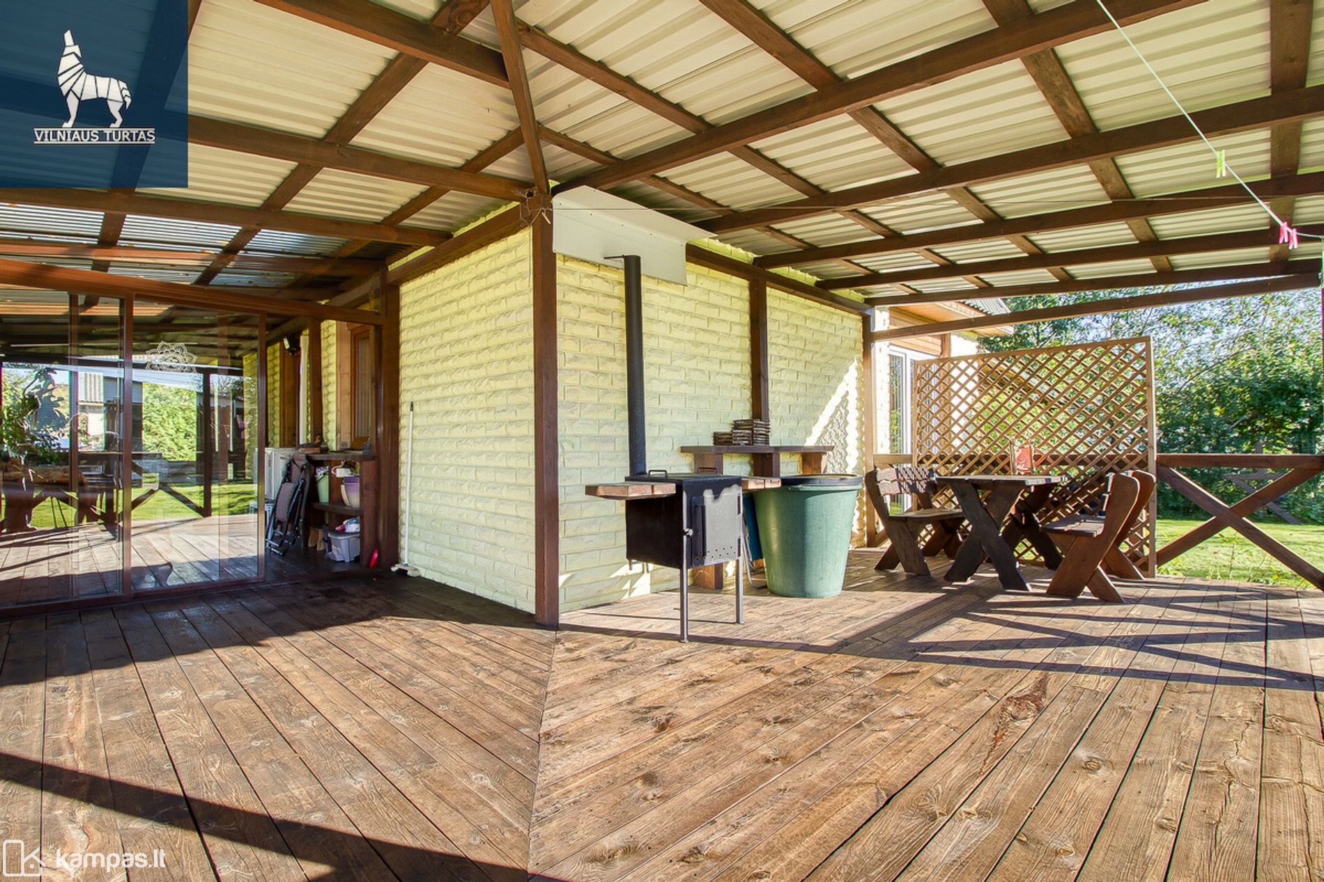 6 arų sutvarkytas, apželdintas sklypas su vaismedžiais, veja, įstiklinta veranda, pavėsine automobiliui ir terasa.