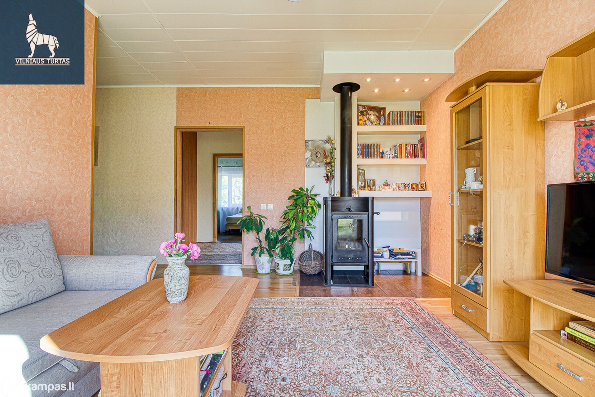 4 kambariai: svetainė su židiniu ir dalinai atskirta virtuve, trys izoliuoti miegamieji.