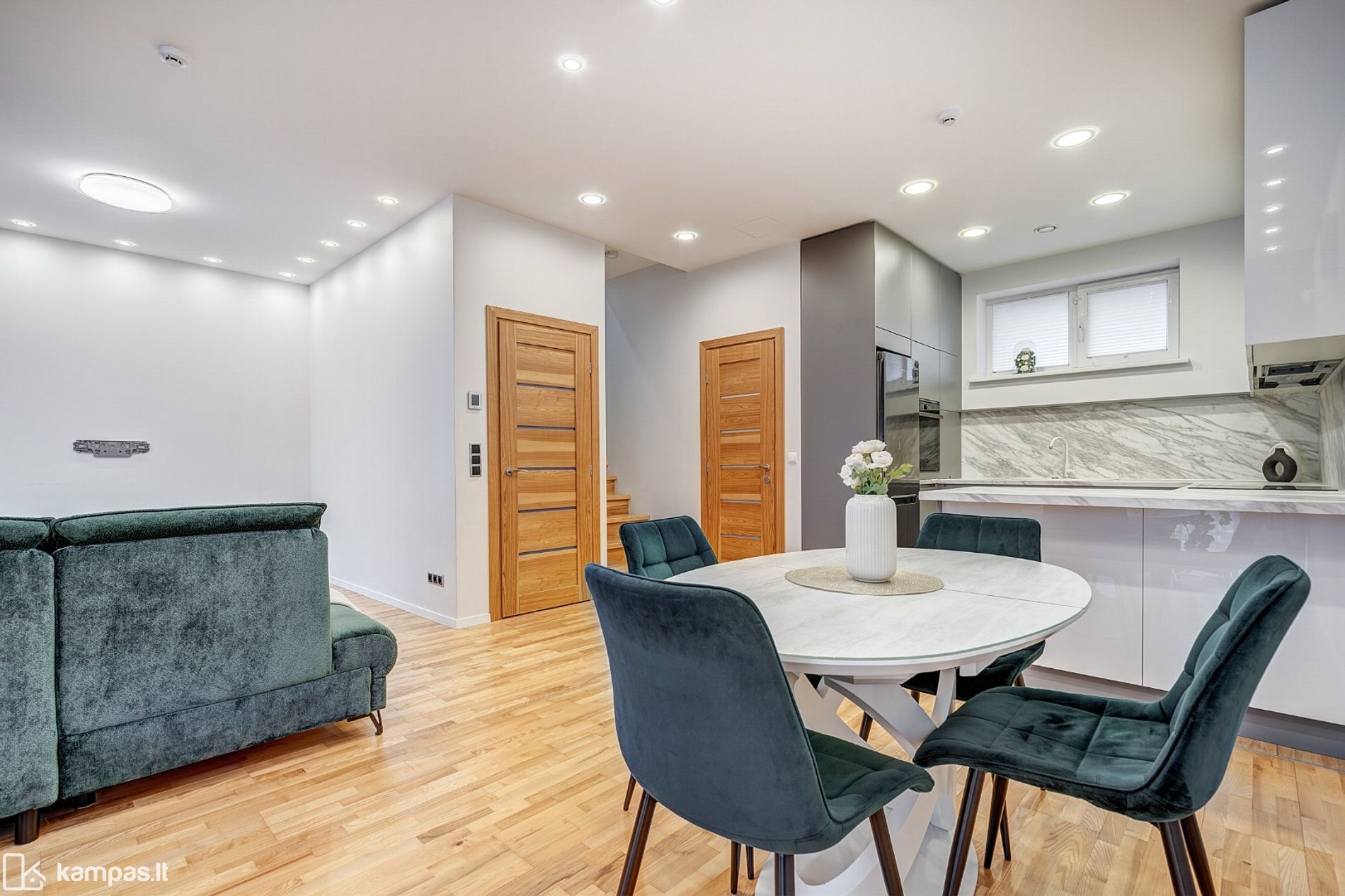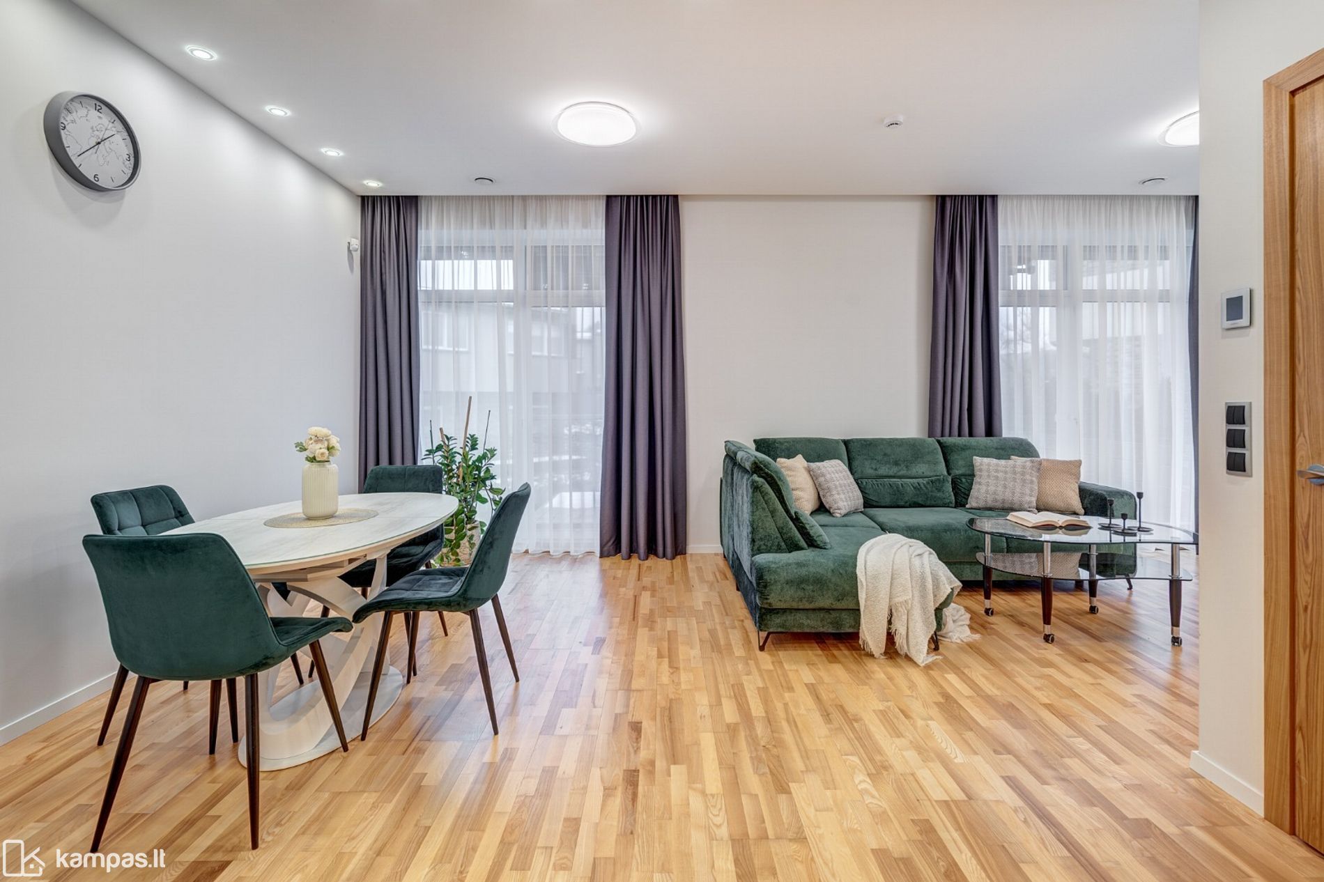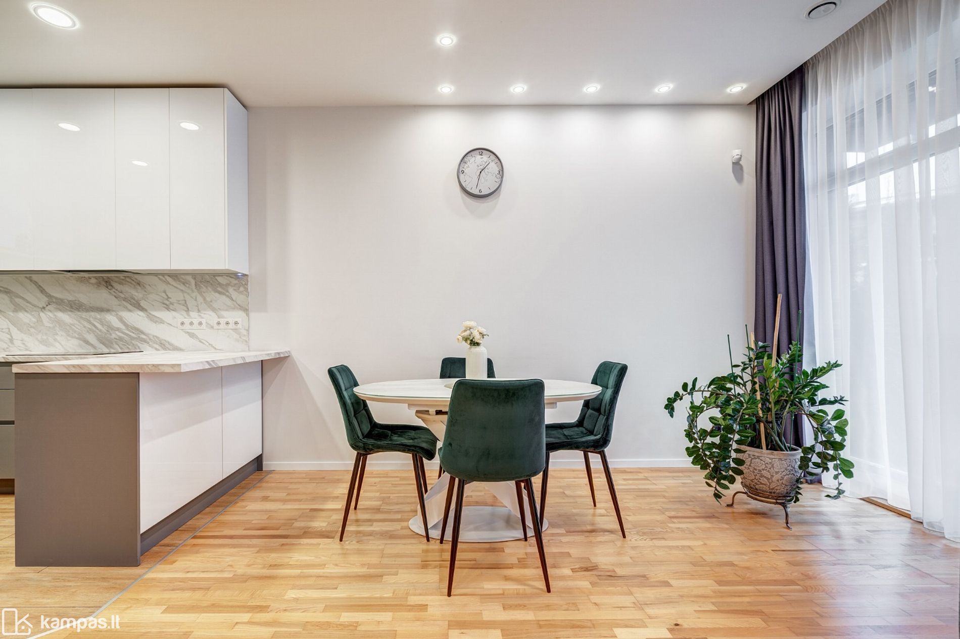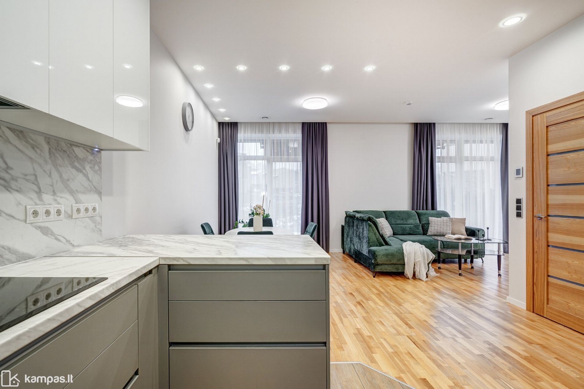 - Funkcionaliai ir patogiai suplanuotos erdvės: 3 miegamieji, virtuvė su svetaine kartu, 2 san.mazgai;
