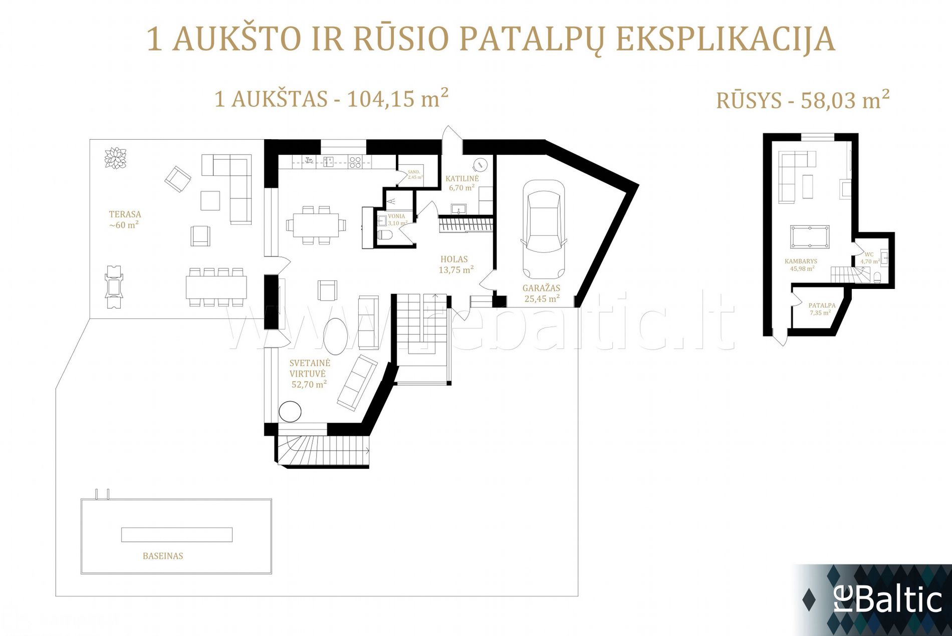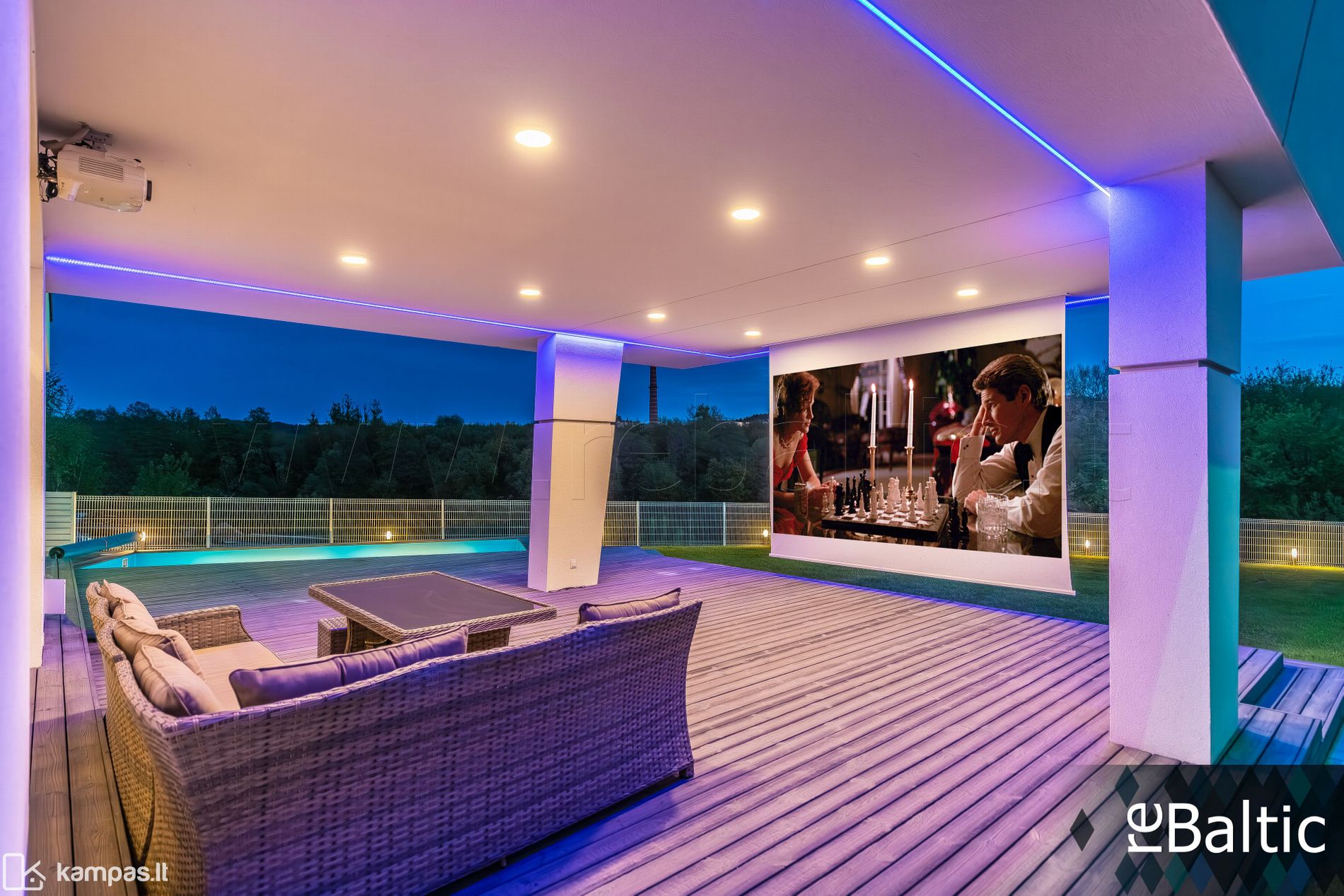 - Dvi didelės terasos - 150 kv.m pirmame aukšte, į ją patenkama iš svetainės, bei terasa antrame aukšte šalia pagrindinio miegamojo ir pirties erdvės. Antro aukšto 25 kv.m terasoje numatyta vieta burbulinei voniai.