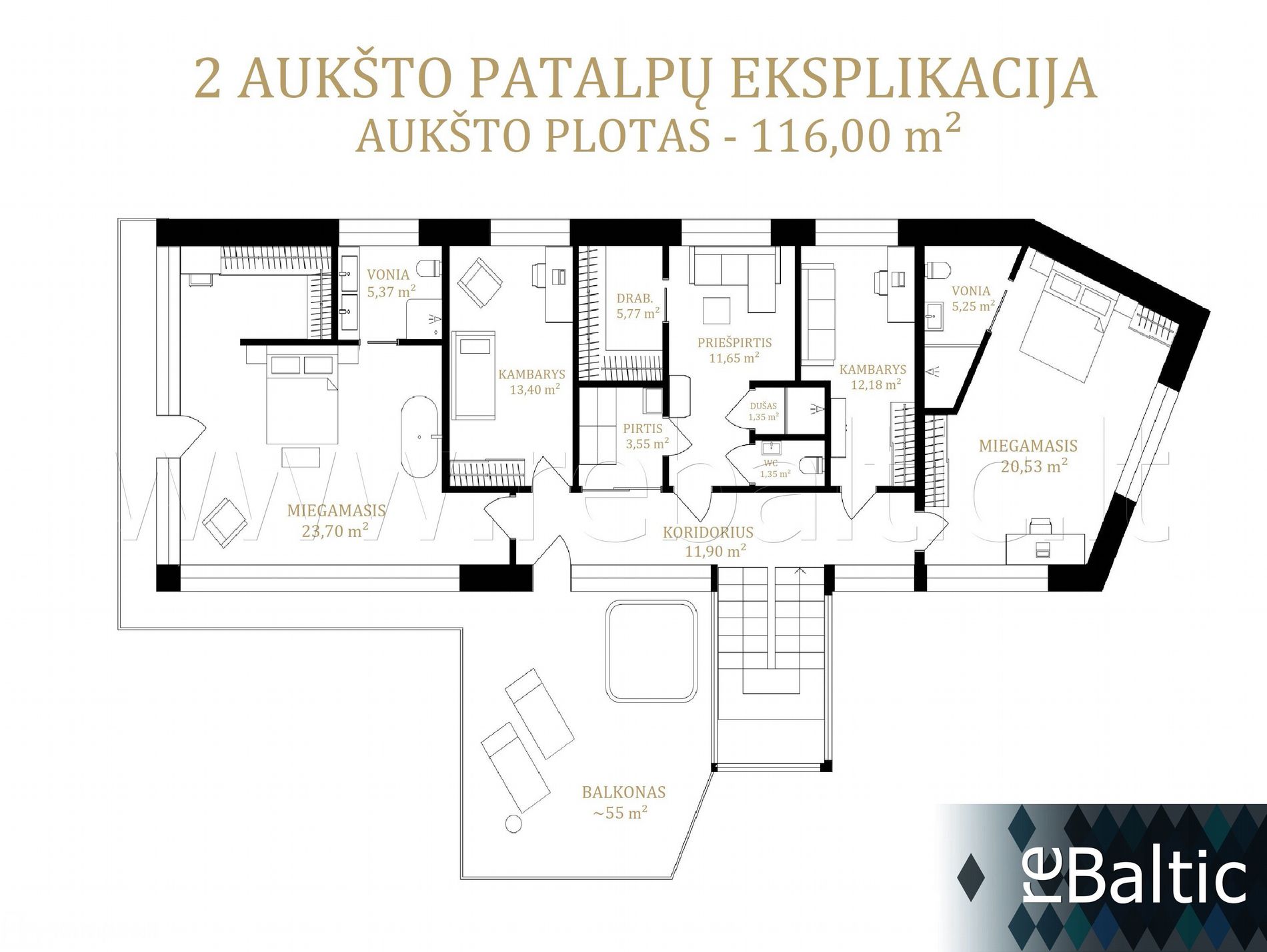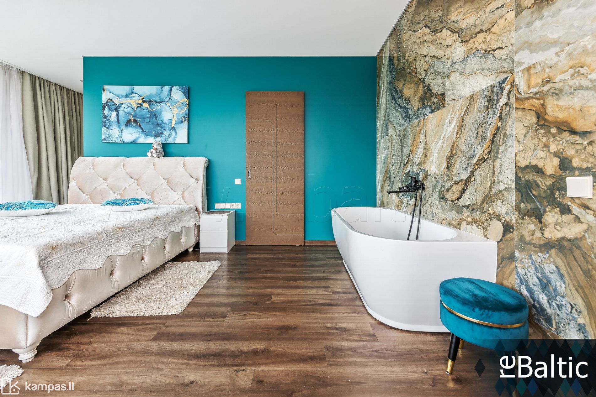 - Antrame aukšte pagrindinis miegamasis su nuosava vonia, drabužine ir balkonu. Išskirtiniai vaizdai pro didelius langus su mažai segmentų